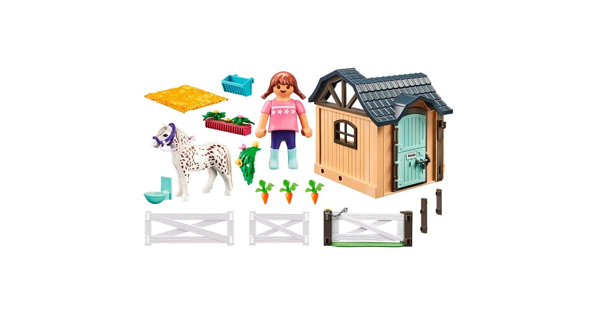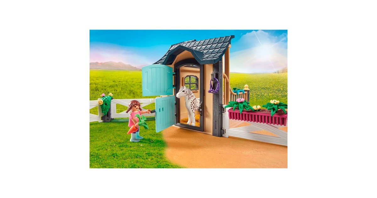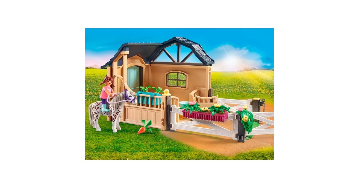Du brauchst mehr Platz für deine Pferde? Dann ist diese PLAYMOBIL-Reitstallerweiterung genau das Richtige. In der Pferdebox kann das Pony gepflegt und gefüttert werden und durch die Boxtür geht es hinaus in den Auslauf. Am schönsten für Mensch und Tier ist natürlich ein entspannter Ausritt an der frischen Luft. Die beiliegenden Blankoetiketten können mit dem Namen des Lieblingspferdes beschriftet und an die Stalltür geklebt werden. Dieses liebevoll gestaltete Pferde-Set enthält eine PLAYMOBIL-Figur, ein Pony, eine Reitstallerweiterung, Tränke, Blumenkasten und weitere tolle Extras. Stall- und Gattertür können geöffnet und verriegelt werden. Ein tolles Ergänzungsset für Pferdefans ab 4 Jahren.