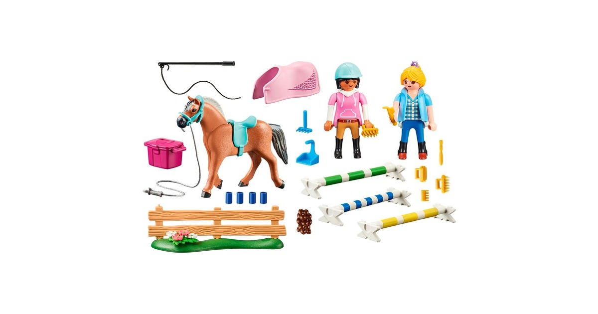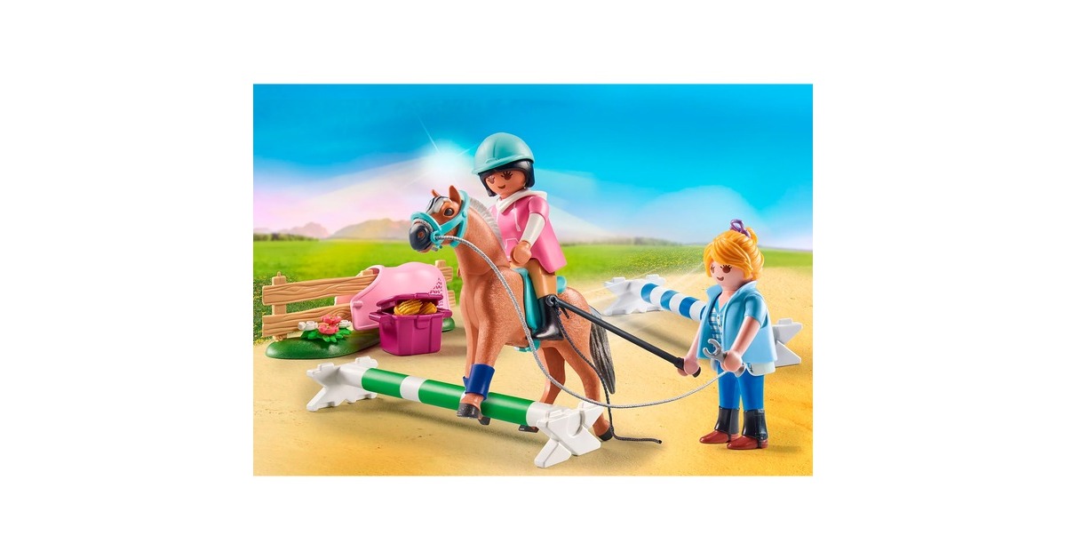 Figuren: 1 Reiterin, 1 Reitlehrerin; Tiere: Pferd; Zubehör: 3 Cavaletti, 1 Zaun, 1 Blumenwiese, 1 Pferdedecke, 1 Sattel, 1 Halfter, 1 Zügel, 1 Rechen, 1 Schaufel, 1 Pferdeäpfel, 1 Aufbewahrungsbox, 1 Striegelkammset, 1 Reiterhelm, 1 Peitsche, 1 Ranke, 4 Bandagen |