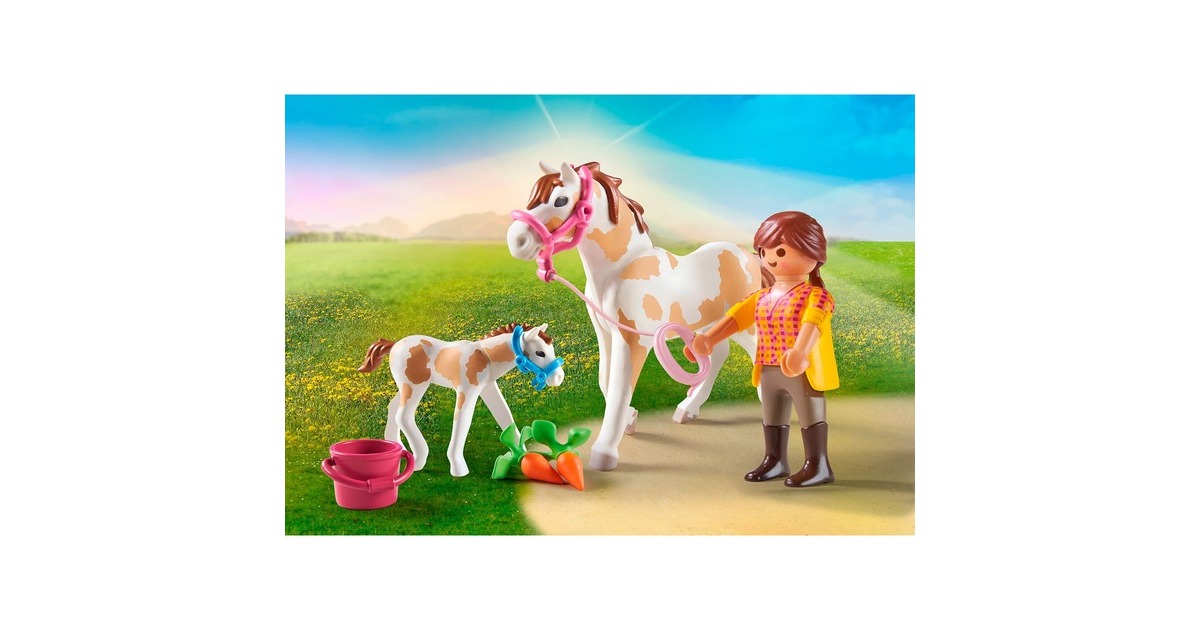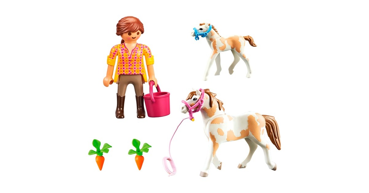 Figuren: 1 Frau; Tiere: 1 Pferd, 1 Fohlen; Zubehör: 2 Halfter, 1 Zügel, 1 Eimer, 2 Karotten |