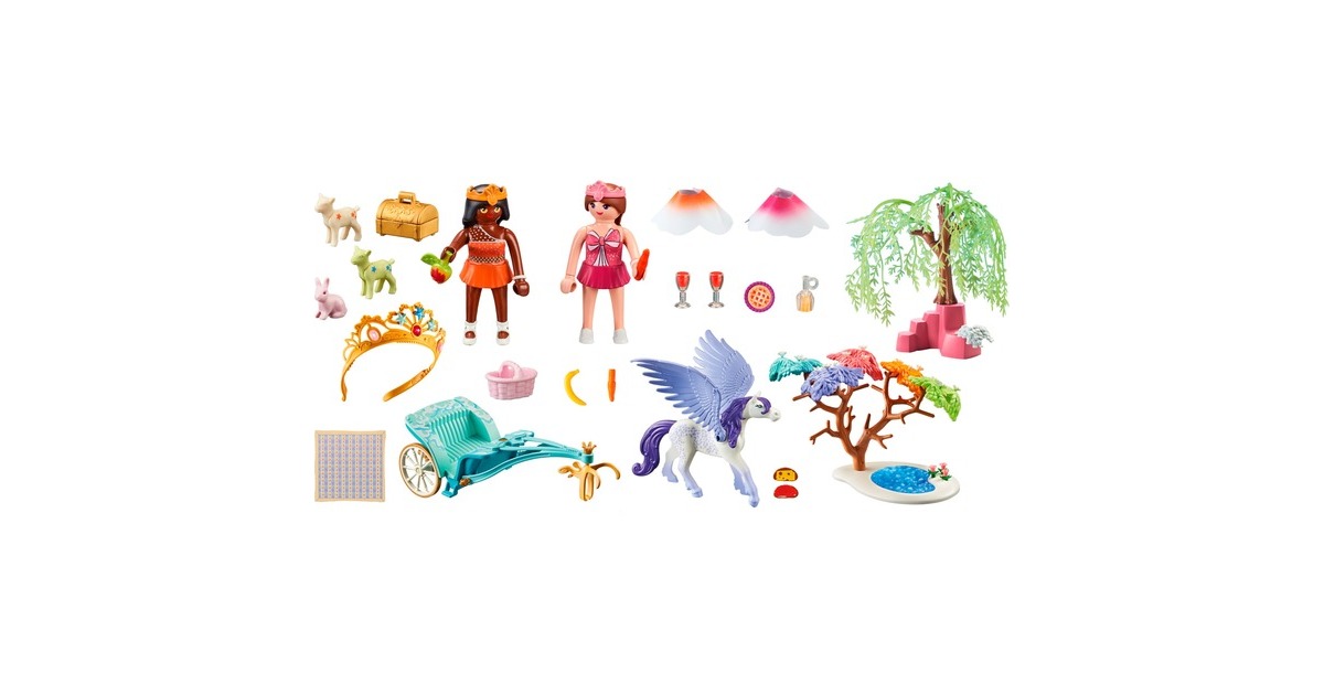 Figuren: 2 Regenbogenprinzessinnen Tiere: 1 Pegasus, 1 Hase, 2 Zicklein Zubehör: 1 Pegasuskutsche mit Deichsel, Kummet und Krönchen, 1 Regenbogenbaum mit Blüten und Teich, 1 Regenbogenweide, 1 Schatztruhe, 1 Silikongurt, 1 Picknickdecke, 1 Picknickkorb, 1 Kuchen, 1 Banane, 1 Apfel, 2 Karotten, 2 Gläser, 1 Flasche, 2 Brotscheiben, 2 Wolkenröckchen, 2 Unterröcke, 2 Clips, 2 Diademe, 3 Armbänder, 1 großes Kinderdiadem |