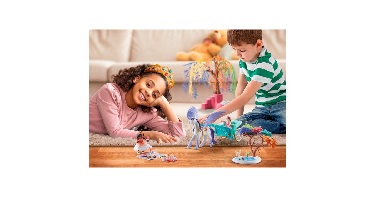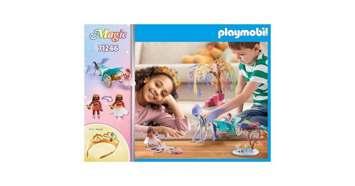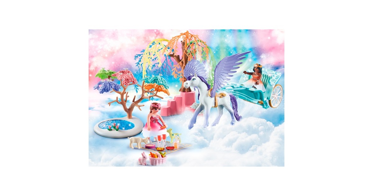 Die Regenbogenprinzessinnen reisen mit der Pegasuskutsche durch den Himmel, um sich ein schönes Fleckchen für ein magisches Picknick in den Wolken zu suchen. Passend zum Anlass tragen sie süße, leichte Wolkenröckchen. Auf zu magischen Abenteuern mit dem zauberhaften PLAYMOBIL-Spielset Picknick mit Pegasuskutsche. In ihrer glitzernden Pegasuskutsche unternehmen die beiden Prinzessinnen einen himmlischen Ausflug in die Wolken. Neben ihrem geliebten Pegasus haben sie als weitere tierische Begleiter ein Kaninchen und zwei niedliche Zicklein dabei. Natürlich darf für ein gemütliches Picknick auch leckere Verpflegung nicht fehlen. Mit Kuchen, Obst und erfrischenden Getränken ist für das leibliche Wohl bestens gesorgt. Die Spielsets der PLAYMOBIL Magic Reihe laden mit liebevollen Charakteren, süßen Tieren und bezaubernden Accessoires dazu ein, der Fantasie freien Lauf zu lassen und in magische Rollenspiele einzutauchen. Kreativer Spielspaß für Kinder ab 4 Jahren. Produktdetails: Das 101-teilige Prinzessinnen-Spielzeug enthält zwei PLAYMOBIL-Figuren, einen Pegasus, ein Kaninchen, zwei Zicklein, eine Pegasuskutsche, einen Regenbogenbaum mit Blüten und Teich, einen Picknickkorb und viele weitere zauberhafte Extras. Das Schmuckkästchen kann am Heck der Kutsche befestigt werden. Die neuen flexiblen Röcke aus Vlies können den Figuren an- und ausgezogen werden. Beide Prinzessinnen können auch mit Röcken in der Kutsche sitzen. Als süßer Haarschmuck für Kinder liegt dem Spielset ein goldenes Diadem mit Schmucksteinen und Sternen bei.Art.-Nr.: 1888906