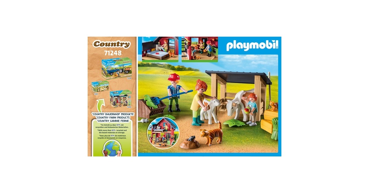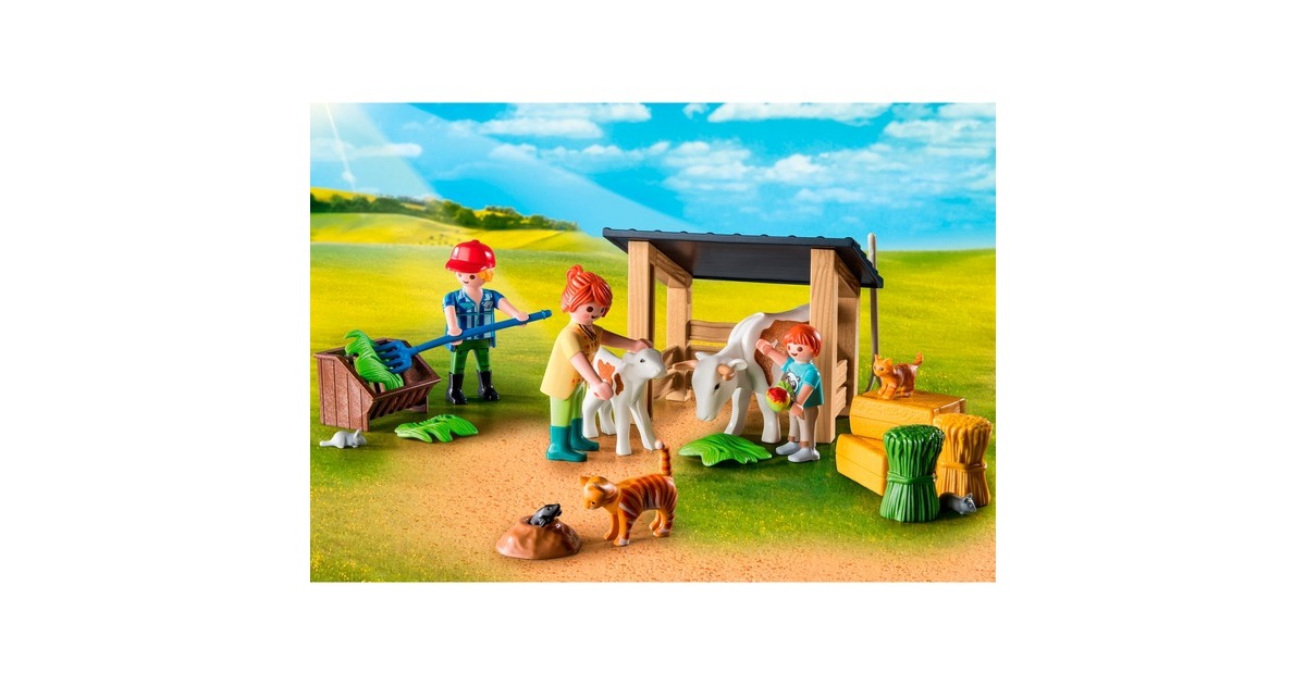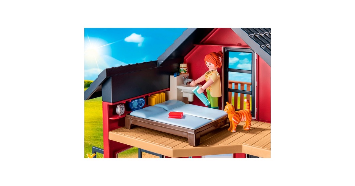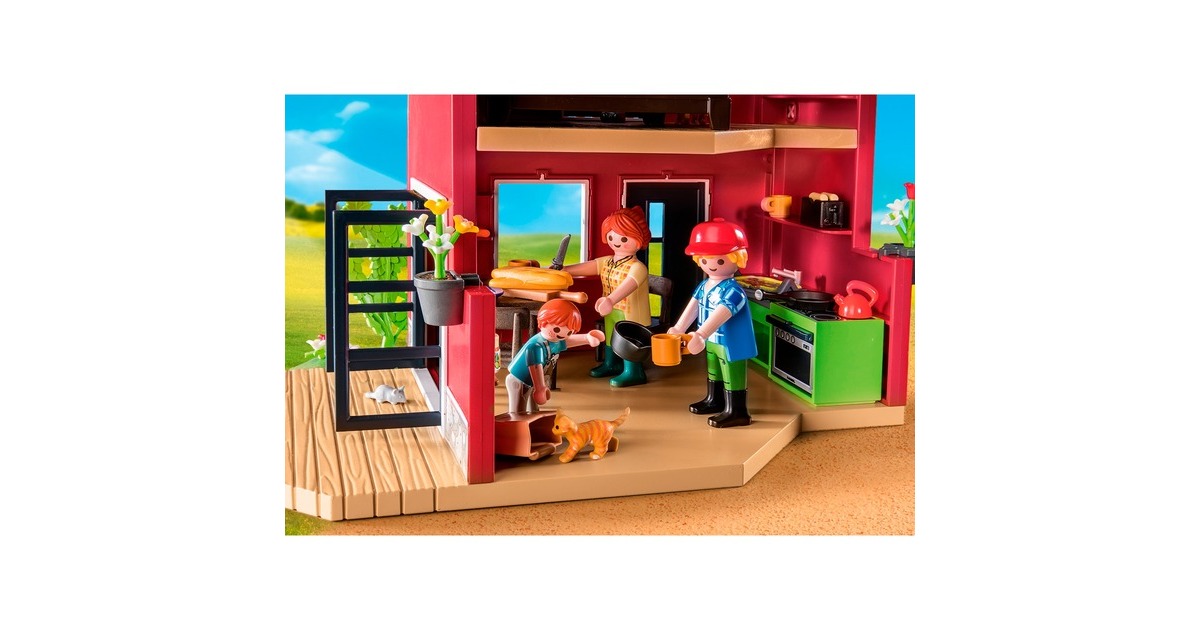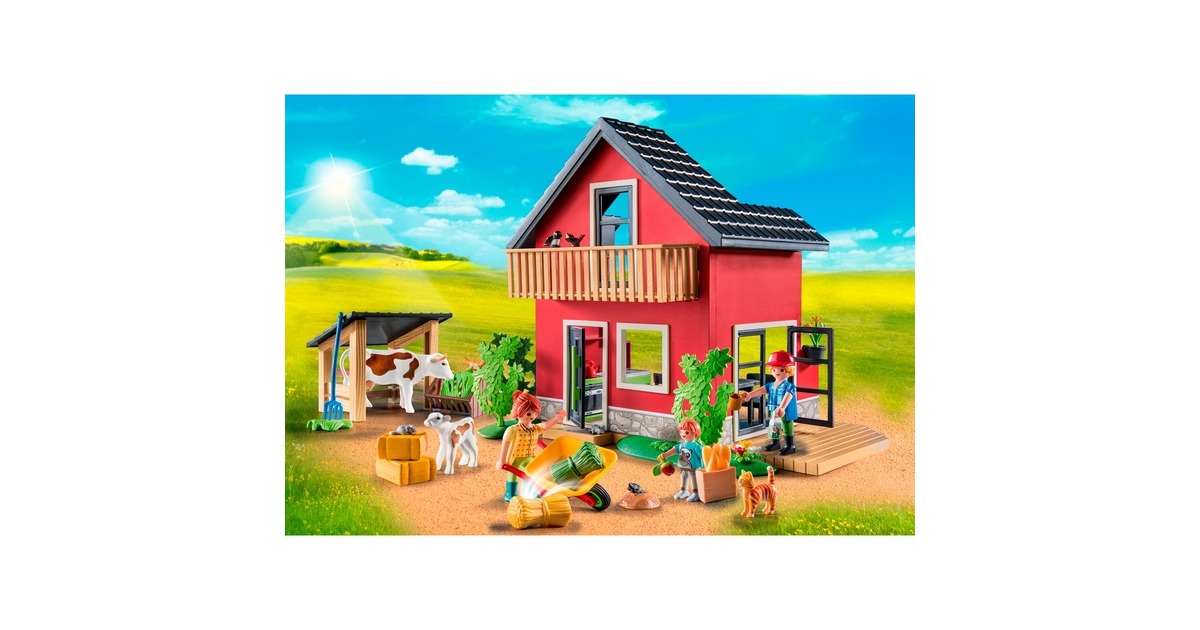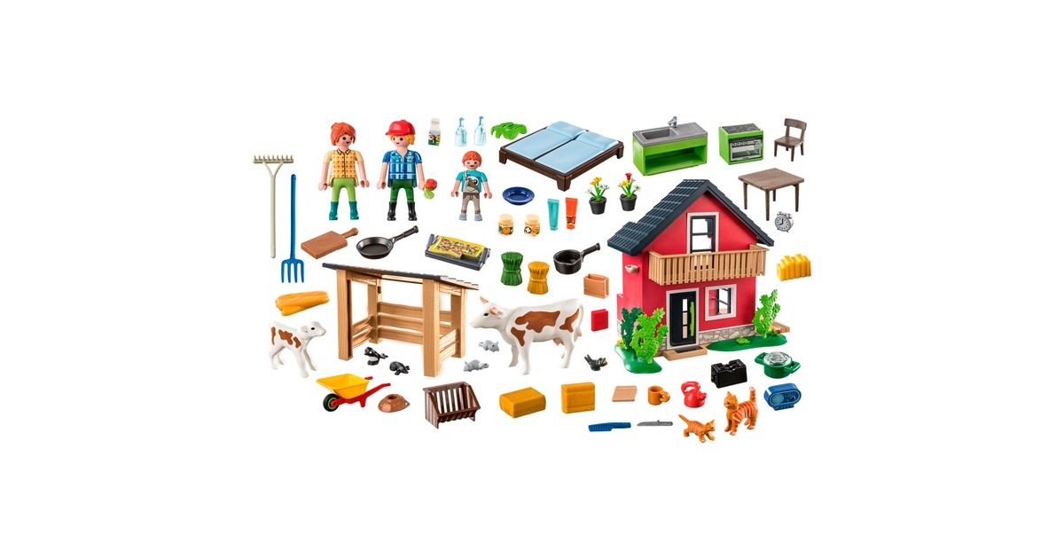 | Inhalt/Ausstattung | Figuren: 1 Frau, 1 Mann, 1 Junge; Tiere: 1 Katze, 1 Kitten, 1 Kuh, 1 Kalb, 2 Vögel, 2 Mäuse, 1 Maulwurf; Zubehör: 1 Bauernhaus m. Grünanteil, 1 Unterstand, 1 Herd, 1 Spülbecken, 2 Stühle, 1 Tisch, 1 Messer, 1 Wecker, 3 Tassen, 1 Bürste, 1 Milch, 2 Flaschen, 3 Grünfutter, 1 Doppelbett, 2 Töpfe, 1 Teekanne, 1 Radio, 1 Rechen, 1 Heugabel, 1 Pfanne, 1 Kuchenblech, 3 Teller, 2 Schraubgläser, 2 Tuben, 2 Topfpflanzen, 1 Buch, 3 Bretter, 1 Futterraufe, 2 Strohballen, 1 Toaster, 1 Schubkarre, 1 Maulwurfhügel, 1 Papiertüte, 1 Baguettes, 1 Strohbündel, 1 Grasbündel |