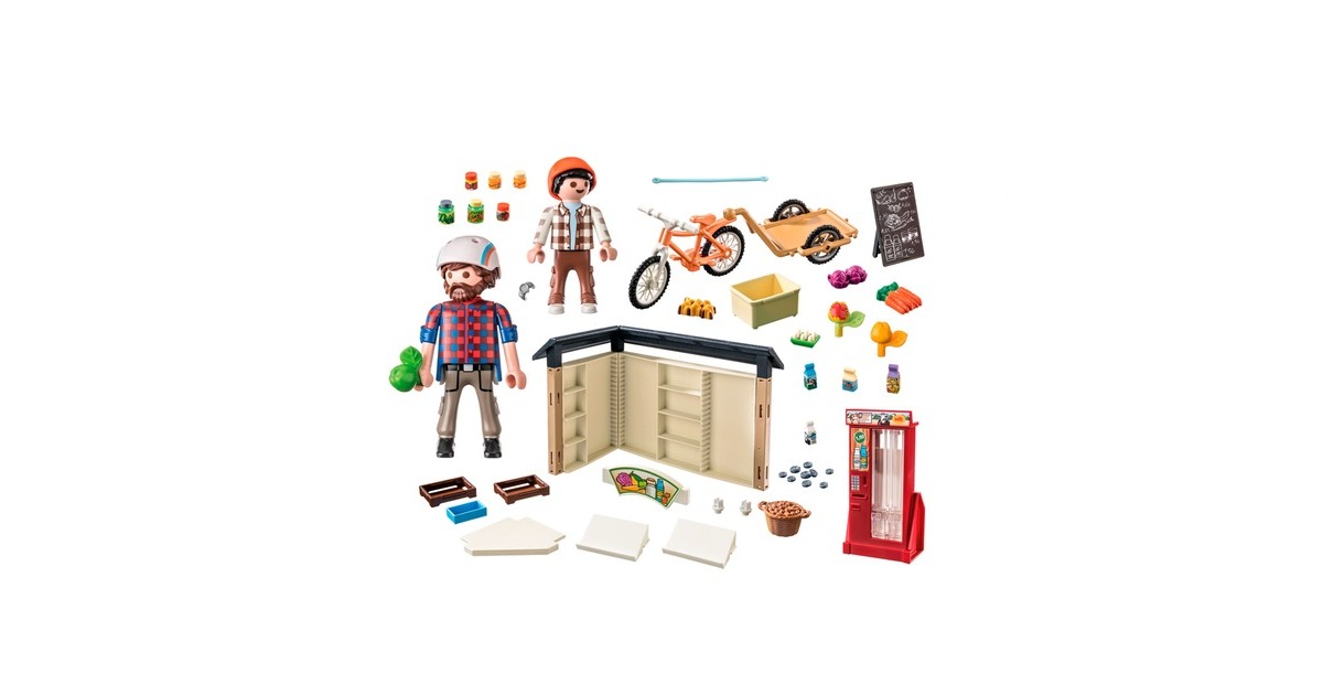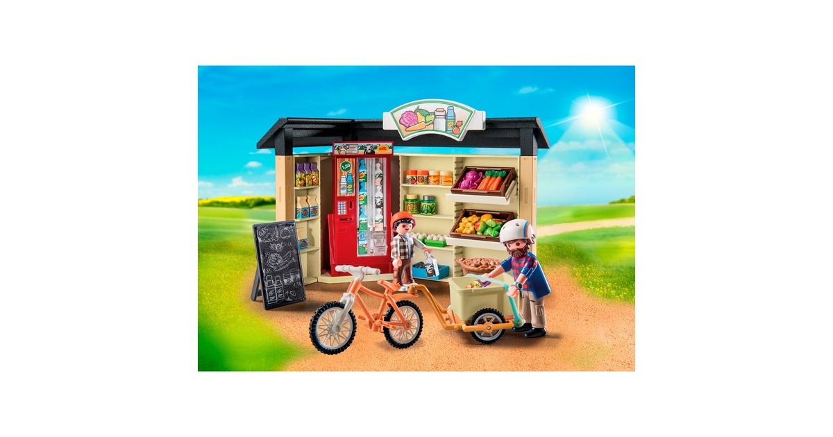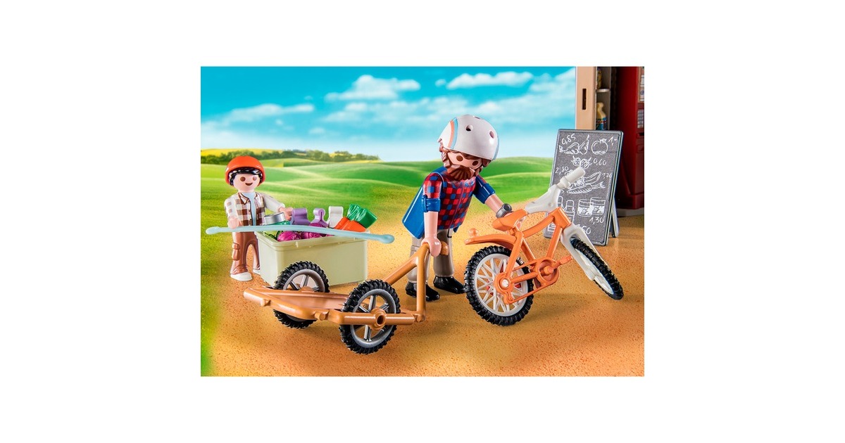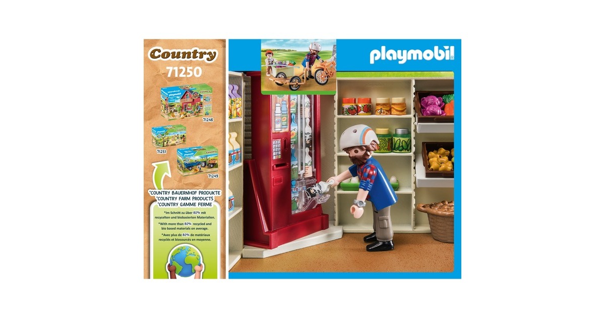 Figuren: 1 Mann, 1 Junge; Zubehör: 1 24h-Hofladen, 1 Milchautomat,1 Fahrrad m. Anhänger, 1 Fahrradhelm, 1 Kinderfahrradhelm, 2 Erdbeermarmeladen, 2 Honig, 1 Gewürzgurken, 1 eingeletes Gemüse, 2 6er-Eier, 1 Kartoffelkorb, 8 Milch, 4 Apfelsaft, 3 Kuchenbackmischungen, 1 Angebotstafel, 3 Kisten, 1 Rotkohl, 1 Karotten, 1 Äpfel |