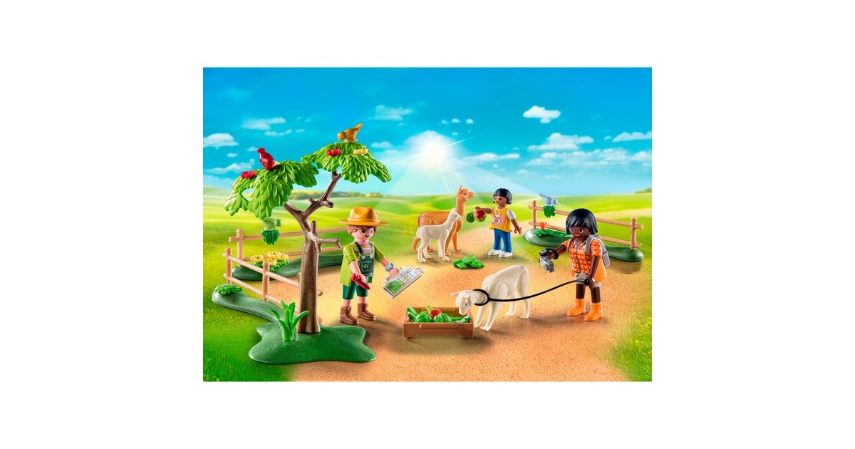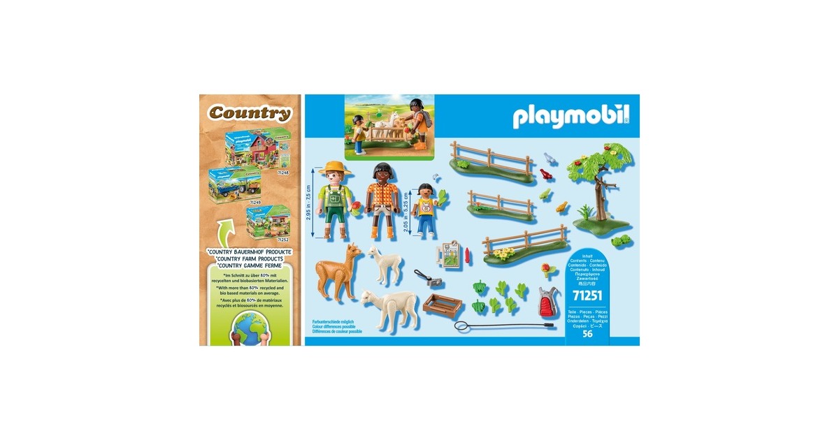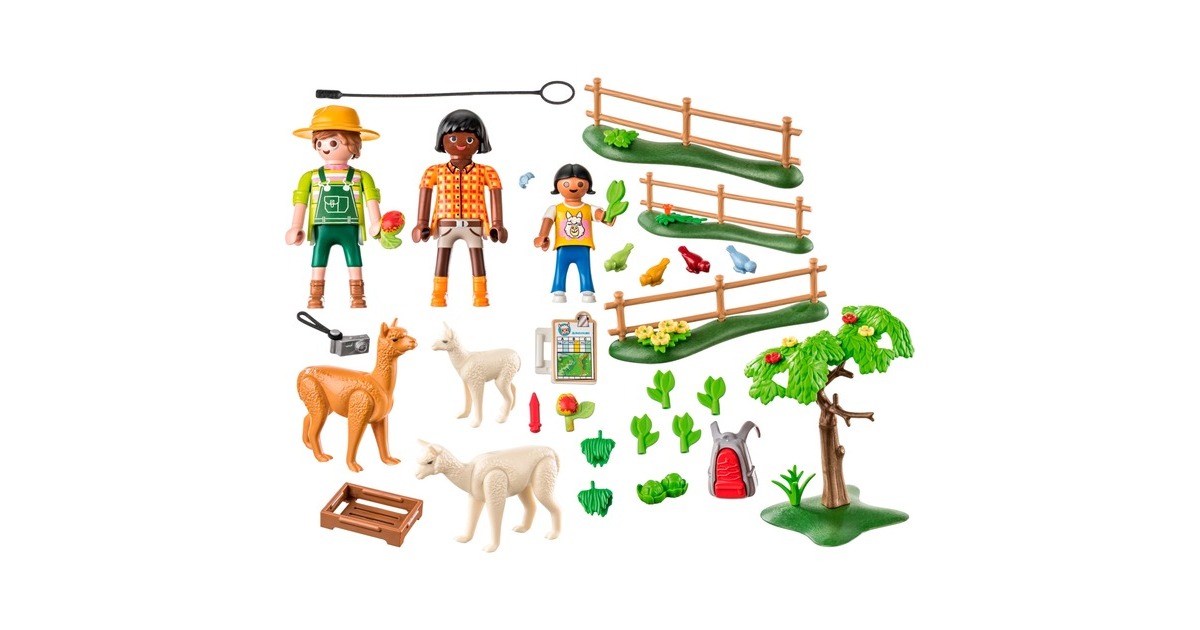 Figuren: 1 Frau, 1 Mann, 1 Mädchen; Tiere: 2 Alpakas, 2 Alpakababy, 3 Vögel; Zubehör: 1 Baum, 1 Zaun m. Grünwiese, 1 Grünpflanze, 1 Kiste, 1 Salat, 1 Apfel, 1 Grünfutter |