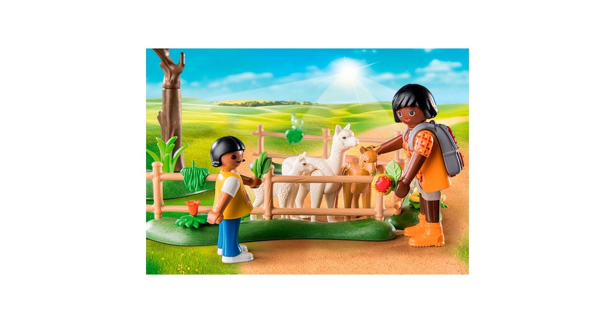 Eine Wanderung mit Alpakas ist ein ganz besonderes Erlebnis. Die flauschigen Tiere ganz aus der Nähe zu beobachten und zu streicheln macht Kindern und Erwachsenen Riesenspaß. Gleichzeitig gibt es auch viel wissenswertes über Ernährung und Lebensweise dieser faszinierenden Tiere zu erfahren. Ein tolles Geschenk oder Mitbringsel für tierliebe Kinder ab 4 Jahren. Das 56-teilige PLAYMOBIL-Set enthält drei Spielzeugfiguren, zwei Alpakas und zwei Crias (Jungtiere), Salat, Apfel, Futter und weitere Extras für eine lustige Alpaka-Wanderung. Die PLAYMOBIL Bauernhof-Spielwelt inspiriert mit authentischen Details zum fantasievollen Rollenspiel und hilft Kindern wichtige Fähigkeiten und Selbstvertrauen zu entwickeln. Gut für die Umwelt: Alle Spielsets der neuen Bauernhof-Welt bestehen zu mehr als 80 % aus nachhaltigen Materialien.