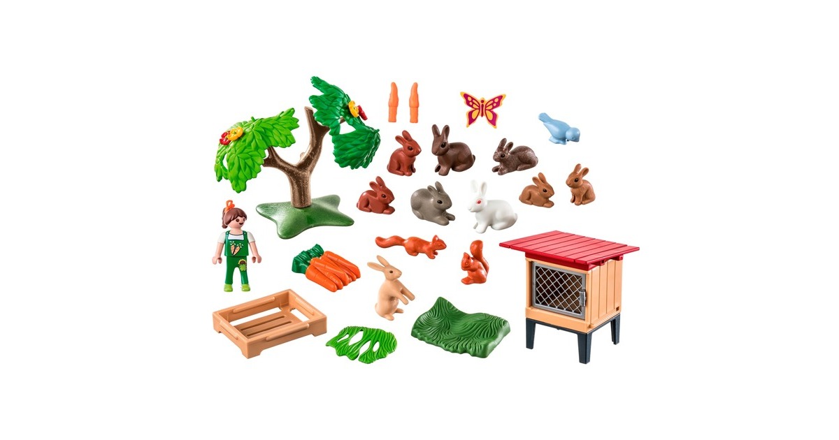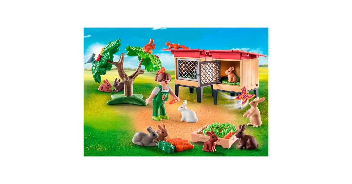 Figuren: 1 Mädchen; Tiere: 9 Kanninchen, 2 Eichhörnchen, 1 Schmetterling, 1 Taube; Zubehör: 2 Kaninchenstall, 1 Grünfutter, 2 Grüneinlage, 1 Karotte, 2 einz. Karotten |
