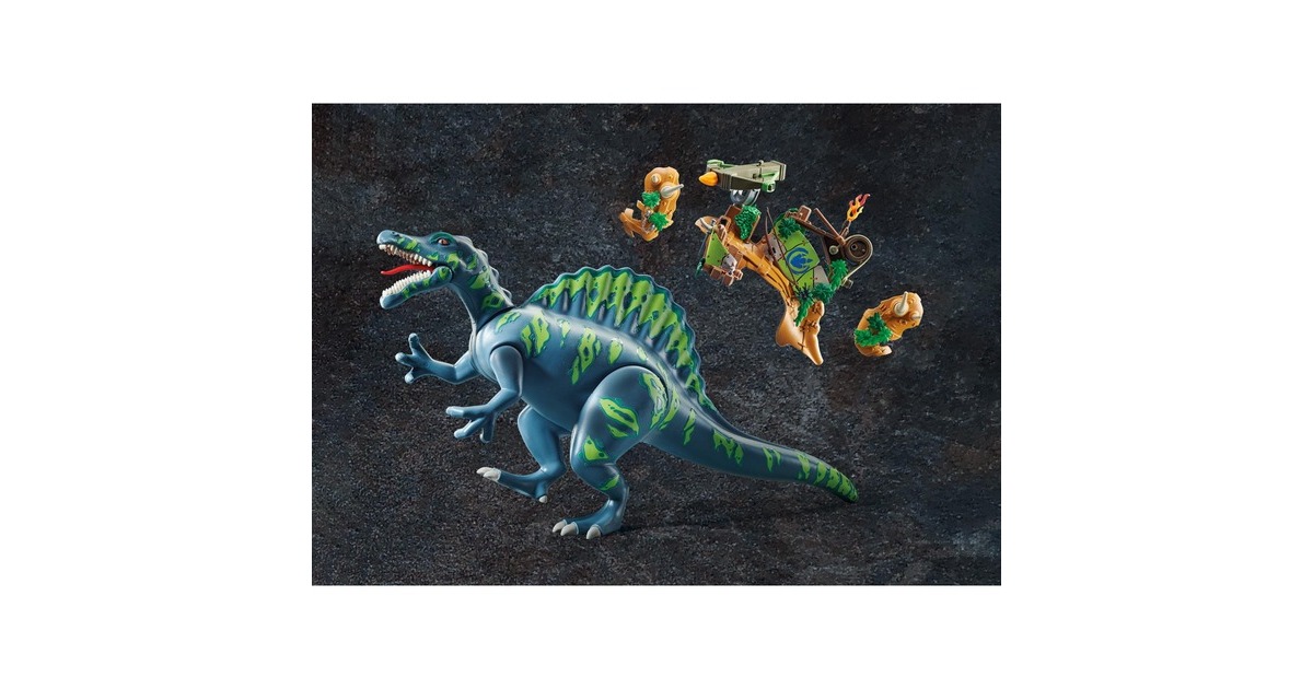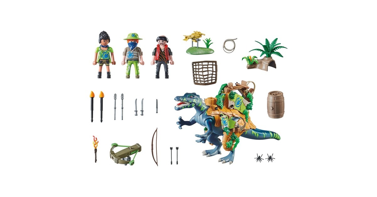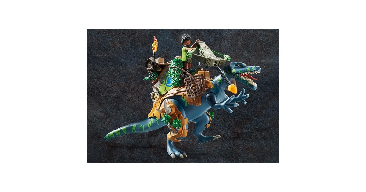 Ein spannendes Dino-Abenteuer aus der Welt von PLAYMOBIL Dino Rise! Diese Spielwelt liefert mit originellen Charakteren, eindrucksvollen Dinosauriern und raffinierten Rüstungen jede Menge Stoff für actionreiche Spielabenteuer im Kinderzimmer. Gemeinsam mit ihrem bestens gerüsteten Spinosaurus haben Ayla und Samu gleich die doppelte Verteidigungspower. Mutig stellt sich dieses Trio jeder Herausforderung. Von ihrem Sitzplatz auf dem Rücken des Dinos kann Ayla die Bolzenkanone bedienen und sich gegen den Schurken mit seiner Standkanone zur Wehr setzen. Samu hat sich auf dem Stehplatz an der Seite positioniert und macht sich bereit, mit dem Lasso ins Geschehen einzugreifen.Art.-Nr.: 1889013