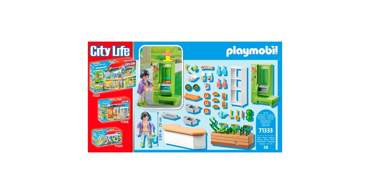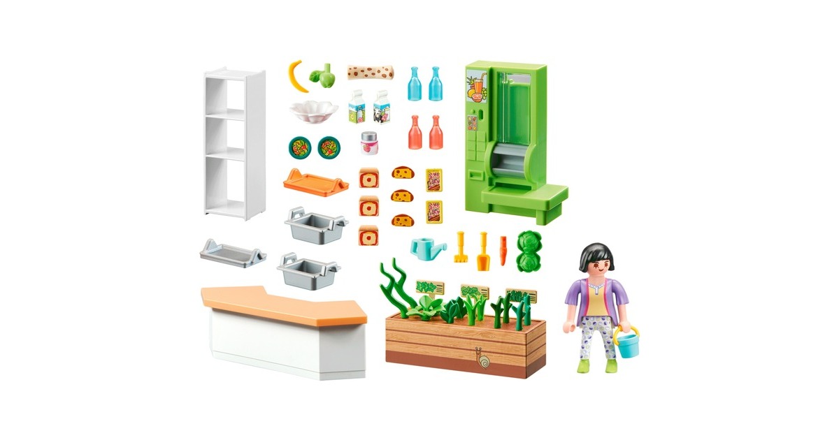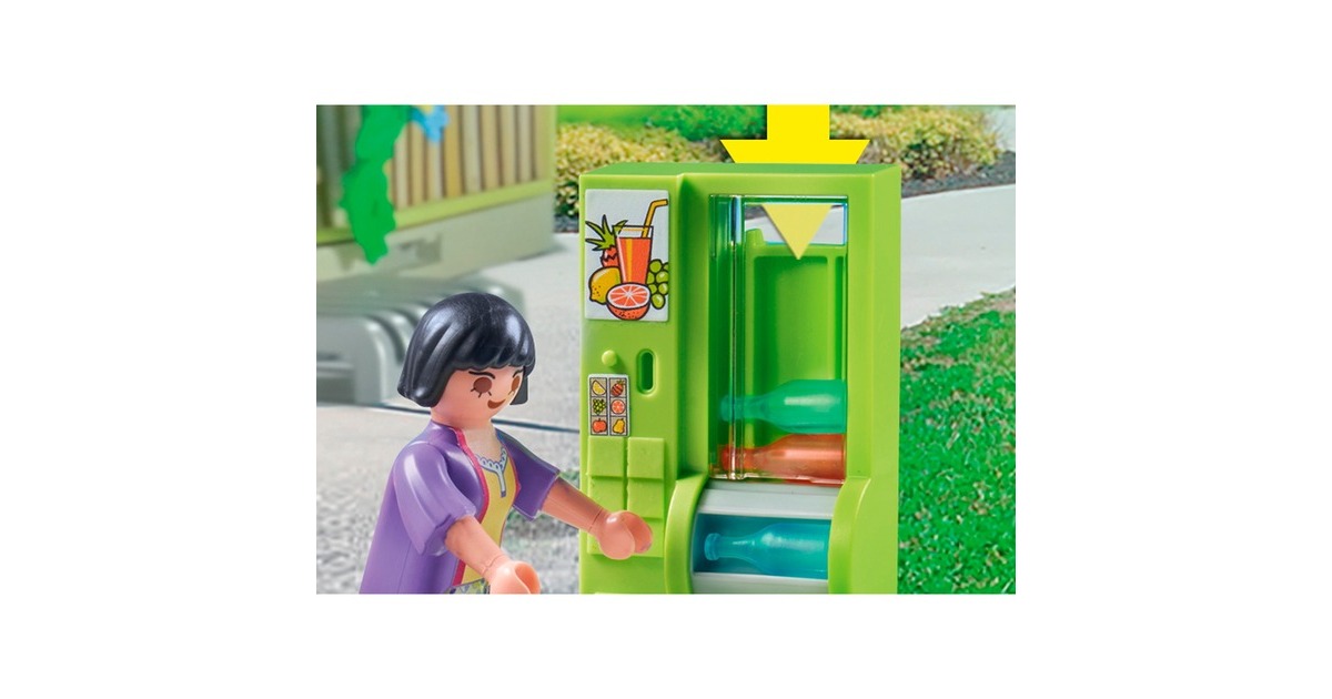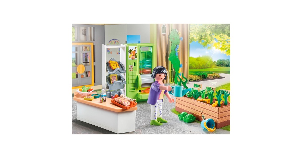 Dieser Schulkiosk hat alles, was das Schülerherz begehrt. Verschiedene Speisen, einen funktionstüchtigen Getränkeautomaten mit Flaschen, eine Verkaufstheke und ein Regal zum Verstauen der zu verkaufenden Ware. Im Hochbeet kann die Verkäuferin frische Zutaten für ihre Produkte pflanzen. So sind die Kinder in der Schule von PLAYMOBIL City stehts gut versorgt! Art.-Nr.: 1889138