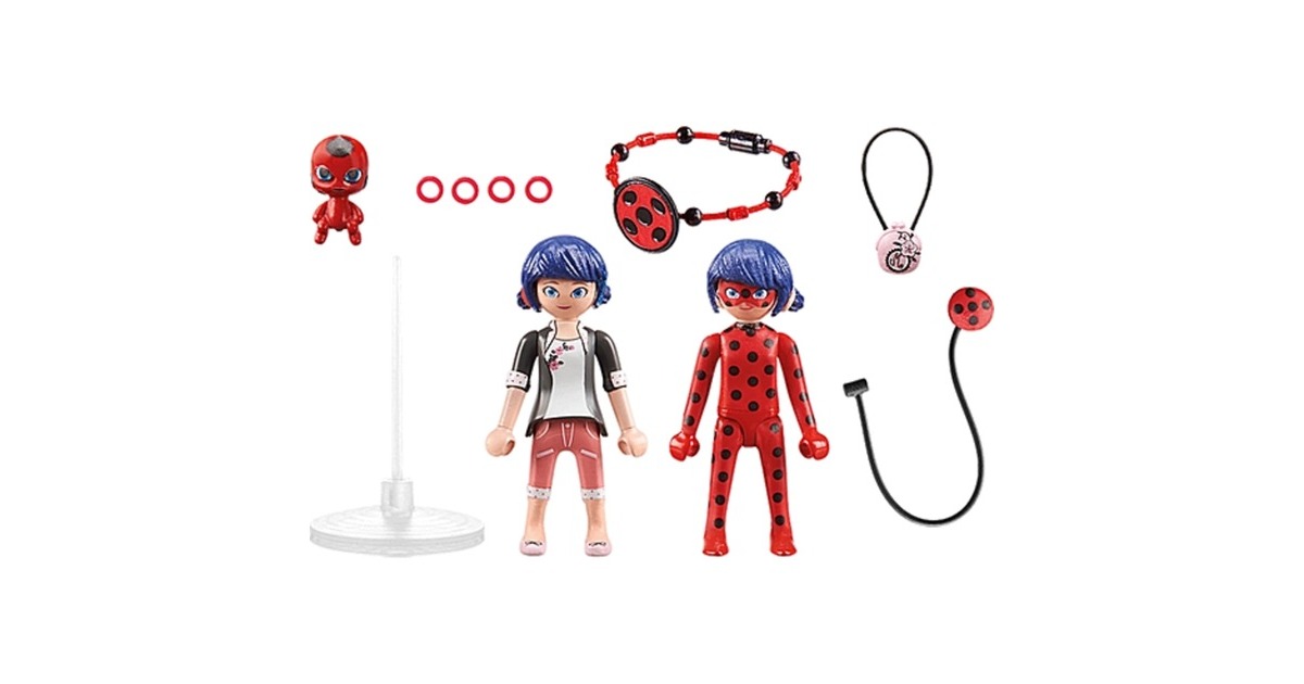 Mit den PLAYMOBIL-Sets der Serie Miraculous wird die zauberhafte Welt der Serie rund um die Superheldin Marinette lebendig! Mit diesem Set lässt sich die Hauptfigur Marinette in zwei Varianten erleben: Als Marinette und als Superheldin Ladybug. Unterstützt wird sie dabei von ihrem Kwami Tikki, das auf der Spitze des Ständers befestigt werden kann. Das Set enthält auch ein Armband für Kinder, an dem ein Logo-Anhänger befestigt werden kann. Mit insgesamt sieben verschiedenen Charms kann eine tolle Sammlung mit den Lieblingscharakteren aus der Serie erstellt werden. Art.-Nr.: 100035550