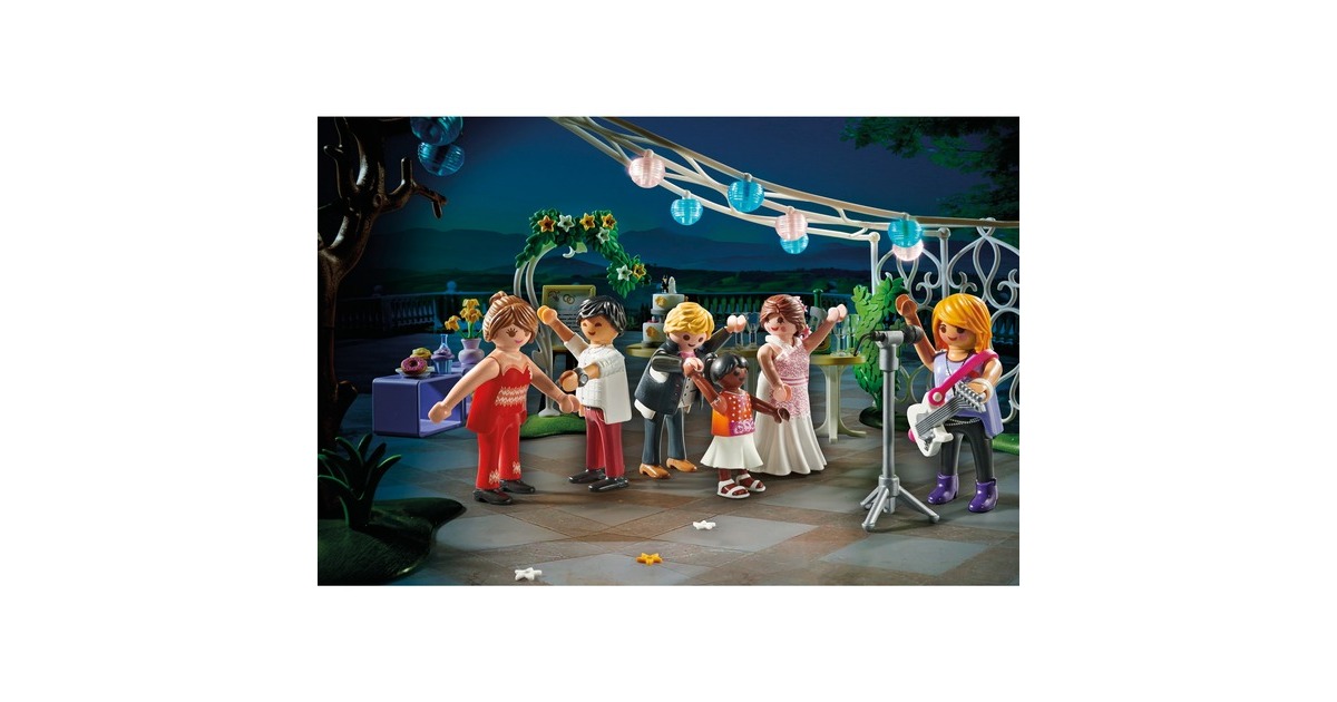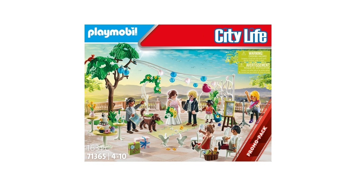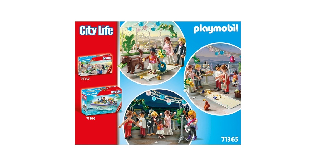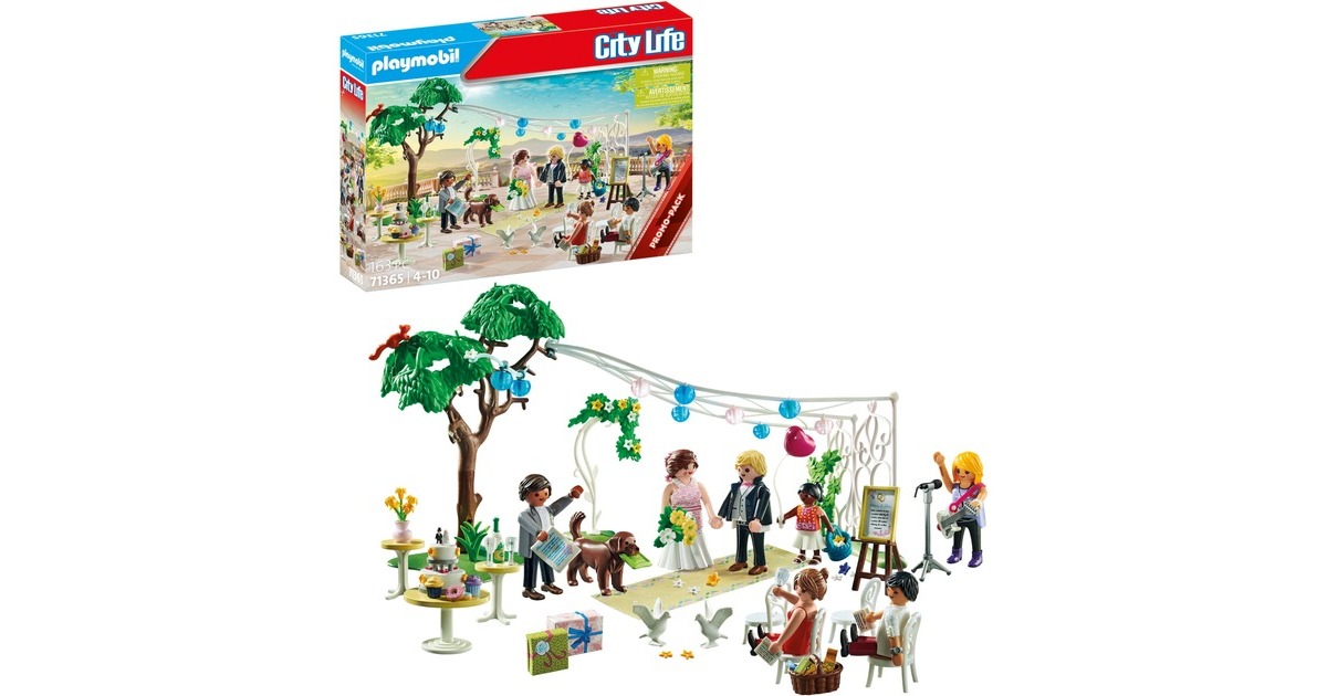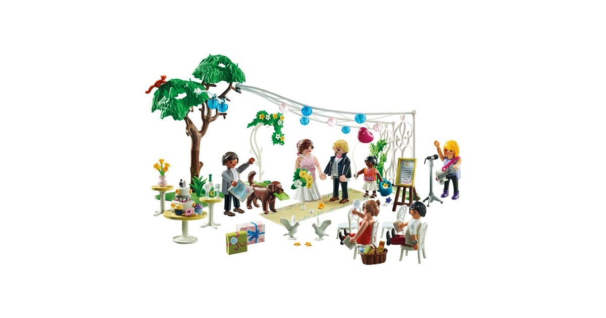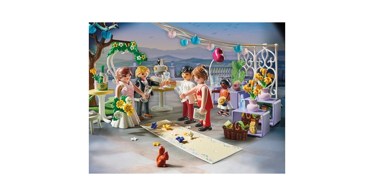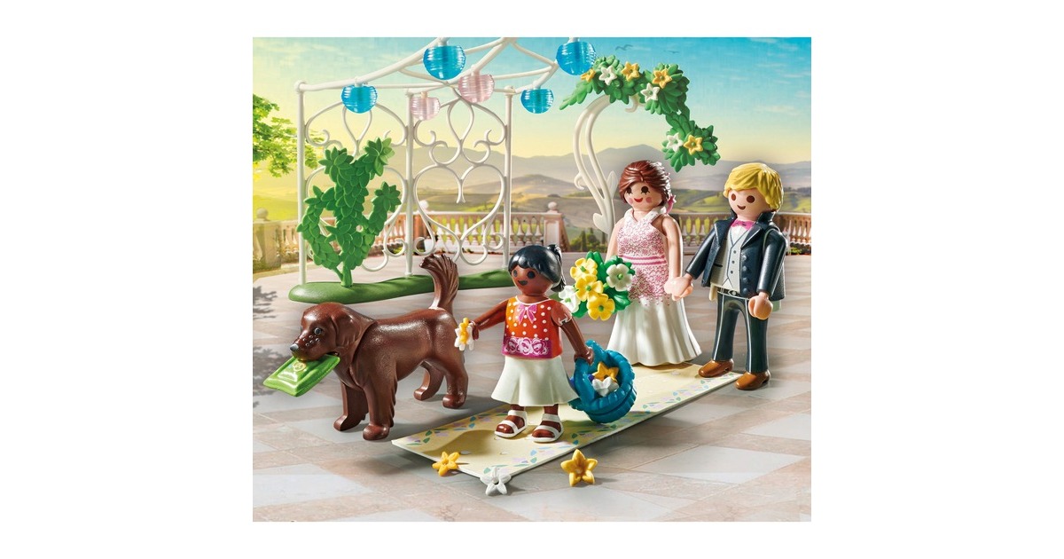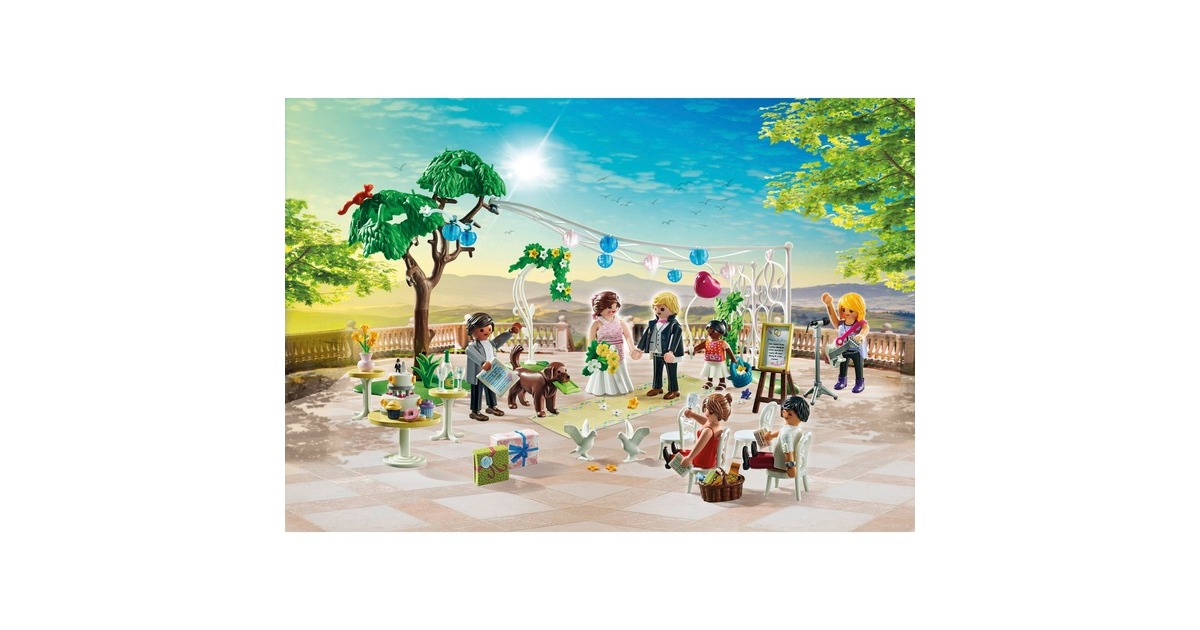 Auf diesen Tag hat sich das verliebte Paar monatelang gefreut: Endlich findet ihre Trauung unter freiem Himmel statt. Das Paar schreitet zu den romantischen Längen der Musikerin nach vorne, wo der Standesbeamte von PLAYMOBIL City bereits wartet, um die beiden zu trauen. Als Ringträger wurde der Hund gewählt, der schwanzwedelnd das Ringkissen im Maul trägt. Nach der Trauung freuen sich das Paar und die Gäste auf die leckere Hochzeitstorte, Muffins und eine kühle Erfrischung. Und dann wird unter den Girlanden mit Lampions bis in die Nacht gefeiert!Art.-Nr.: 1888864