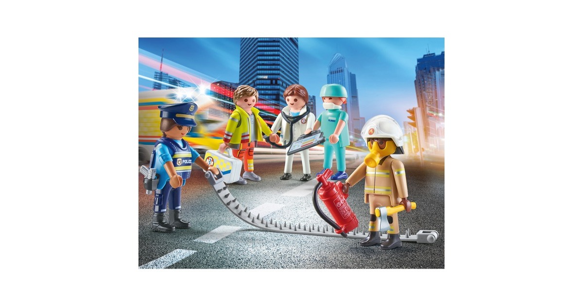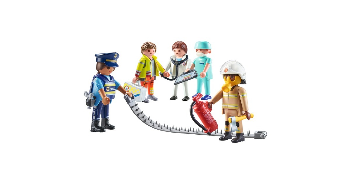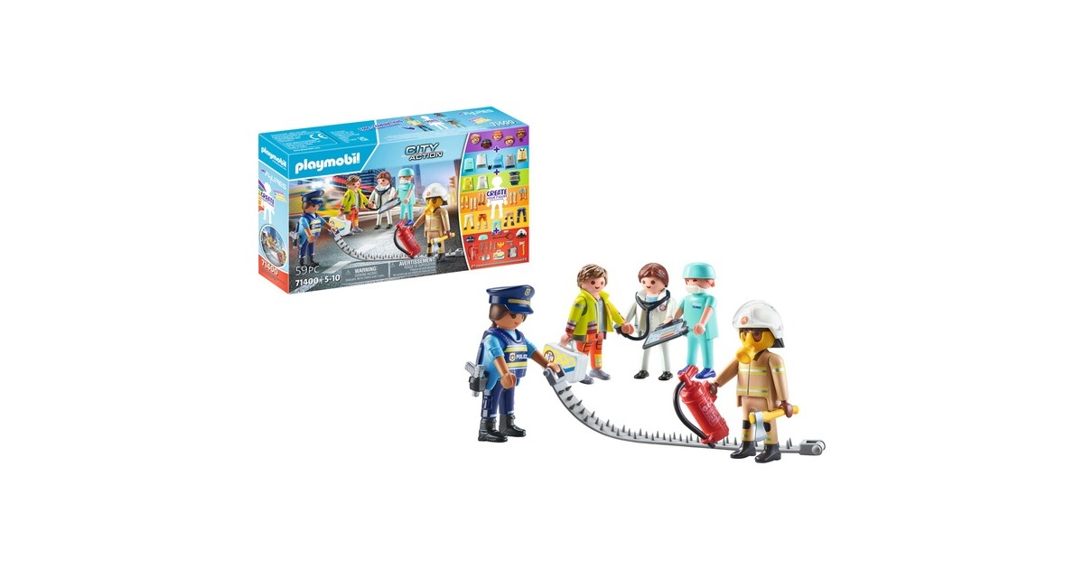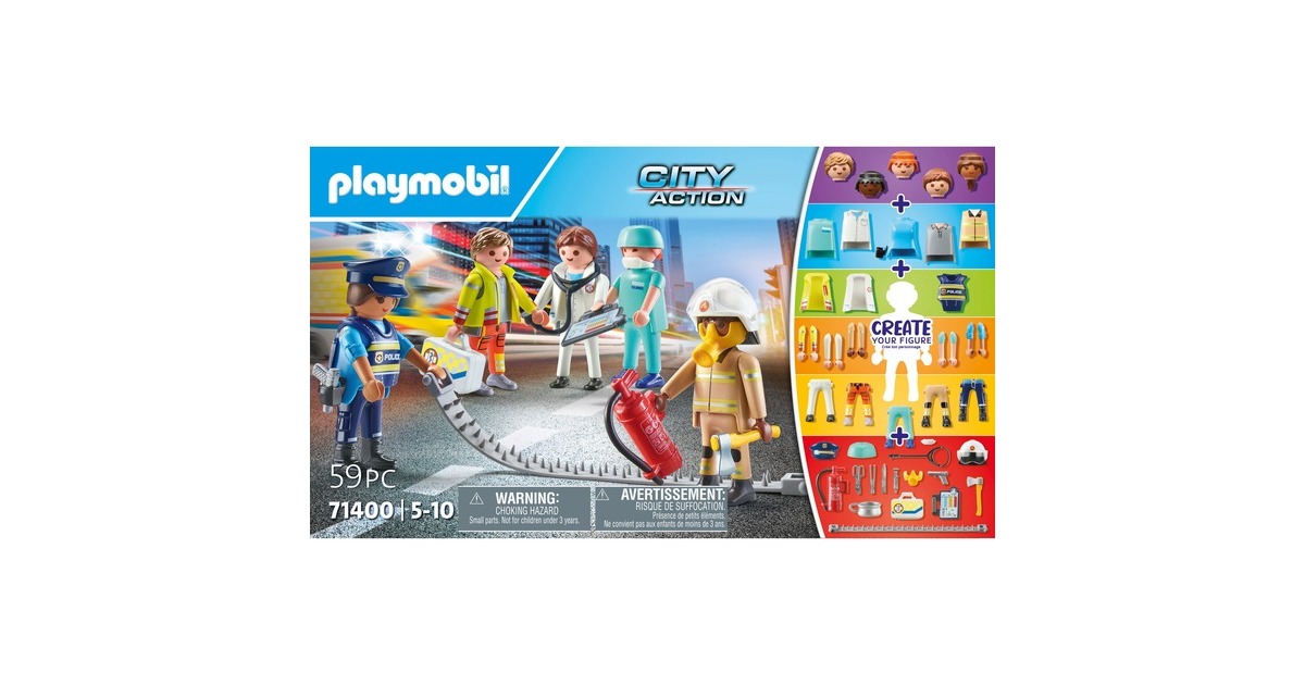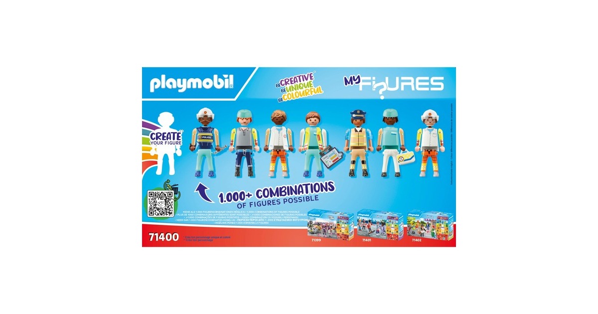 Mit My Figures von PLAYMOBIL können Kinder jetzt eine Welt ganz nach ihren Vorstellungen erschaffen und dabei ihre Kreativität entfalten. Jedes Set enthält Figuren in Einzelteilen, welche immer wieder neu zusammengestellt werden können. Arme, Beine, Körper und Accessoires sind ganz schnell getauscht und ergeben Spielfiguren, die so bunt sind wie das Leben - mit jeder Menge Kombinationsmöglichkeiten. Dieses Set enthält fünf Einsatzkräfte-Figuren aus der Welt von PLAYMOBIL City Action: Eine Polizistin, die mit Pistole und Nagelbrett jeden Bösewicht stoppt, drei medizinische Einsatzkräfte mit Notarzt, Arzt- und OP-Outfit sowie einen Feuerwehrmann mit Gasmaske und Feuerlöscher. Oder aber auch ganz andere Personen aus dem städtischen Leben - hier kann ganz nach Belieben kombiniert werden!Art.-Nr.: 1889178