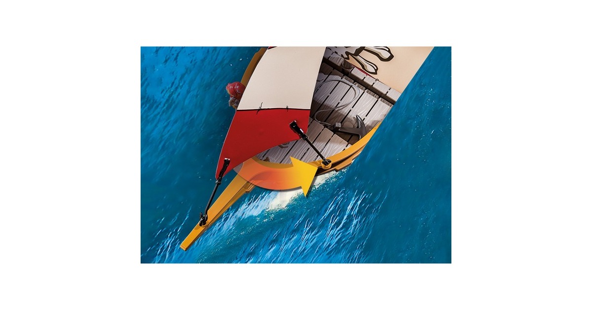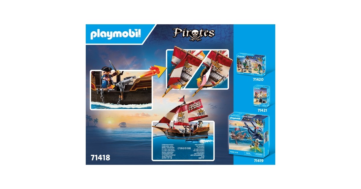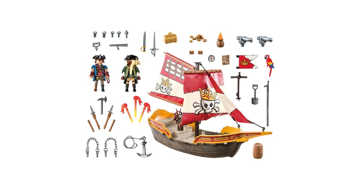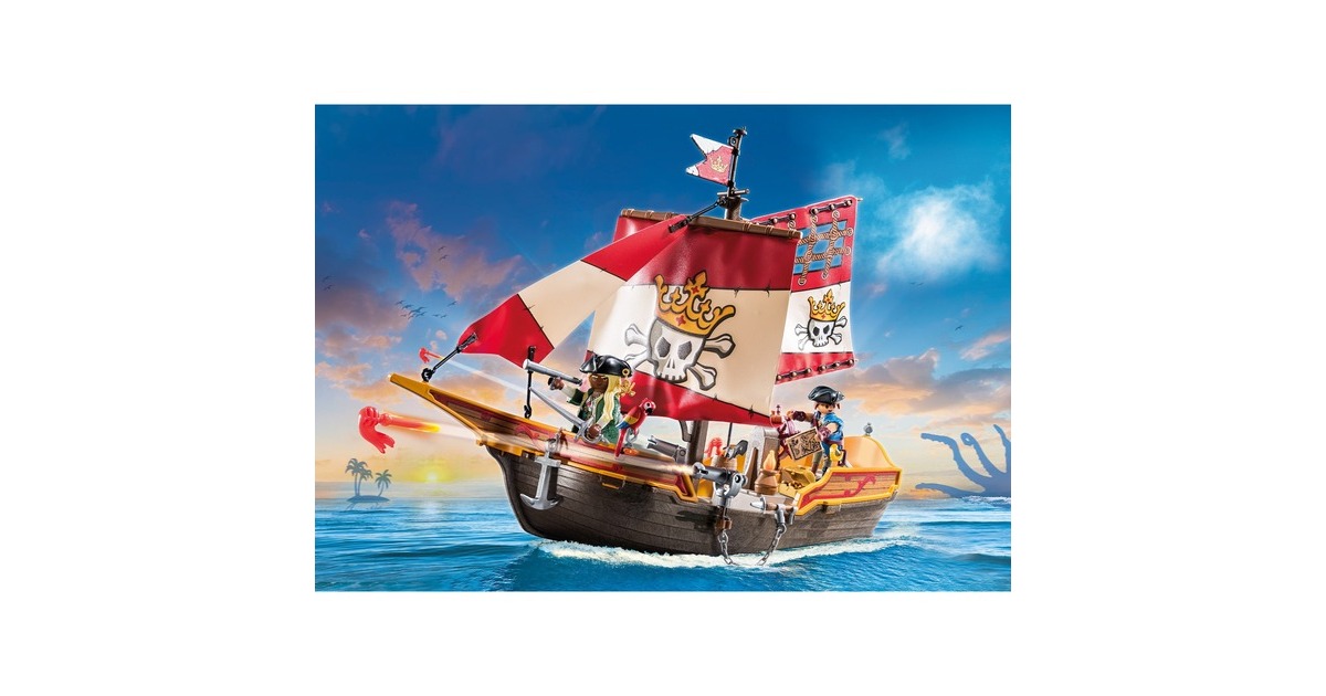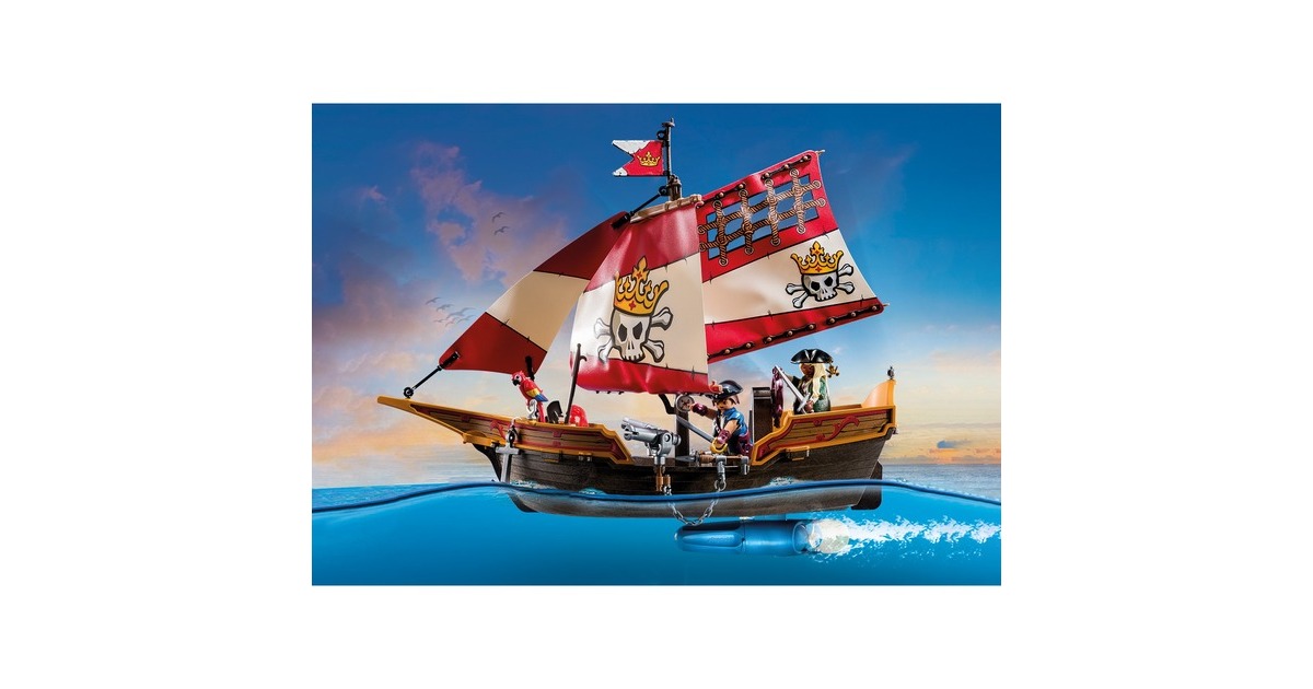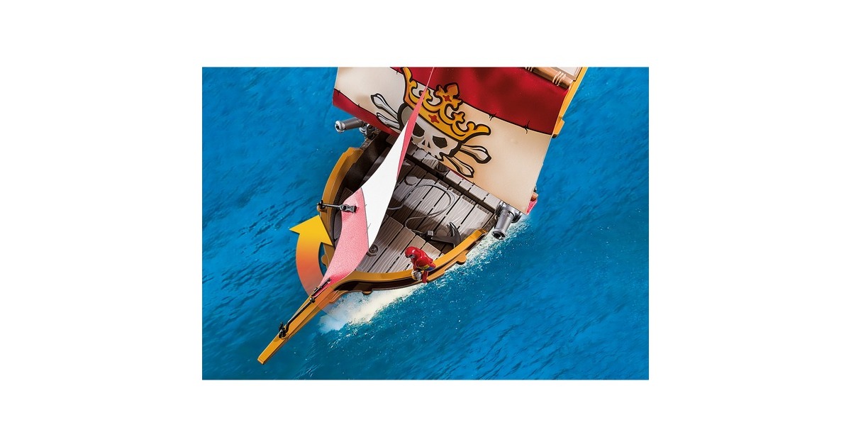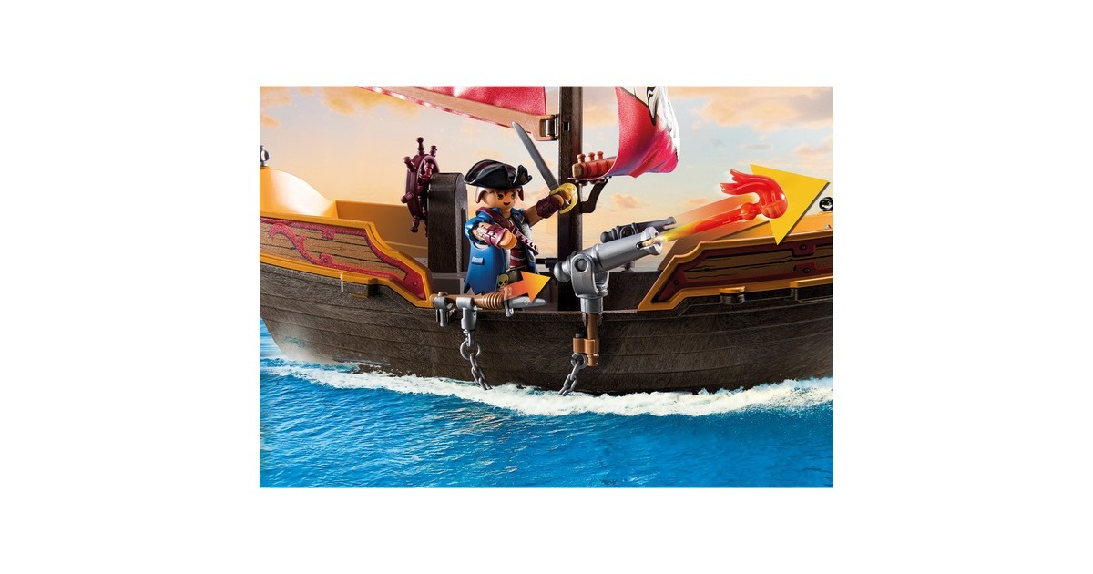 Setzt die Segel! Mit diesem tollen PLAYMOBIL-Piratenschiff geht es auf ins nächste Abenteuer. Das Schiff ist schwimmfähig und mit zwei dreh- und schwenkbaren Kanonen ausgerüstet, die Flammengeschosse abschießen können. Die Segel sind beweglich. An Bord sind Seemonsterjäger Manta-Hunter Myles und Piratenkönigin Rohanna "Ro" Razor-Tide mit einzigartigen Bekleidungs-Elementen. Fünf Fußklemmungen auf dem Bootsdeck sorgen für einen sicheren Stand der Figuren. Das Schiff kann mit einem Unterwassermotor (separat erhältlich) ausgerüstet werden. Art.-Nr.: 100034227