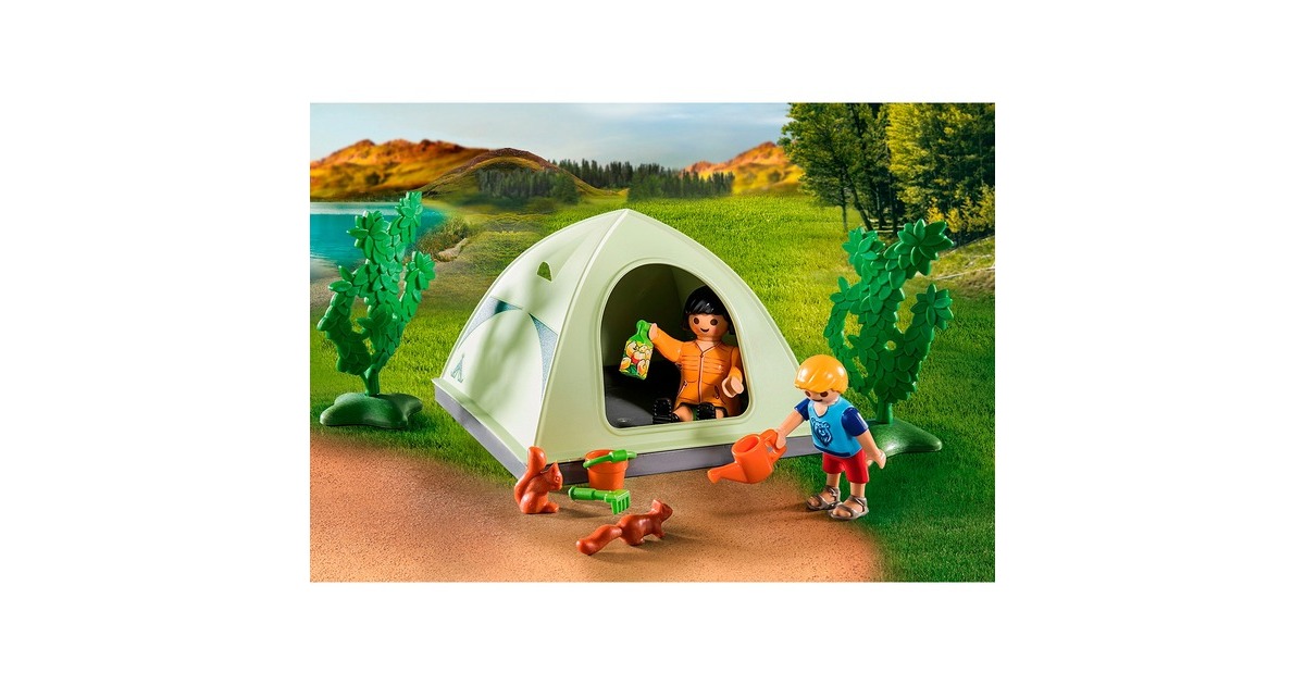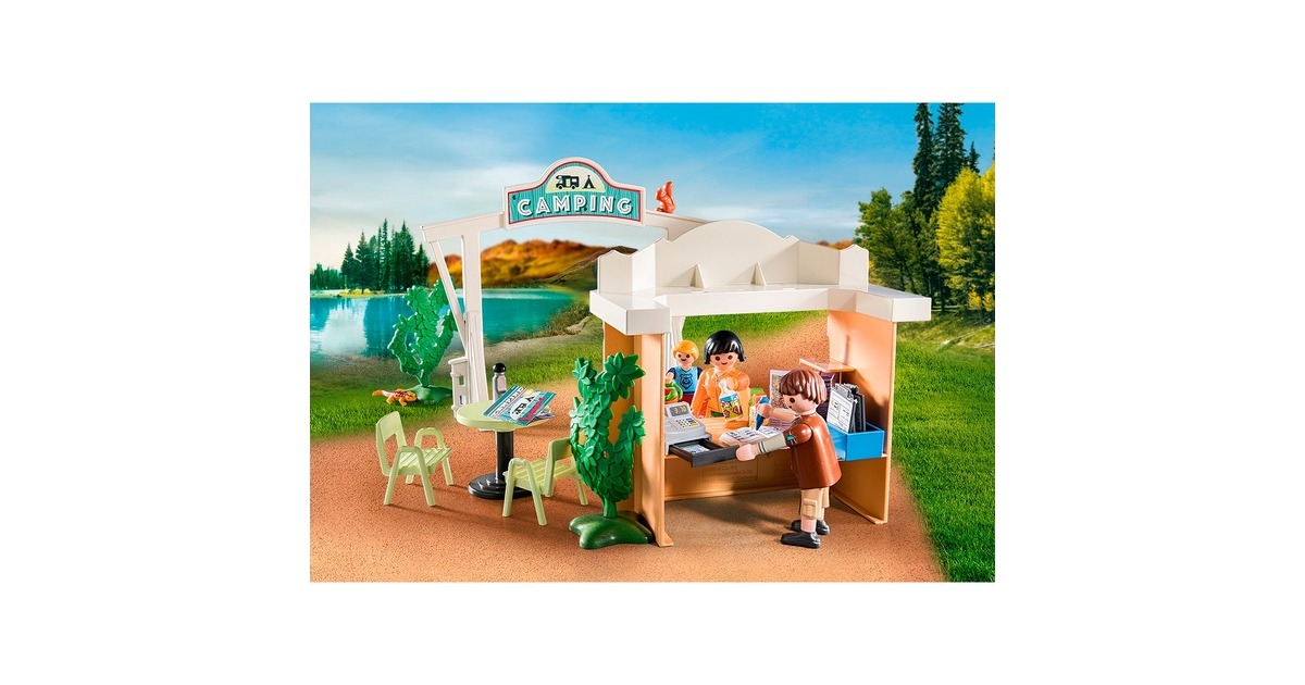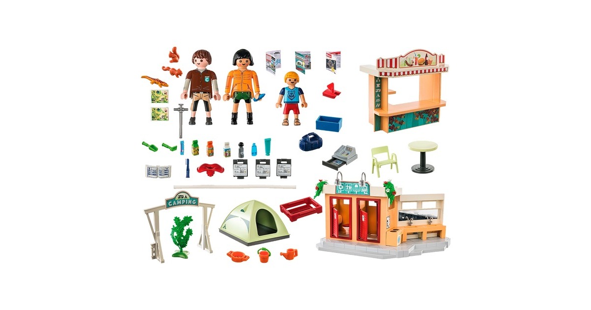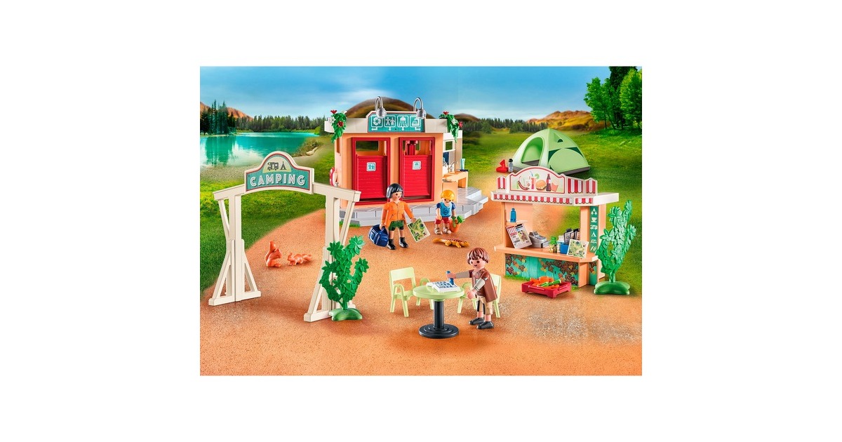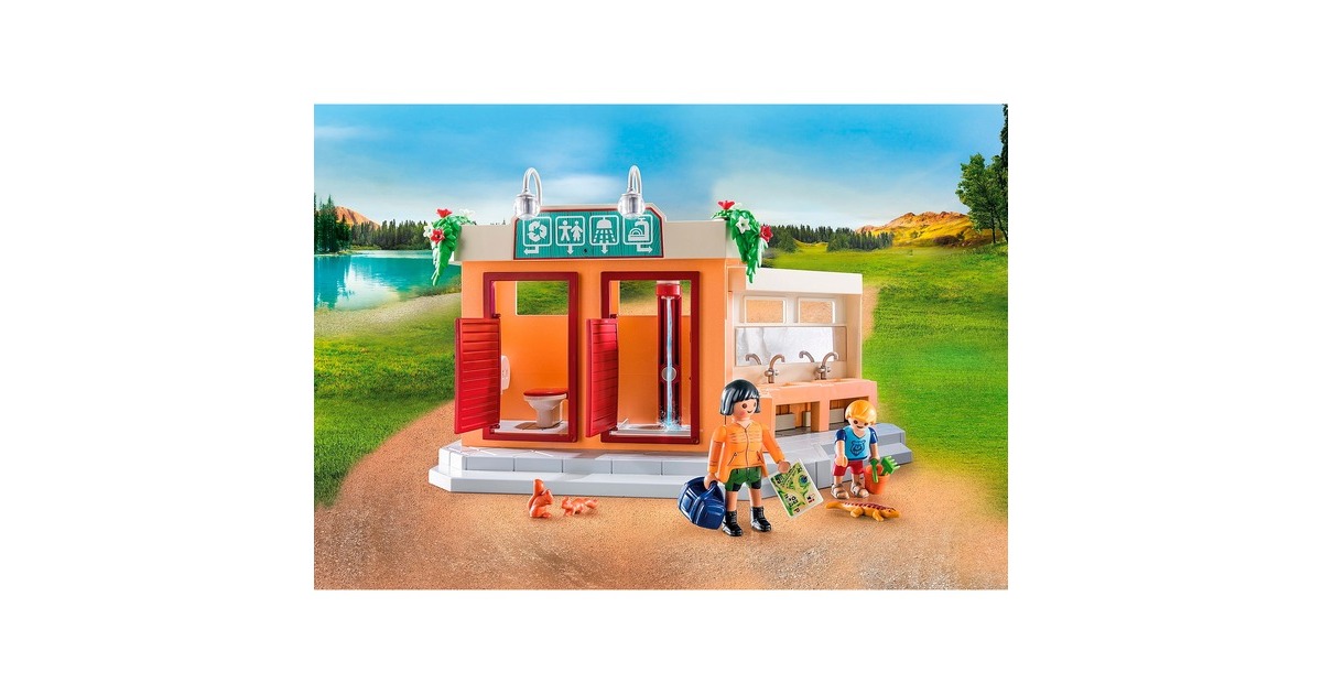 Ein PLAYMOBIL-Set für Campingfans ab vier Jahren: Hier gelingt der Urlaub unter freiem Himmel, denn mit einer Küche, einem Sanitärbereich und einem Kiosk für leckere Snacks ist für alles gesorgt. Viele kleine Extras bieten reichlich Möglichkeiten für fantasievolles Spielen - insgesamt sind 100 Teile enthalten. Mit dabei: Drei PLAYMOBIL-Figuren, eine Wasserpump-Funktion für die Dusche, ein Zelt und verschiedene Tierfiguren. Art.-Nr.: 100034905