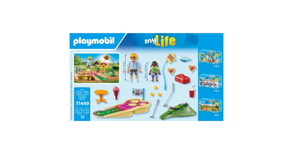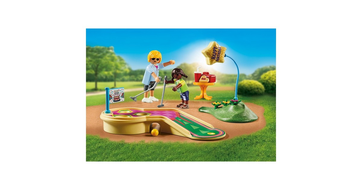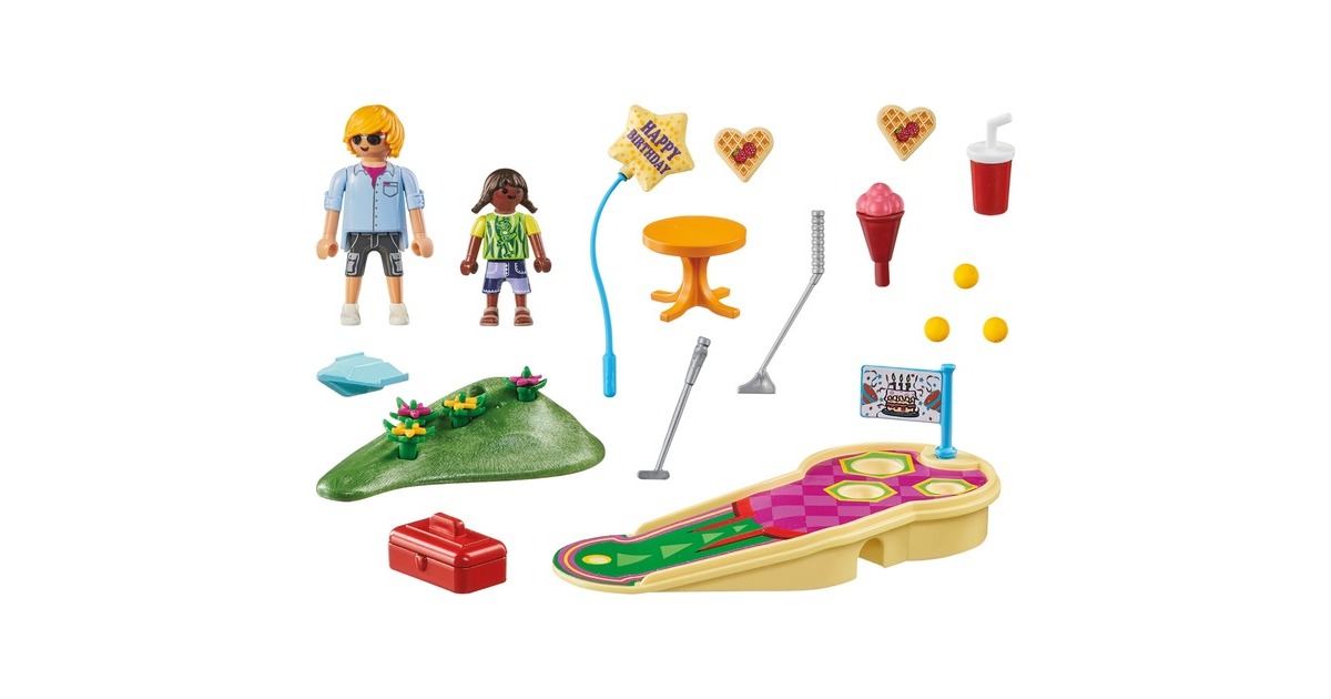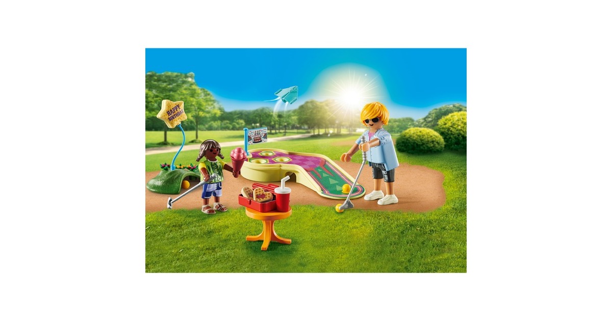 Die Minigolfbahn von PLAYMOBIL City hat so einiges zu bieten: Der vordere Bereich ermöglicht das perfekte Platzieren des Balls für den Abschlag, während auf der oberen Ebene drei weitere Mulden als Ziellöcher warten. Der Durchgang unterhalb der Bahn kann als Tunnel genutzt werden, und der Hügel dient als zusätzliches Ziel. In der zweiteiligen Dose können die süßen Waffelherzen verstaut werden, während die Golfschläger, der Papierflieger, die Eistüte, der Getränkebecher und die Luftballonschnur praktische Griffe haben und von den zwei in diesem Set enthaltenen Figuren in der Hand gehalten werden können.Art.-Nr.: 100034252