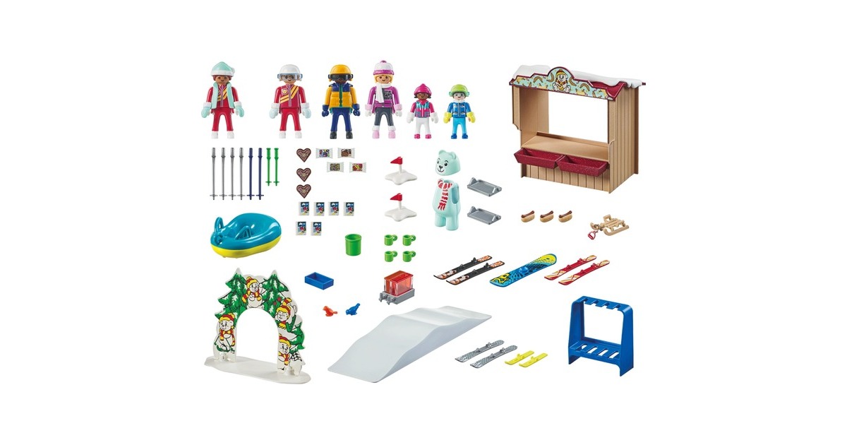 Figuren: 2 Frauen, 2 Männer, 2 Kinder. Tiere: 2 Vögel. Zubehör: 1 Bärenkostüm, 3 Mützen, 3 Helme, 1 Rutschreifen, 3 Plätzchen, 2 Tabletts, 4 Tassen, 3 Hotdogs, 1 Eimer, 8 Skistöcke, 4 Skier, 1 Snowboard, 1 Schlitten, 1 Hürde mit Fahne, 1 Skiständer |