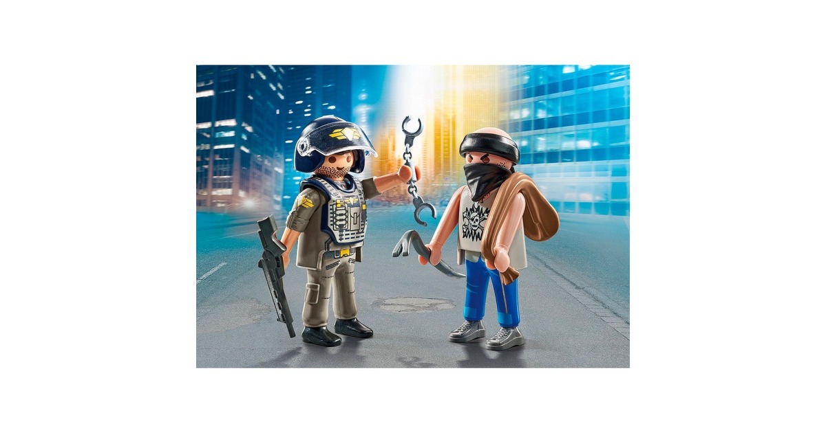 Die DuoPacks von PLAYMOBIL enthalten jeweils zwei Figuren mit passendem Zubehör - für dynamischen Spielspaß zu einem bestimmten Thema. Dieses Pack enthält einen SWAT-Polizisten mit Maschinengewehr, Helm und Handschellen. Sein Widersacher ist der Bandit mit Mundschutz, Brecheisen und einem Sack für die Beute.Art.-Nr.: 100034708