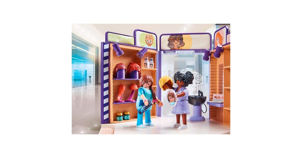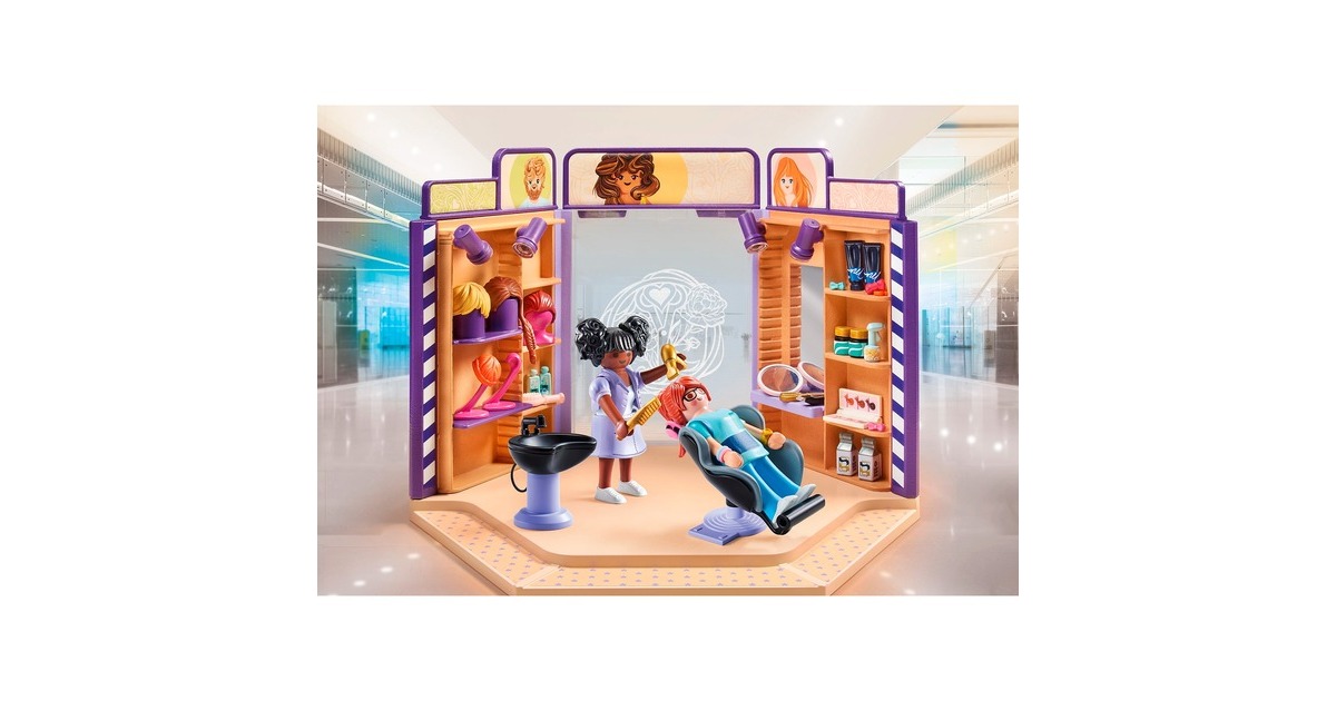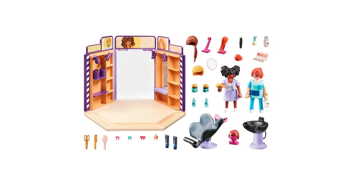 Jede Menge Shopping-Vergnügen in PLAYMOBIL City: Dieser moderne Friseursalon aus der Reihe my Life hat alles, was sich Fans von modernen Schnitten wünschen. Einfach im bequemen Stuhl zurücklehnen und genießen. Der Friseursalon ist mit Friseurstuhl, Waschbecken und Spiegel bestens ausgestattet. Perücken und Pflegeprodukte werden in den Wandregalen aufbewahrt. Das Set ist frei mit anderen City Life-Sets zum Thema Einkaufen kombinierbar - so lässt sich ein komplettes Einkaufszentrum zusammenstellen.Art.-Nr.: 100034876