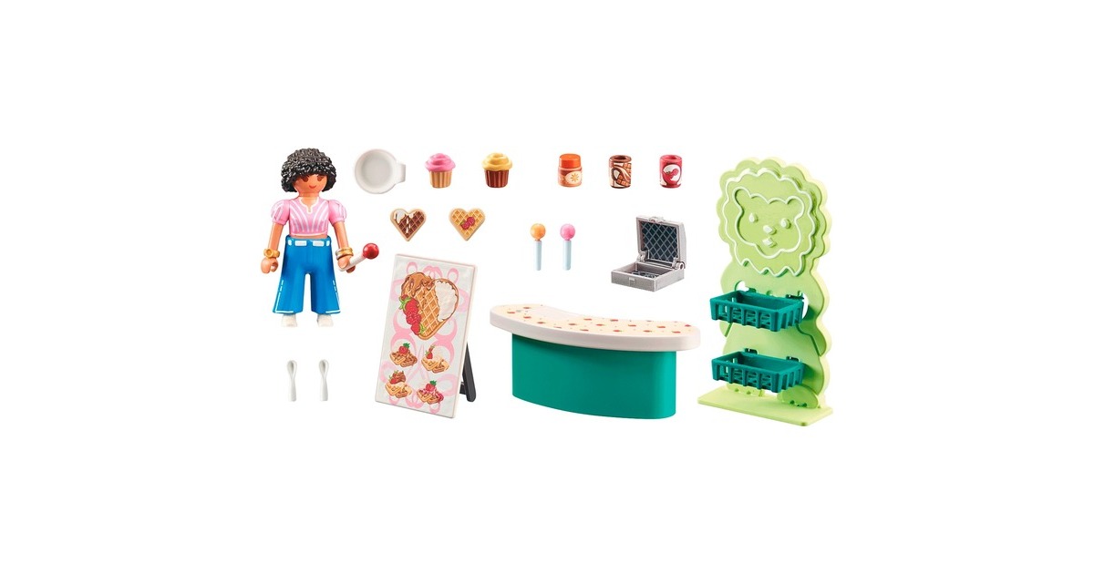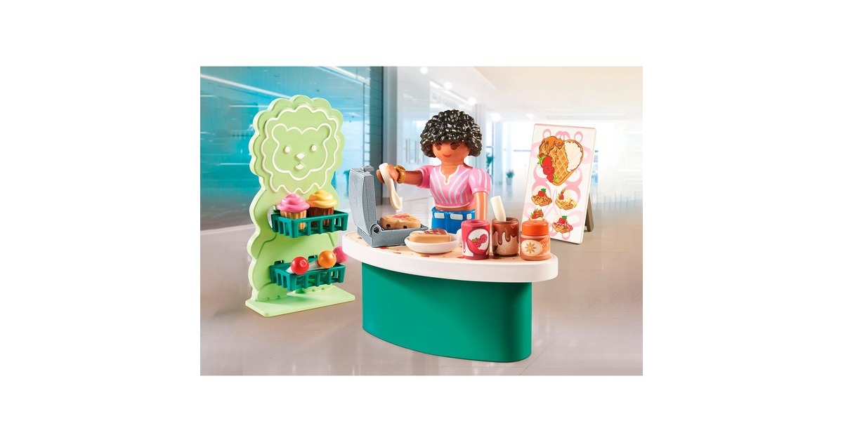 Einfach lecker: Dieser Süßigkeitenstand hat eine breite Auswahl für eine kleine Shopping-Pause in PLAYMOBIL City. Ob Waffeln, Cupcakes oder Lollis: Hier findet jeder etwas. Die Verkäuferin verziert die süßen Snacks mit Puderzucker, Apfelmus oder Schokocreme - einfach köstlich! Das Set ist frei mit anderen myLife-Sets zum Thema Einkaufen kombinierbar - so lässt sich ein komplettes Einkaufszentrum zusammenstellen.Art.-Nr.: 100034894