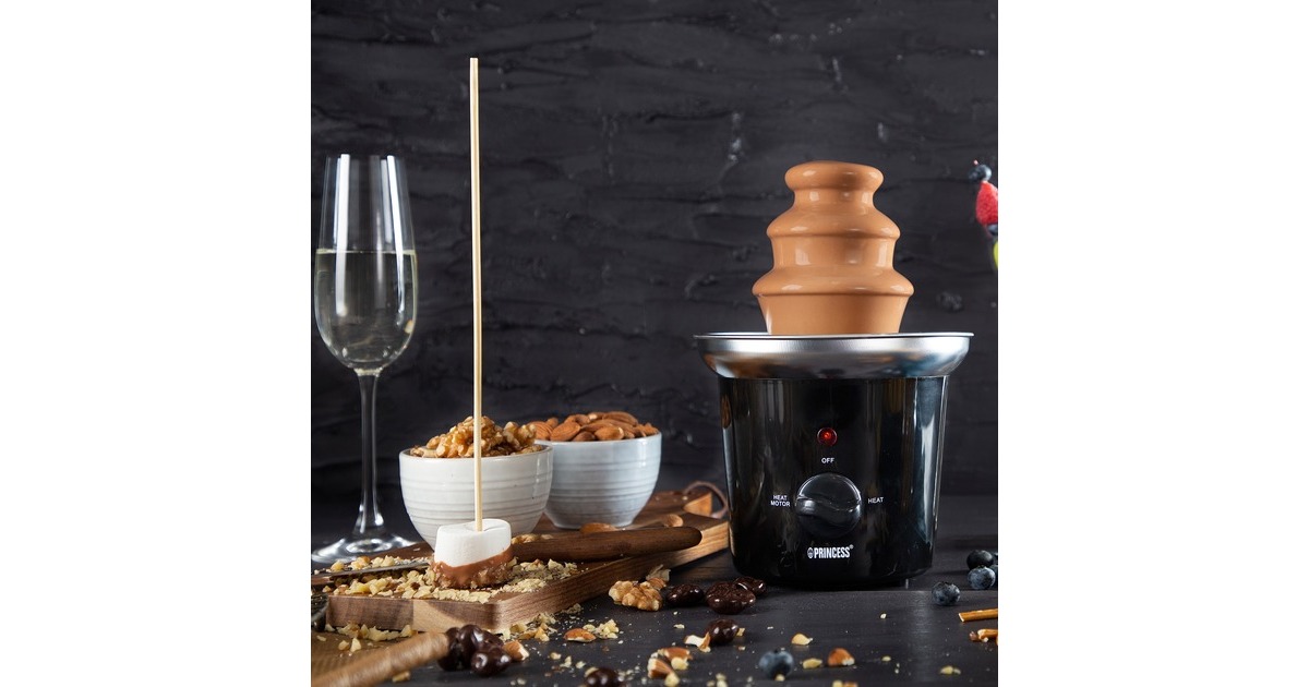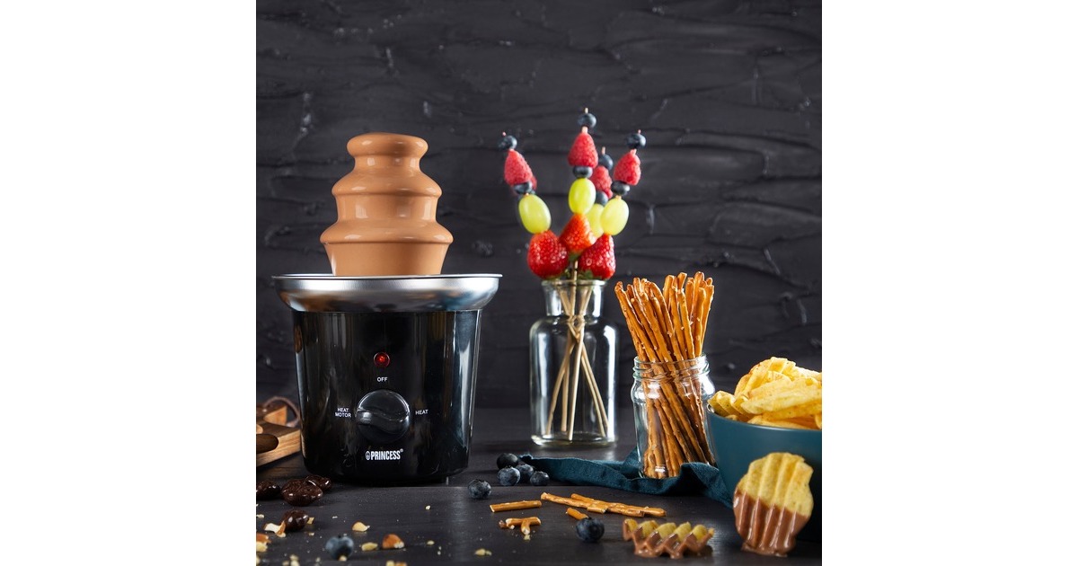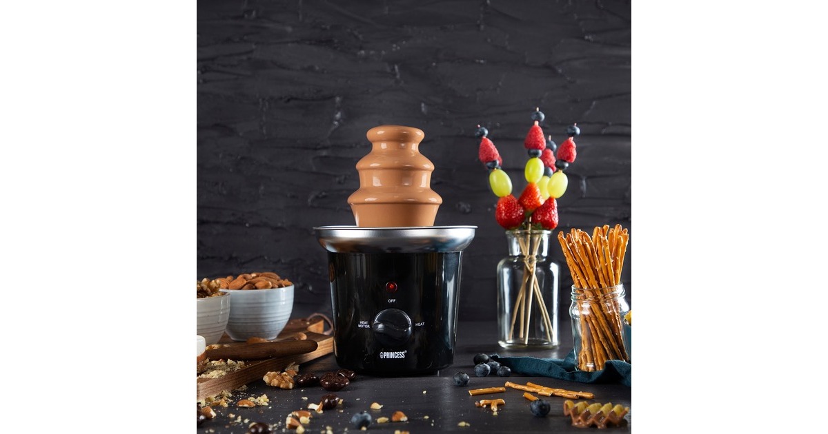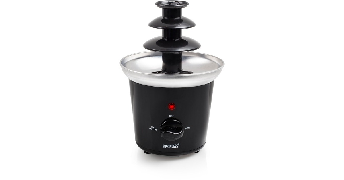 Der Princess 292994 Schokoladenbrunnen ist das ideale Gerät für alle Naschkatzen. Der Brunnen schmilzt die Schokolade und pumpt sie nach oben, wo sie dann über drei Ebenen wieder nach unten fließt. Dann kann man verschiedene Lebensmittel wie Fruchtstücke, Kekse und Marshmallows in den süßen Schokoladenstrom zu tauchen. Der Princess Schokoladenbrunnen ist ganz einfach zu benutzen. Einfach fein geraspelte Schokolade in die Tropfschale geben und den Drehschalter in die erste Stellung bringen. Sobald die Schokolade geschmolzen ist, kann der Drehschalter in die zweite Stellung eingestellt werden. Daraufhin strömt die Schokolade oben heraus und man kann genießen. Das Heizelement hält die Temperatur der Schokolade konstant, so dass sie flüssig bleibt und nicht anbrennt. Für eine perfekte Schokoladenkaskade muss eventuell etwas Kakaobutter oder einen Teelöffel Öl zur Schokolade hinzugefügt werden. Nach Gebrauch kann die restliche Schokolade aus dem Brunnen zum abkühlen einfach in ein kleineres Behältnis gegossen werden. Das Oberteil des Brunnens ist abnehmbar und lässt sich einfach abspülen. Die Edelstahl-Auffangschale lässt sich mit einem Spülmittel problemlos reinigen. Art.-Nr.: 1466792