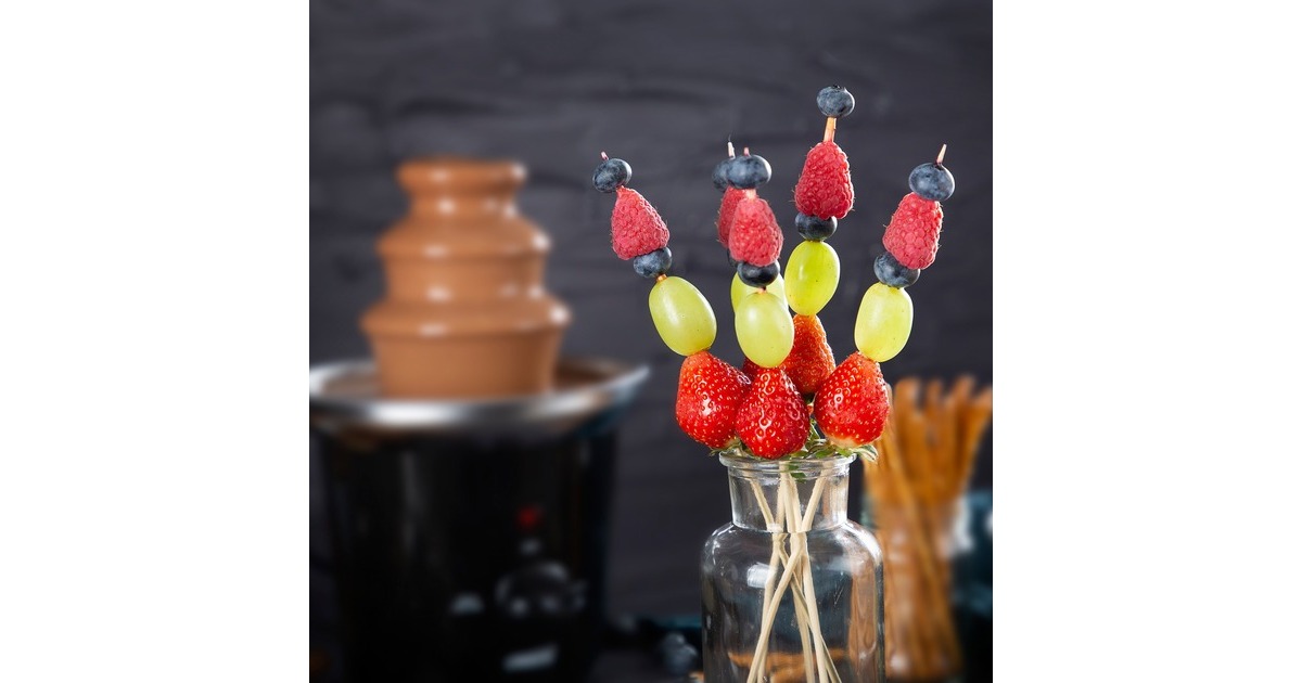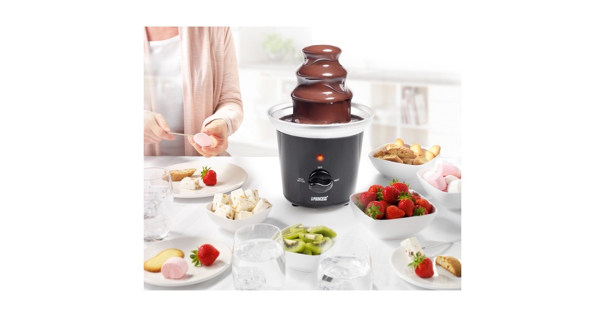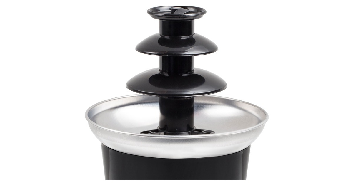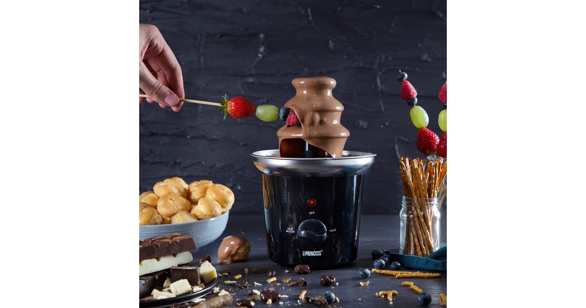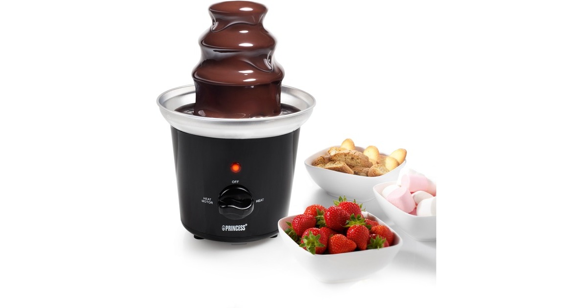 Der Princess 292994 Schokoladenbrunnen ist das ideale Gerät für alle Naschkatzen. Der Brunnen schmilzt die Schokolade und pumpt sie nach oben, wo sie dann über drei Ebenen wieder nach unten fließt. Dann kann man verschiedene Lebensmittel wie Fruchtstücke, Kekse und Marshmallows in den süßen Schokoladenstrom zu tauchen. Der Princess Schokoladenbrunnen ist ganz einfach zu benutzen. Einfach fein geraspelte Schokolade in die Tropfschale geben und den Drehschalter in die erste Stellung bringen. Sobald die Schokolade geschmolzen ist, kann der Drehschalter in die zweite Stellung eingestellt werden. Daraufhin strömt die Schokolade oben heraus und man kann genießen. Das Heizelement hält die Temperatur der Schokolade konstant, so dass sie flüssig bleibt und nicht anbrennt. Für eine perfekte Schokoladenkaskade muss eventuell etwas Kakaobutter oder einen Teelöffel Öl zur Schokolade hinzugefügt werden. Nach Gebrauch kann die restliche Schokolade aus dem Brunnen zum abkühlen einfach in ein kleineres Behältnis gegossen werden. Das Oberteil des Brunnens ist abnehmbar und lässt sich einfach abspülen. Die Edelstahl-Auffangschale lässt sich mit einem Spülmittel problemlos reinigen. Art.-Nr.: 1466792