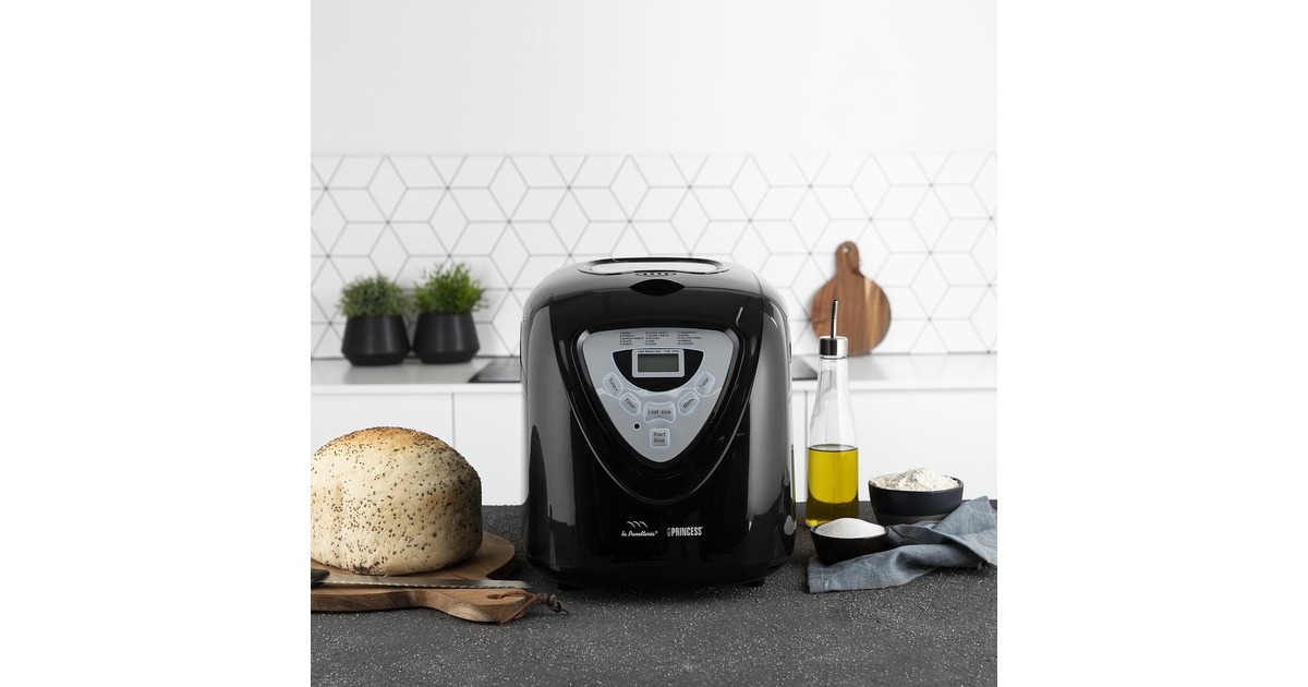 Mit dem Princess 152009 Brotbackautomaten kann man den einzigartigen Geruch von frisch gebackenem Brot nun auch jederzeit zu Hause genießen. Im Gegensatz zu echten Bäckern braucht man aber nicht vor dem Morgengrauen aufzustehen, um mit dem Backen anzufangen. Die Zutaten werden einfach in die Maschine gegeben und dank der Zeitvorwahl ist das frische Brot morgens fertig. Der perfekte Start in den Tag. Der Brotbackautomat verfügt über 15 automatische Programme, so ist für jeden Geschmack etwas dabei. Über das digitale Bedienfeld können die Einstellungen an die individuellen Vorstellungen angepasst werden. Auch die Krustenfärbung lässt sich von eher hell auf dunkles Brot einstellen. Die Princess Brotbackmaschine kann Brote bis 900 g backen. Das sind etwa 14 Scheiben Brot – genug für die ganze Familie. Ob saftiges Bananenbrot oder ein herzhaftes Roggenbrot, der Brotbackautomat ist vielseitig einsetzbar. Denn er eignet sich auch ideal für Marmelade, Joghurt, Kuchen und sogar für Reis. Für Personen mit einer Gluten-Intoleranz oder für Allergiker ist die Princess Brotbackmaschine eine echte Bereicherung. Dank einem speziellen Backprogramm kann man nun ein frisches glutenfreies Brot selbst herstellen. Über das intuitive Display des Princess Brotbackautomaten lässt sich ganz einfach das optimale Programm auswählen. Es gibt acht Einstellungen für verschiedene Brotsorten, z. B. Vollkorn, Süß, Französisch, Glutenfrei, sowie drei ultraschnelle Einstellungen. Marmelade, Joghurt, Kuchen und nur Kneten oder Gehen lassen sind auch möglich. Für weiteren Komfort sorgen der Timer, so können bis zu 13 Stunden im Voraus die Zutaten zugeben werden, bevor der eigentliche Backvorgang startet und die Warmhaltefunktion, die frisches Brot bis zu 60 Minuten warmhält. Art.-Nr.: 1703538