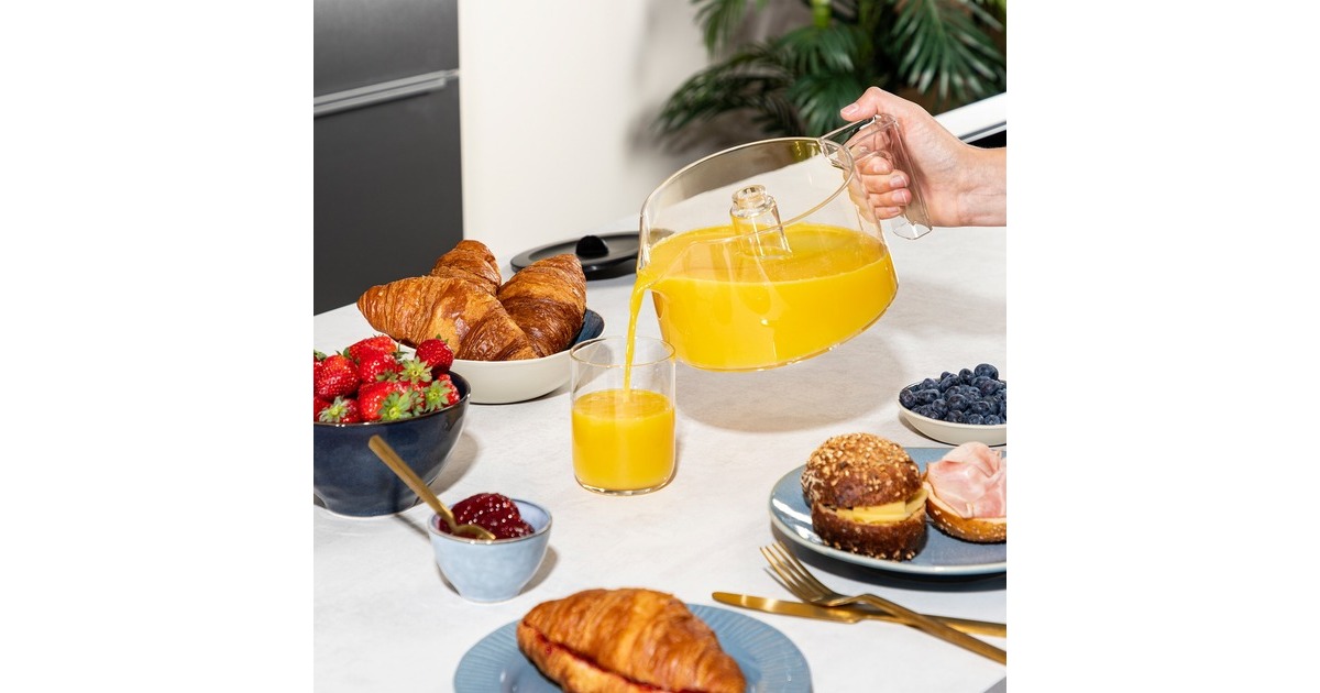 Abnehmbare 1-Liter-Kanne mit Deckel ermöglicht auch die Aufbewahrung des Saftes im Kühlschrank |