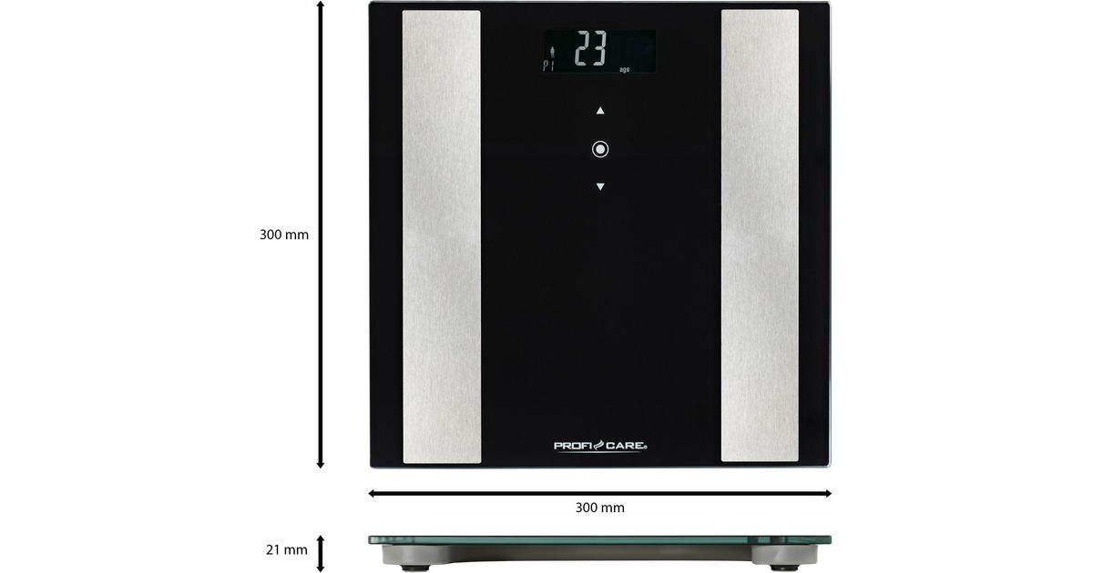 Die PC-PW 3007 FA von ProfiCare ist eine 8 in 1 Analysewaage. Sie misst nicht nur das Gewicht mit einer Genauigkeit von 100 Gramm, sie gibt auch Körperfettanteil, Wasseranteil, Muskelmasse, Knochengewicht, Organfett, Kalorienverbrauchpro Tag (BMR) sowie des BMI-Wertes (Körpermassindex) aus. Die hochwertige Sicherheitsglasoberfläche mit Edelstahleinlage misst ca. 30 x 30 cm und ist hygienisch und kratzfest. Die PC-PW 3007 FA ist mit einem gut ablesbaren Multifunktions-LCD-Display und moderner Sensor Touch-Bedienung ausgestattet. Die Diagnosewaage hat einen Messbereich von 5 – 180 kg in 100 g-Schritten und speichert die Daten von bis zu zehn Personen. Die Step-On- und Abschaltautomatik erleichtern die Bedienung und helfen Batterien zu sparen. Für einen sicheren Stand sorgen die Anti-Rutschfüße. Art.-Nr.: 1561478