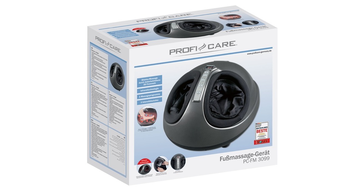 Selfcare mit ProfiCare, getreu dem Motto: Selfcare is not selfish! Das Massagegerät FM 3099 schenkt bedingungslos Entspannung und Wärme. Unser Alltag ist oftmals sehr stressig und unsere Füße tragen uns den lieben langen Tag. Entspannung? Keine in Sicht. Und da kommt das Fußmassagegerät FM 3099 ins Spiel. Ob nach dem Sport, dem Spaziergang, einem Städtetrip oder einem anstrengendem Arbeitstag - eine Massage entspannt Körper und Seele. Das Massagegerät FM 3099 ermöglicht eine professionelle Massage durch Knet-, Roll- und Druckfunktion und verfügt über eine Infrarotlichtquelle, die durch elektrisch einstellbare Wärmefunktion tiefsitzende Verspannungen löst und die Durchblutung fördert. Dank intuitivem Bedienfeld mit LED-Display und LED-Kontrollanzeigen habt man alles stets unter Kontrolle: 3 Intensitätsstufen, Wärme-/Heizfunktion, Timer (5–30 Min.) und Restlaufanzeige. Der hautsympathische und pflegeleichte Innenbezug ist für eine schnelle Wäsche abnehmbar.
