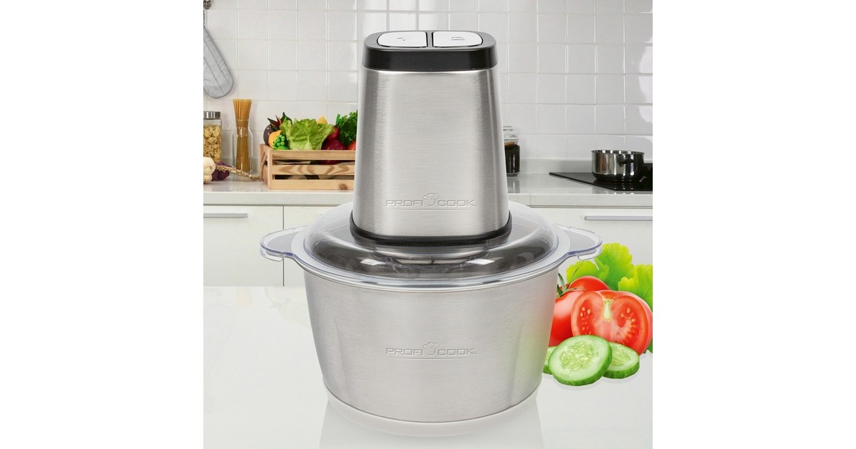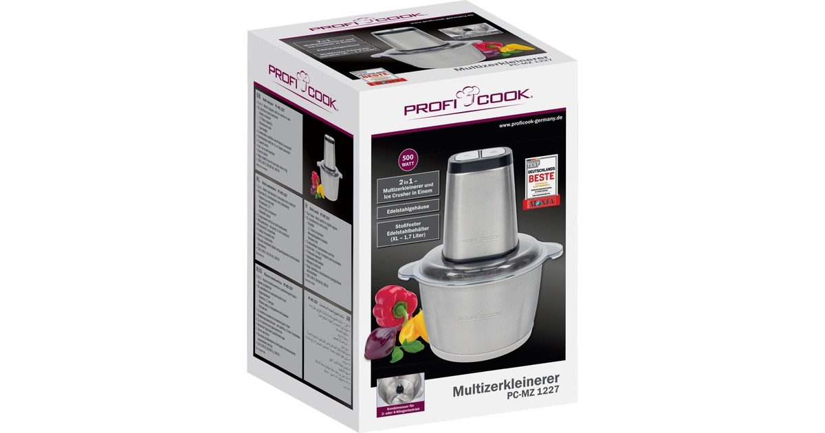 Mit dem 2in1 Multizerkleinerer MZ 1227 von ProfiCook lassen sich verschiedenste Lebensmittel in sekundenschnelle zerkleinern. Wenn es mal bei der Essenszubereitung schnell gehen muss oder man es einfach aus Bequemlichkeit lieber schnell und gefahrlos kleinschneiden will. Der XL-Mixbehälter aus Edelstahl fasst ca. 1.7 Liter, ist stoßfest und spülmaschinengeeignet. 2 Geschwindigkeitsstufen und das kombinierbare 2- oder 4- Klingen-Messer sorgen für die perfekte Verarbeitung der individuellen Zutaten – harte Zutaten, wie Eis werden mit der starken Stufe gecrushed, weichere Zutaten mit der leichteren.