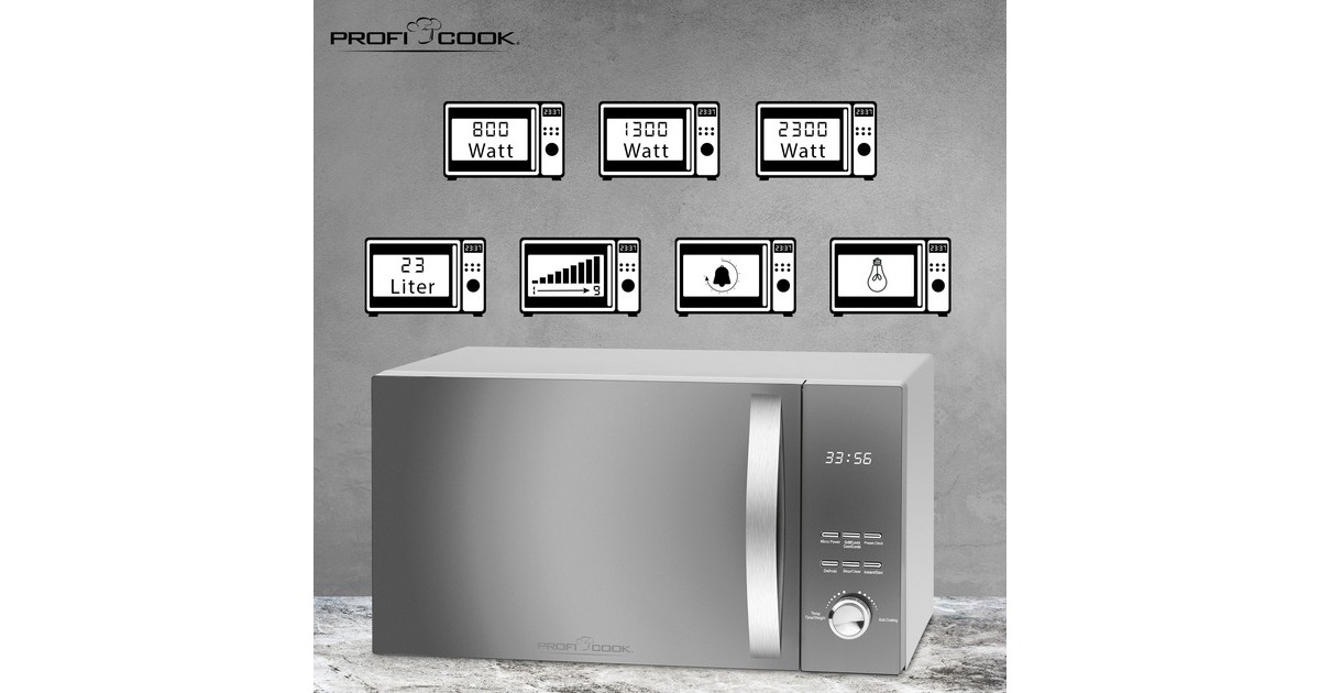 Die PC-MWG 1176 H Mikrowelle mit Grill und Heißluft von ProfiCook eignet sich besonders gut zum schnellen Garen von Speisen, die knusprig gebräunt oder überbacken werden sollen. Die PC-MWG 1176 H bietet einen 23 Liter großen Edelstahl-Garraum mit einem Drehteller mit 27 cm Durchmesser. Besonders komfortabel ist die Bedienung dank dem Multifunktionsdisplay, welches auch die Uhrzeit anzeigt. Neun Automatikprogramme inklusive Auftauprogramm sorgen stets für optimale Ergebnisse beim Zubereiten der Speisen. Darüber hinaus überzeugt die PC-MWG 1176 H mit einer Kindersicherung, der Garraumbeleuchtung, einem 60 Minuten-Timer mit Endsignal und der Schnellstart-Funktion. Art.-Nr.: 1610946