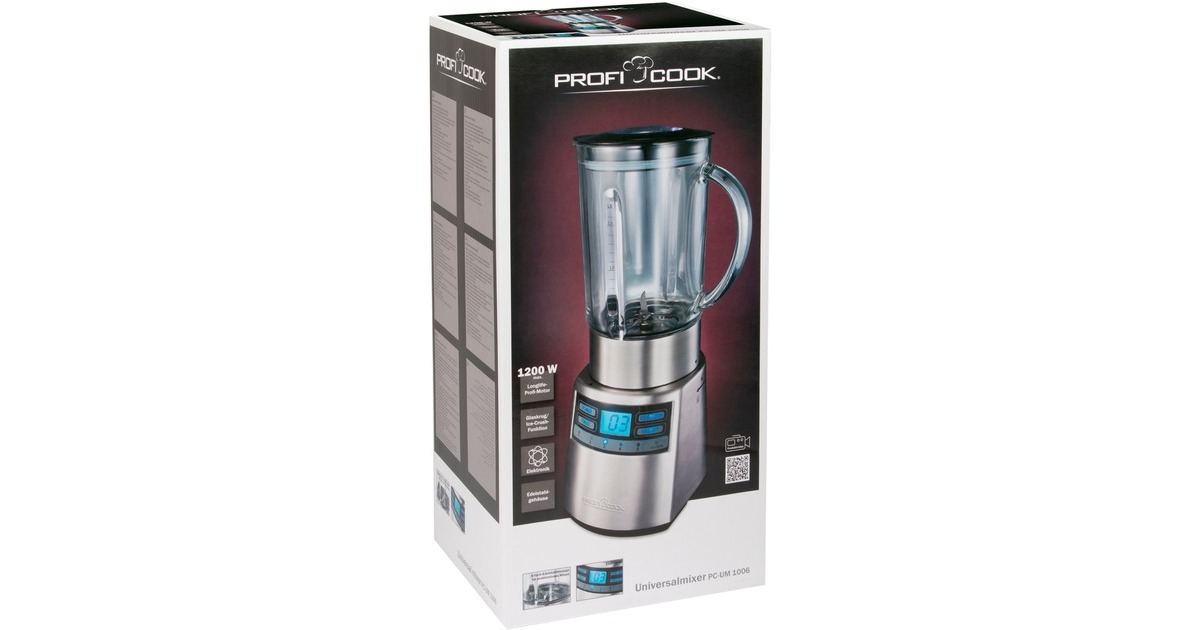 Der PC-UM 1006 von ProfiCook ist ein robuster Universalmixer mit Edelstahlgehäuse. Durch den leistungsstarken und Longlife-Profi-Motor mit 1200 Watt Leistung eignet er sich zum Pürieren, Schlagen, Zerkleinern, Shaken, Mixen. Der massive Glas-Mixbehälter fasst 1,8 Liter und verfügt über eine gut ablesbare Skala. Die Abdeckung der Nachfüllöffnung kann als Messbecher verwendet werden (2 cl). Die Bedienung erfolgt über ein Soft-Touch-Display. Dank des Kabelstaufaches im Boden lässt sich der PC-UM 1006 nach Gebrauch platzsparend aufräumen.Art.-Nr.: 1459600