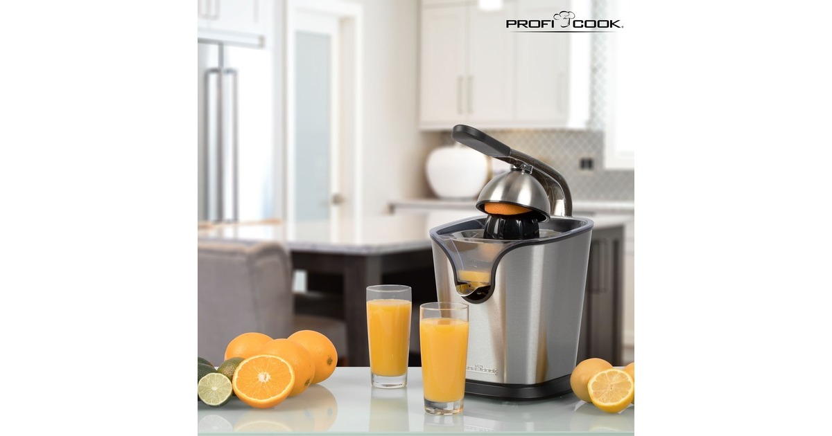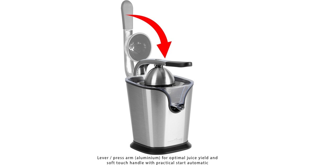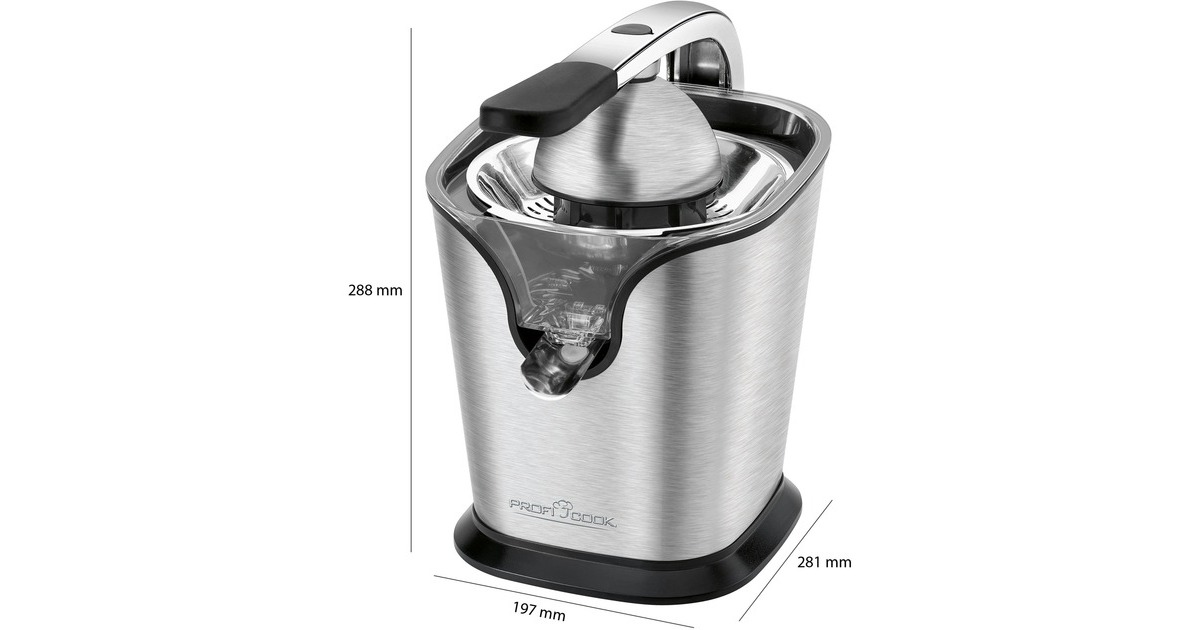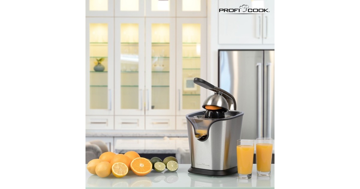 Die Zitruspresse PC-ZP 1154 im hochwertigen Edelstahlgehäuse von ProfiCook überzeugt durch hohe Saftausbeute und leichte Reinigung. Der leistungsstarke Longlife-Profi-Motor entsaftet Zitrusfrüchte bis zum letzten Tropfen und nach kurzer Zeit kann man seine Lieblingssäfte genießen. Der Hebel-/Pressarm aus hochwertigem Aluminium, mit Soft-Touch-Griff sorgt für eine bequeme Handhabung und maximale Saftausbeute. Mit etwas Druck auf den Hebel startet das Gerät den Motor selbstständig. Mit den zwei Presskegeln in unterschiedlichen Größen, lassen sich Grapefruits, Zitronen, Limetten oder Orangen entsaften. Die PC-ZP 1154 verfügt zudem über einen Edelstahl-Saftausguss mit Tropfstopp-Funktion. Bevor man das Gefäß mit dem frisch gepressten Saft entfernt, kann der Ausguss nach oben gedrückt werden, um die Auslassöffnung des Saftbehälters zu verschließen und ein Nachtropfen zu vermeiden. Bei der Verarbeitung sorgen rutschfeste Saugfüße für einen sicheren Stand des Gerätes. Für eine schnelle und problemlose Reinigung lässt sich die Zitruspresse komplett zerlegen. Und wenn die Zeit mal fehlt - die Teile sind auch für die Spülmaschine geeignet. Mit der PC-ZP 1154 von ProfiCook genießt man frisch gepresste und gesunde Getränke.