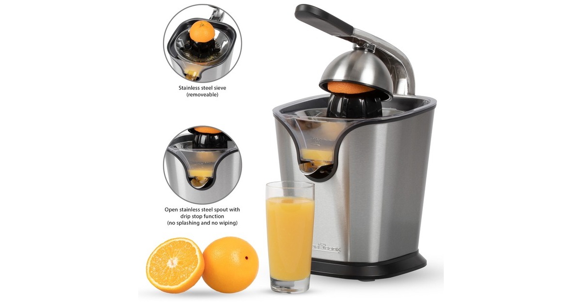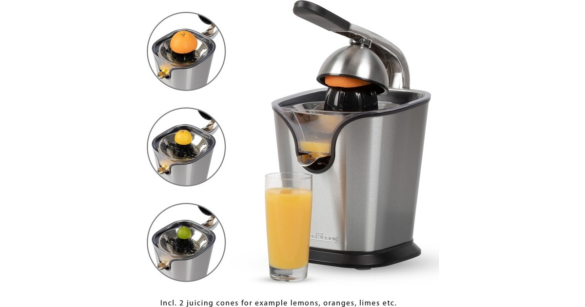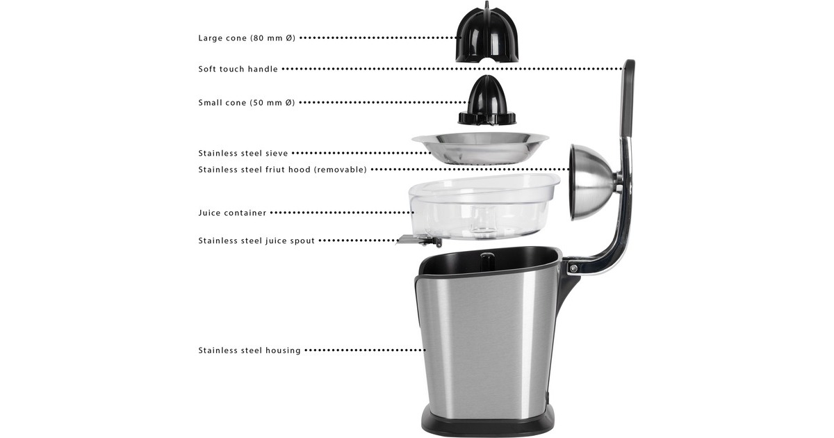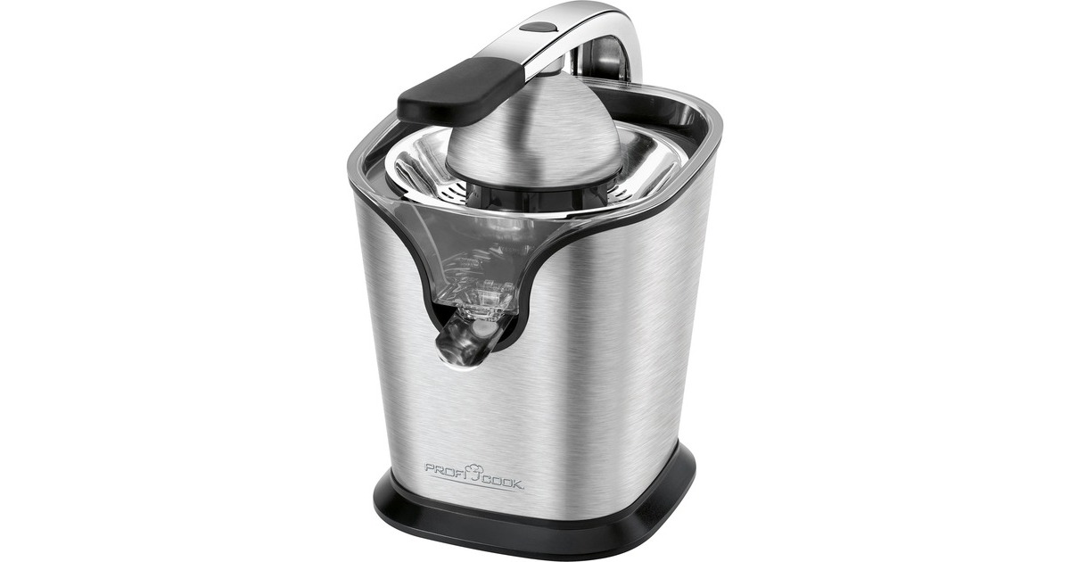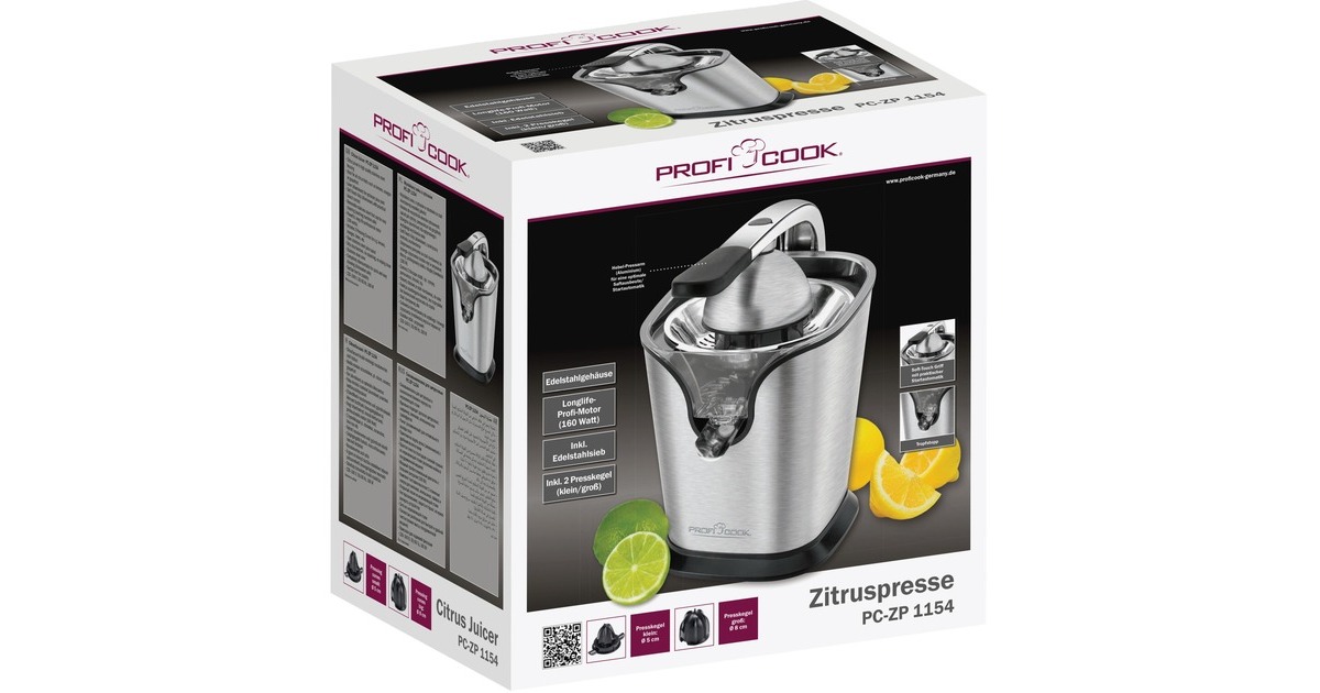 Die Zitruspresse PC-ZP 1154 im hochwertigen Edelstahlgehäuse von ProfiCook überzeugt durch hohe Saftausbeute und leichte Reinigung. Der leistungsstarke Longlife-Profi-Motor entsaftet Zitrusfrüchte bis zum letzten Tropfen und nach kurzer Zeit kann man seine Lieblingssäfte genießen. Der Hebel-/Pressarm aus hochwertigem Aluminium, mit Soft-Touch-Griff sorgt für eine bequeme Handhabung und maximale Saftausbeute. Mit etwas Druck auf den Hebel startet das Gerät den Motor selbstständig. Mit den zwei Presskegeln in unterschiedlichen Größen, lassen sich Grapefruits, Zitronen, Limetten oder Orangen entsaften. Die PC-ZP 1154 verfügt zudem über einen Edelstahl-Saftausguss mit Tropfstopp-Funktion. Bevor man das Gefäß mit dem frisch gepressten Saft entfernt, kann der Ausguss nach oben gedrückt werden, um die Auslassöffnung des Saftbehälters zu verschließen und ein Nachtropfen zu vermeiden. Bei der Verarbeitung sorgen rutschfeste Saugfüße für einen sicheren Stand des Gerätes. Für eine schnelle und problemlose Reinigung lässt sich die Zitruspresse komplett zerlegen. Und wenn die Zeit mal fehlt - die Teile sind auch für die Spülmaschine geeignet. Mit der PC-ZP 1154 von ProfiCook genießt man frisch gepresste und gesunde Getränke.
