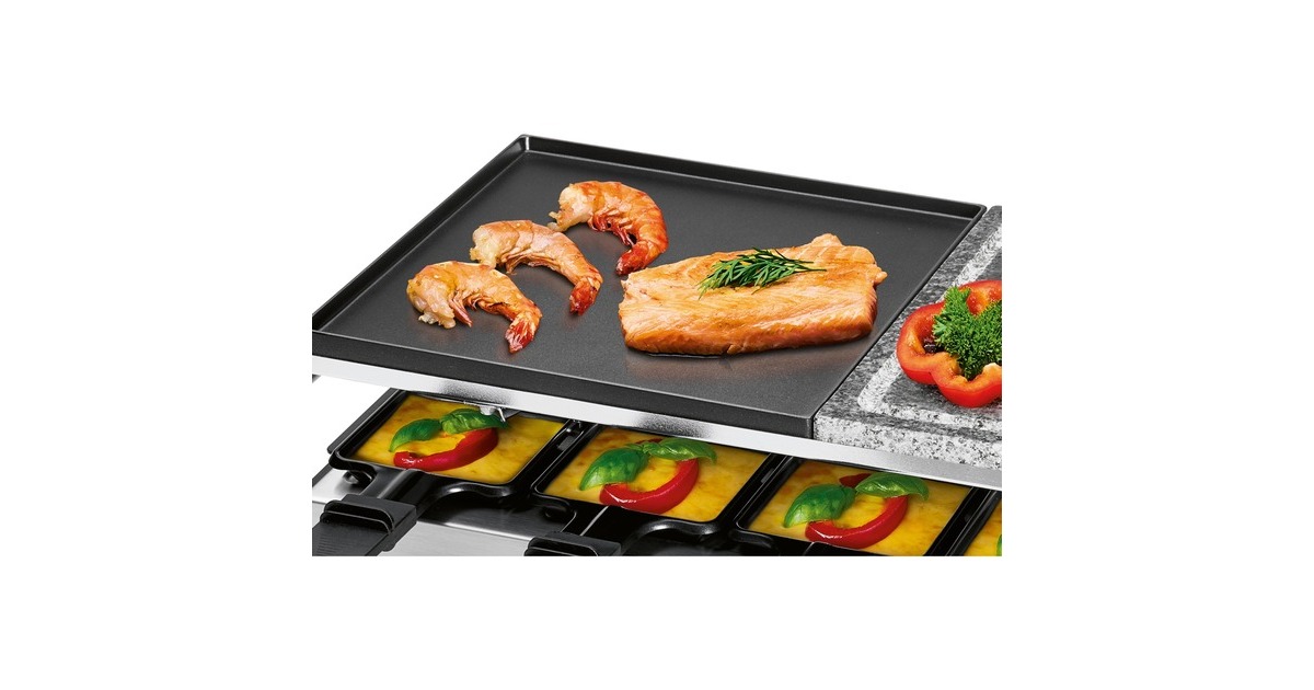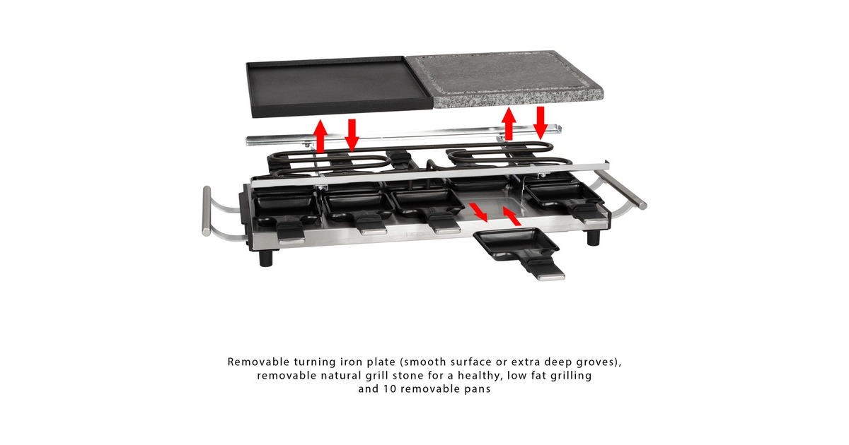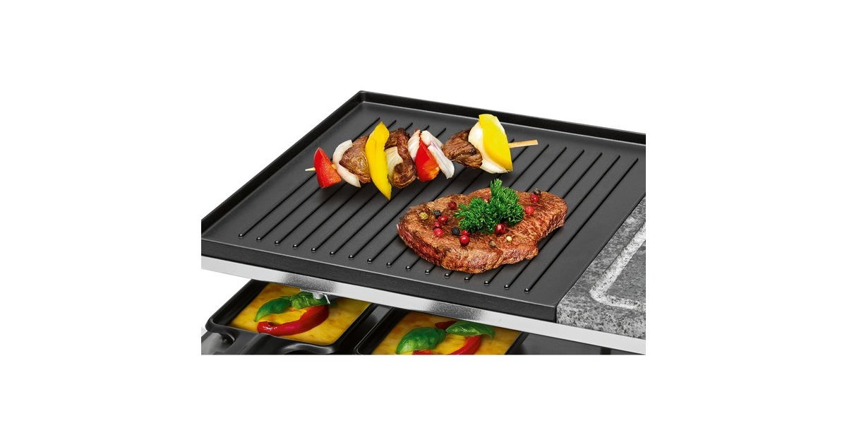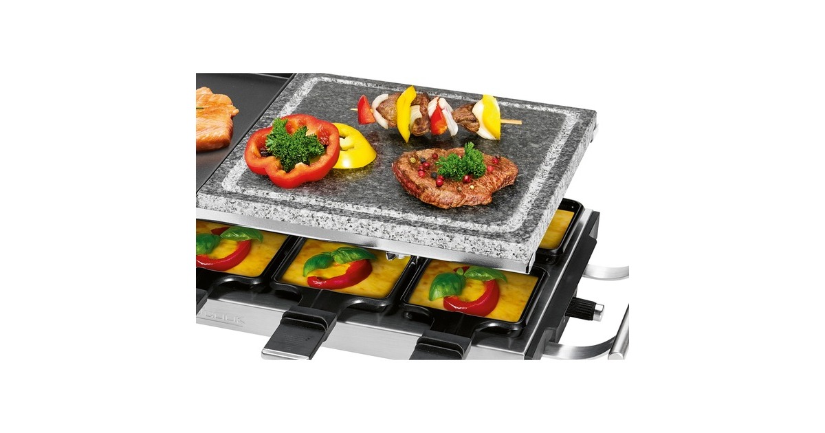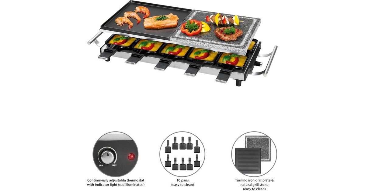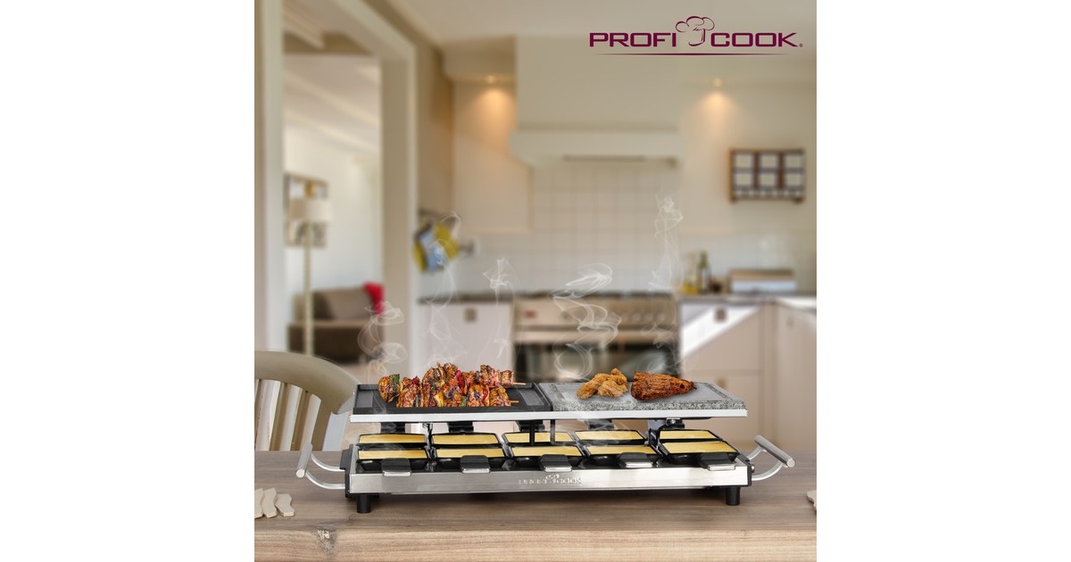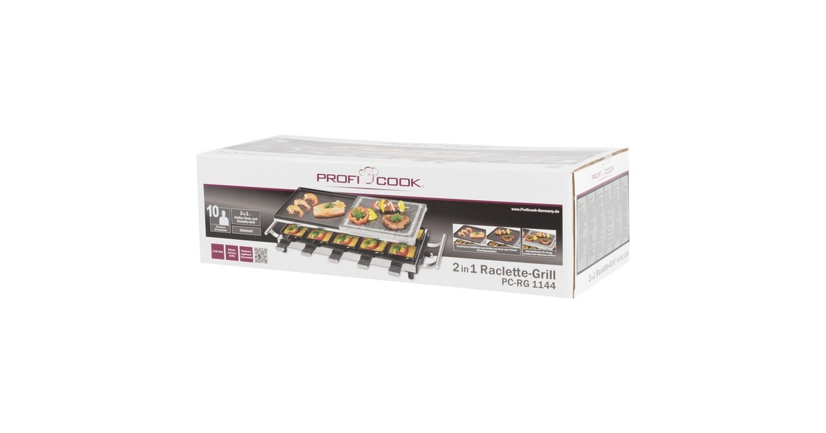 Grillen und genießen, deftig oder gesund - mit dem eleganten und hochwertig verarbeiteten Raclette-Grill von ProfiCook. Das leistungsstarke (1700 Watt) Raclette besteht aus einem Naturgrillstein für gesundes und fettarmes Grillen von Gemüse und einer Wendegussplatte mit kombinierter Grillfläche zum Grillen von Fisch oder Fleisch. Mit einer extra großen Grillfläche von ca. 48,5 x 24 cm (2x ca. 24 x 24 cm) findet jede Zutat Ihren richtigen Platz. Bis zu 10 Personen haben die Möglichkeit die antihaftbeschichteten Pfännchen inklusive wärmeisoliertem Griff mit Zutaten Ihrer Wahl zu befüllen. Die kombinierte Grillfläche der Wendegussplatte bietet zum Grillen von Fisch eine glatte Oberfläche oder extra tiefe Rillen für ein intensives Grillmuster für Fleisch. Mit dem Naturgrillstein lässt sich gesund und fettarm Grillen. Er speichert die Wärme, wodurch das Grillgut schonend gegart und dadurch zart und saftig wird. Mit Hilfe des stufenlos regelbaren Thermostat lässt sich die Temperatur individuell und ganz nach den persönlichen Bedürfnissen regulieren. Zusätzlich zeigt die Kontrollleuchte (rot beleuchtet) an, wenn das Gerät eingeschaltet ist. Für eine einfache Reinigung ist das Gerät leicht zerlegbar. Im Lieferumfang sind 10 Pfännchen und 10 Holzspachtel enthalten. Die Pfännchen können dank Antihaftbeschichtung (schneid- und kratzfest) leicht und schnell gereinigt werden.