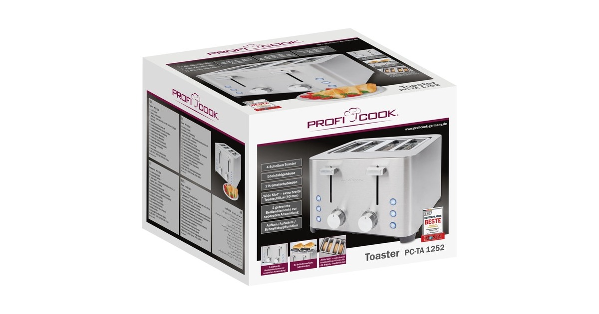 Der ProfiCook PC-TA 1252 Edelstahl ist ein hochwertiger 4-Scheiben Toaster mit 2 stufenlosen einstellbaren Bräunungsgradreglern und Zentrierfunktionen für gleichmäßige Bräunung. Der Toaster verfügt über extra breite Toast-Schlitze (40mm) für dicke und dünne Toast-Scheiben, ebenfalls perfekt für Bagels und Toastbrötchen geeignet. Der beiden Brötchenaufsätze sind abnehmbar. Mit der Zentrierfunktion wird der Toast gleichmäßig gebräunt. Der Toaster verfügt über 2 Auftau-, 2 Aufwärm- und 2 Schnellstoppfunktionen (weiß beleuchtet) und enthält 2 Krümelschubladen (herausnehmbar), eine Kabelaufwicklung und bietet durch die gummierten Füße einen sicheren Stand.Art.-Nr.: 1886309