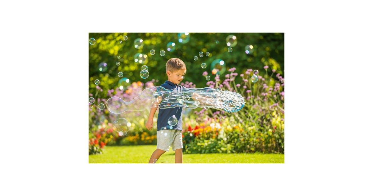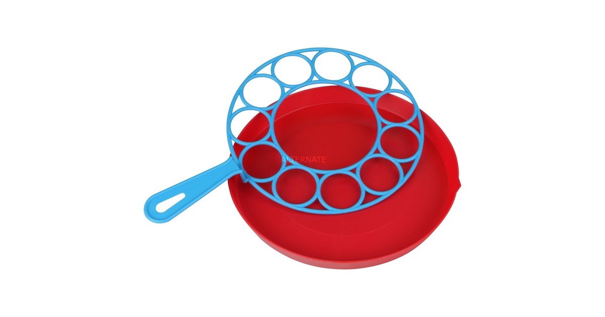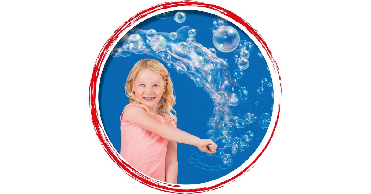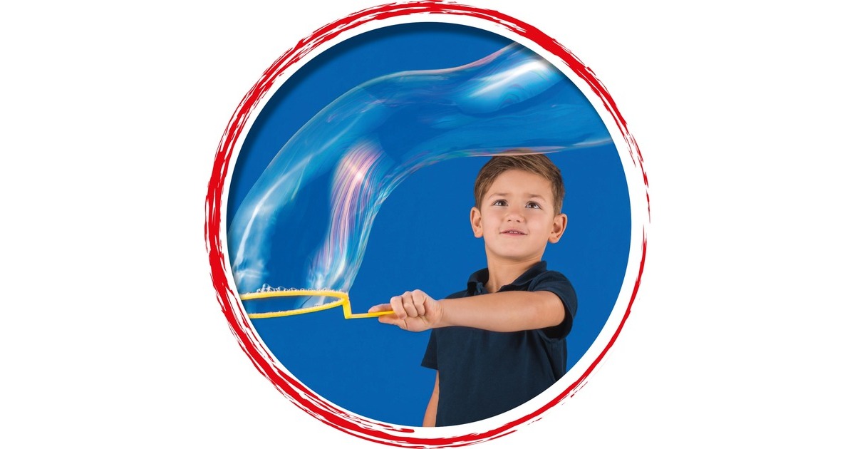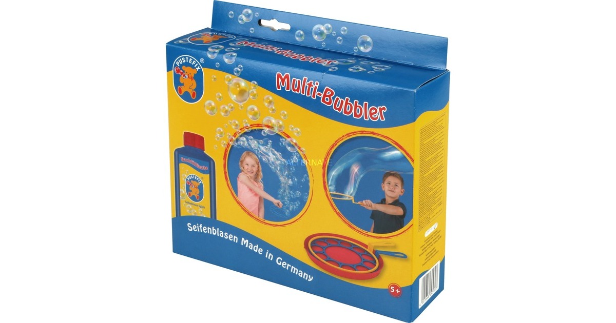 Der Multi-Bubbler ist die Attraktion auf jedem Kindergeburtstag! Mit dem großen, gelben Ring lassen sich riesige Seifenblasen erzeugen - der kleinere blaue Ring ergänzt sie mit kleineren Elementen. So entstehen tolle, schwebende Skulpturen. Mit im Set ist ein Teller für die Flüssigkeit und eine Flasche Seifenblasenflüssigkeit mit 250 ml Inhalt.Art.-Nr.: 1551063