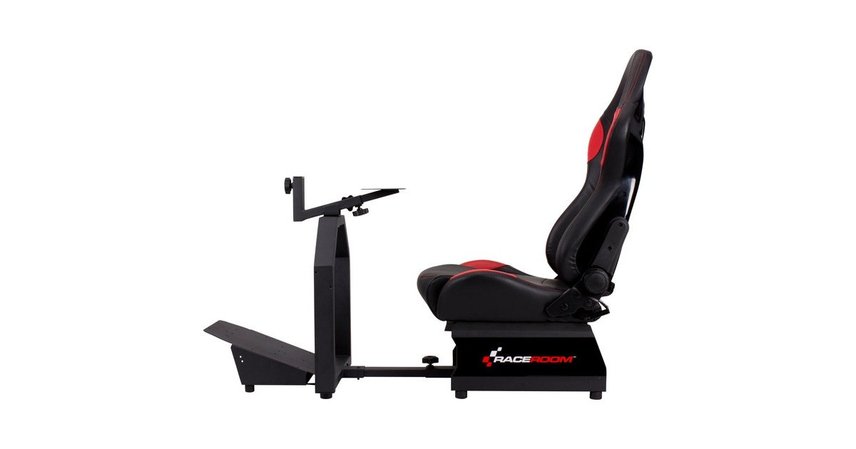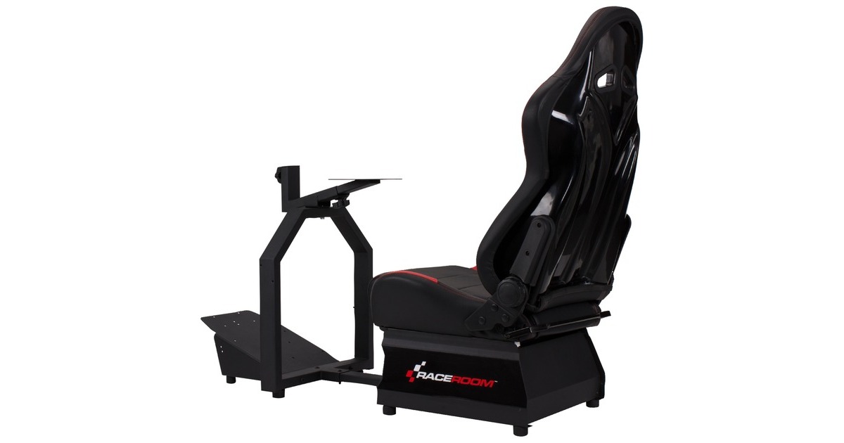 Stufenlos verstellbarer Sportsitz mit Kunstleder-Bezug mit ansprechenden RaceRoom-Logos; Verstellbare Lenkradhalterung; Ergonomisch optimierte Pedalauflage; Rahmen stufenlos in der Länge verstellbar |