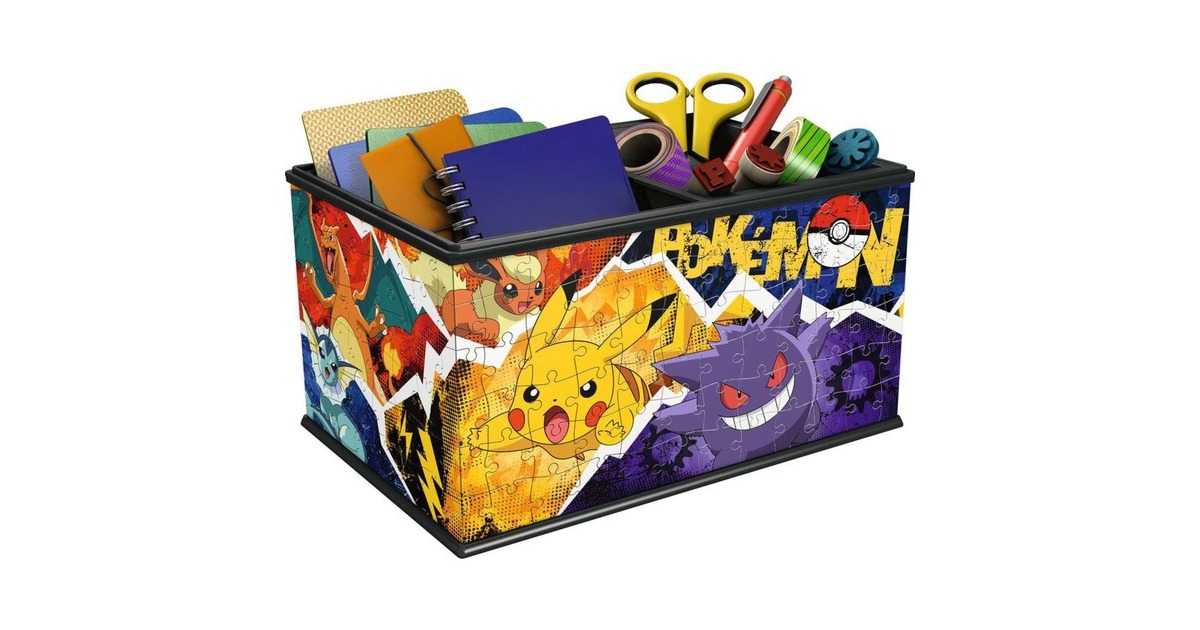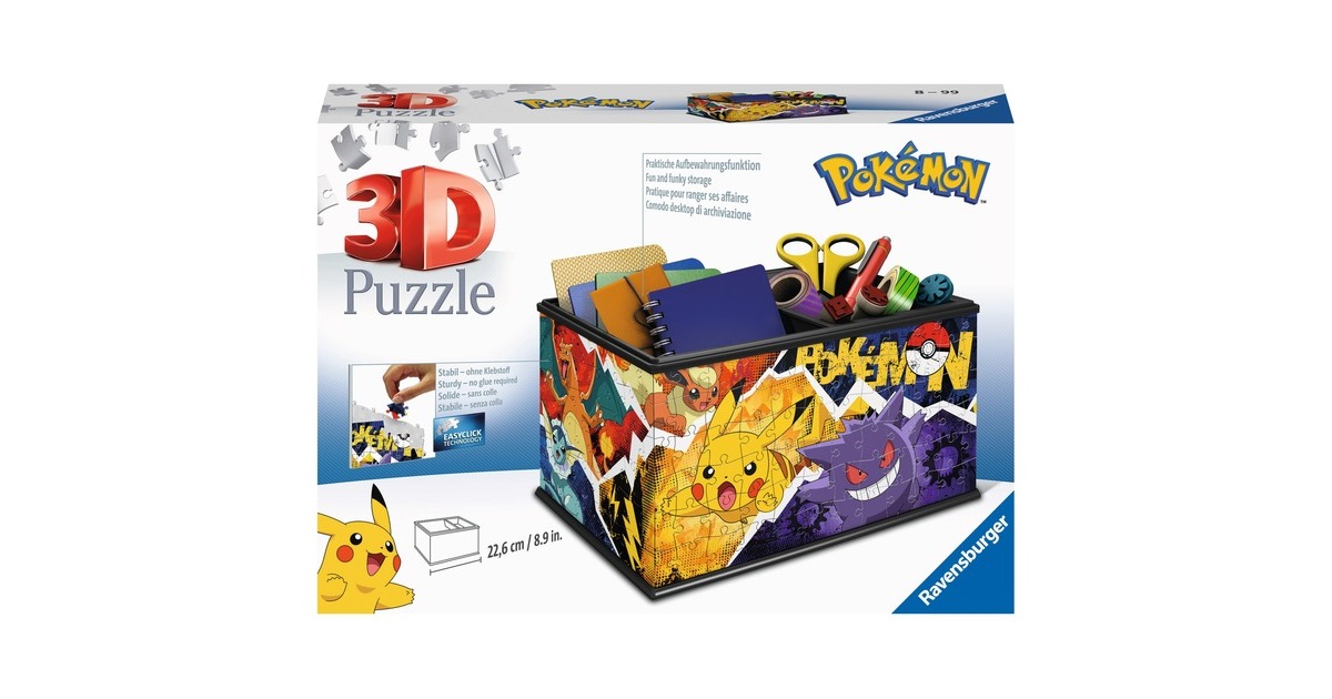 Ein Muss für alle Pokémon Fans, die gerne Puzzeln und Platz für Ihren Krims-Krams suchen! Diese Box im Pokémon Design ist der Hingucker in jedem Kinderzimmer und bietet Platz für wahre Schätze. Die Truhe besteht aus 216 individuell geformten Puzzleteilen und macht schon beim Zusammenbauen richtig viel Spaß. Teil für Teil nimmt die geräumige Aufbewahrungsbox ihre Gestalt an und man taucht ab in die grenzenlose Pokémon Welt. Wer dabei einmal durcheinander kommt, ist mit einem Blick auf die bebilderte Aufbauanleitung schnell wieder auf dem richtigen Weg. Die stabilen 3D Puzzleteile sind teilweise knickbar und für ein leichteres Zusammensetzen nummeriert. So vergeht die Puzzlezeit wie im Flug und schon bald steht die Box als Hingucker in deinem Zimmer. Eine spielerische Konzentrationsübung für Anfänger sowie für Puzzleprofis – dank der Kunststoff-Zubehörteile ist die Aufbewahrungsbox absolut stabil und so richtig geräumig.Art.-Nr.: 1895189