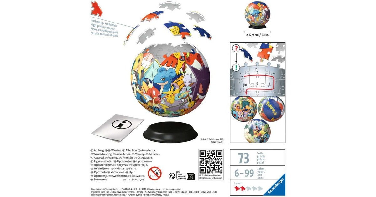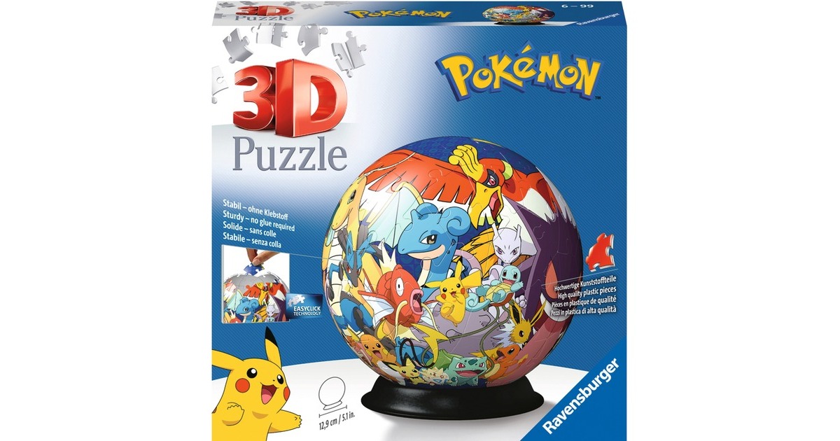 Pokémon Fans aufgepasst! Die beliebtesten Pokémon gibt es jetzt auf einem Ravensburger 3D Puzzle-Ball! Dieser dreidimensionale Puzzle-Ball ist die perfekte Dekoration für das Zimmer von allen Pokémon Fans. Neben Pikachu gibt es noch viele weitere kleine und große Pokémons auf dem Puzzle-Ball zu entdecken. Das sorgt für den ultimativen Puzzlespaß. Aus gewölbten Kunststoff-Puzzleteilen, die dank Easyclick Technology perfekt zusammen passen, entsteht Stück für Stück dieser stabile 3D Puzzle-Ball, ganz ohne Kleben. Die Nummerierung der Teile auf der Rückseite erleichtert das Vorsortieren und ermöglicht einfaches Puzzeln nach Zahlen.Art.-Nr.: 1716087