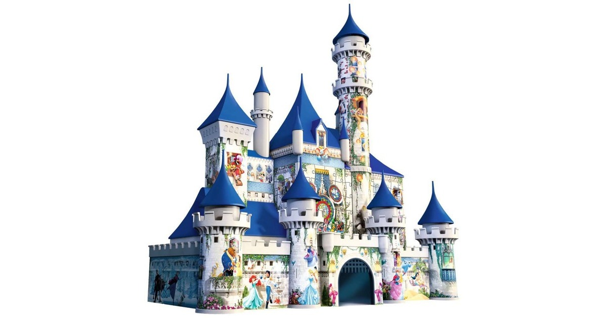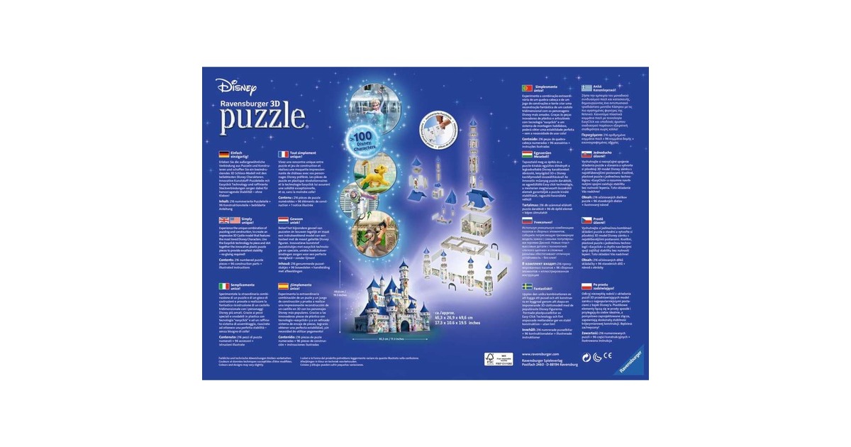 Ravensburger 3D Puzzle „Disney Schloss“ – ein magischer Besuch in einer zauberhaften Welt: Vom Balkon winken Micky Maus und Goofy. Und dort drüben schwimmt Nemo! Auch das süße Bambi, die lustigen Dalmatiner und Mowgli aus dem „Dschungelbuch“ sind mit von der Partie. Lassen Sie sich mit dem Ravensburger 3D Puzzle „Disney Schloss“ in die märchenhafte Welt von Disney entführen! Auf dem liebevoll gestalteten 3D Puzzle-Schloss entdecken Puzzler ab 12 Jahren mehr als 100 der beliebtesten Disney-Helden. Mit seinen Maßen von 45 x 27 x 50 cm ist dieses Meisterwerk nicht nur riesig, sondern dank tollem und detailreichem Design auch ein echter Hingucker. Doch bevor dieses Highlight bewundert werden kann, wird es erst einmal gebaut. Die nummerierten und teils knickbaren Kunststoff-Puzzleteile passen dank Easyclick Technology perfekt ineinander. Gepuzzelt werden kann nach Motiv oder nach Zahlen, und die ausführliche, bebilderte Schritt-für-Schritt-Anleitung sorgt für einen kinderleichten Aufbau. Das Ergebnis ist ein stabiles Bauwerk, das die Herzen aller Disney-Fans höher schlagen lässt. Mit dem Ravensburger 3D Puzzle „Disney-Schloss“ können Sie sich einen Teil des magischen Disney-Flairs nach Hause holen.Art.-Nr.: 1716120