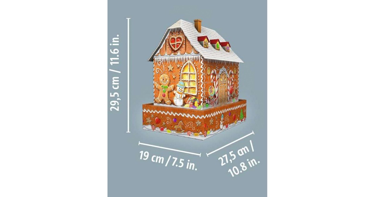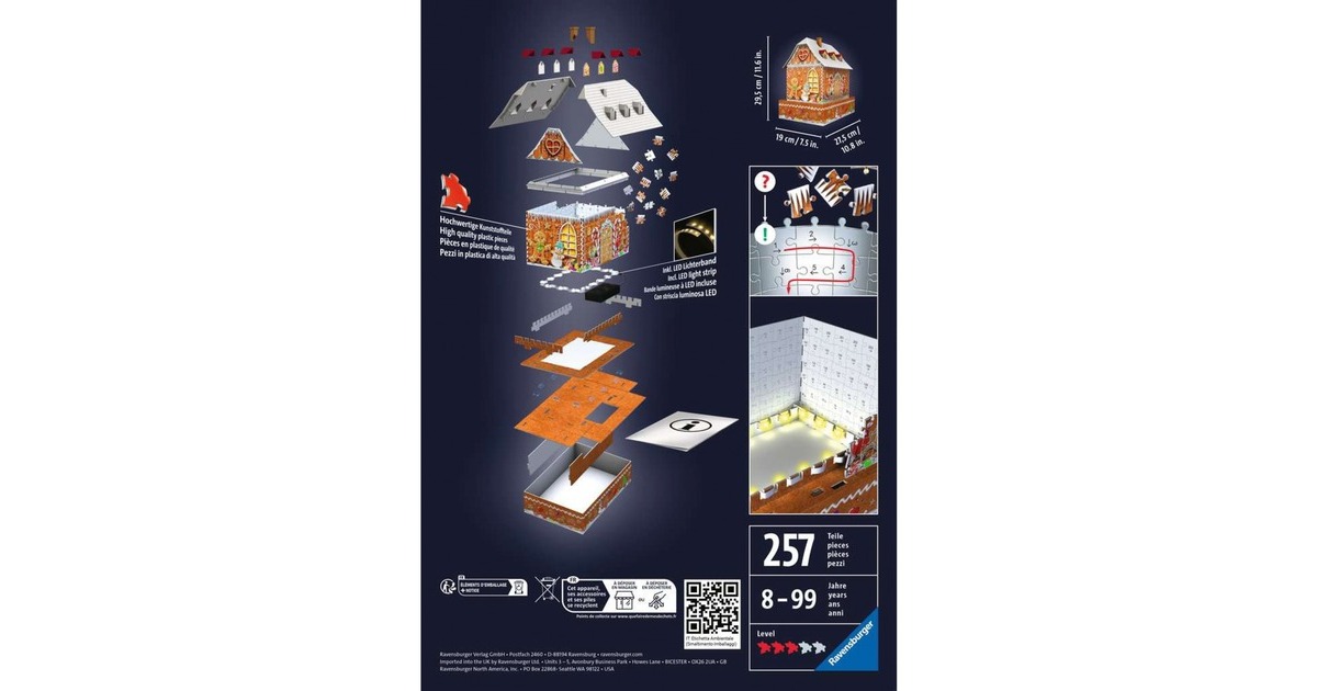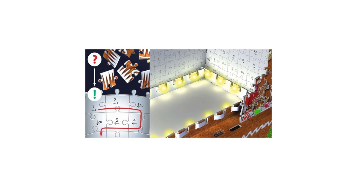 Die Adventszeit steht vor der Tür - da darf ein Lebkuchenhaus neben Plätzchen, Punsch und Lichterketten natürlich nicht fehlen! Das liebevoll gestaltete 3D-Lebkuchenhaus zum zusammenpuzzeln hält unzählige winterliche Details bereit, die es täglich aufs Neue zu entdecken gilt. Und das tolle daran: Die integrierte LED Beleuchtung lässt das süße Häuschen im Dunkeln erstrahlen! Die Freude beginnt bereits beim Bauen, schließlich geht es hier mit stabilen, nummerierten Kunststoff-Puzzleteilen ans Werk, die dank Easyclick Technology perfekt zusammenpassen und in Kombination mit weiteren Zubehörteilen das kunterbunte Lebkuchenhaus entstehen lassen. Die ausführliche, bebilderte Schritt-für-Schritt-Anleitung sorgt dabei für unbeschwertes bauen. Los geht's!Art.-Nr.: 1629360