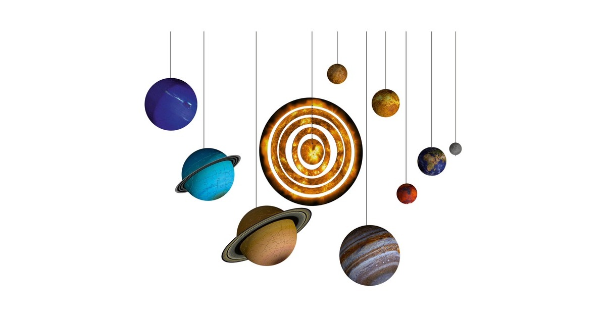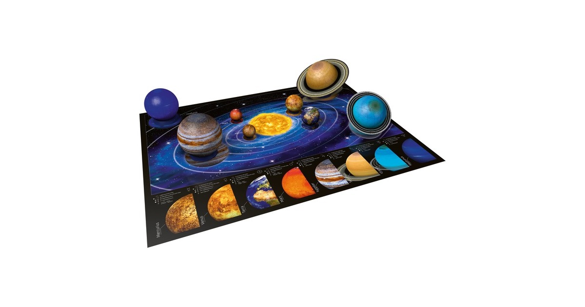 Das 3D-Puzzle Planetensystem macht mit seiner reichhaltigen Ausstattung unsere acht Planeten für jeden greif- und erlebbar. Die 3D Puzzle-Ball Planeten unterschiedlicher Teilezahl und Größe passen dank Easyclick Technologie perfekt zusammen und lassen sich ganz einfach zu formstabilen Kugeln puzzeln - ganz ohne Kleben. Mit dem ergänzenden Zubehör können die Planeten dank Nylonschnur entweder im Zimmer aufgehängt oder auf dem beiliegenden Poster aufgestellt und dekoriert werden. Ideal zum Puzzeln, Staunen, Lernen und Dekorieren!Art.-Nr.: 1436540