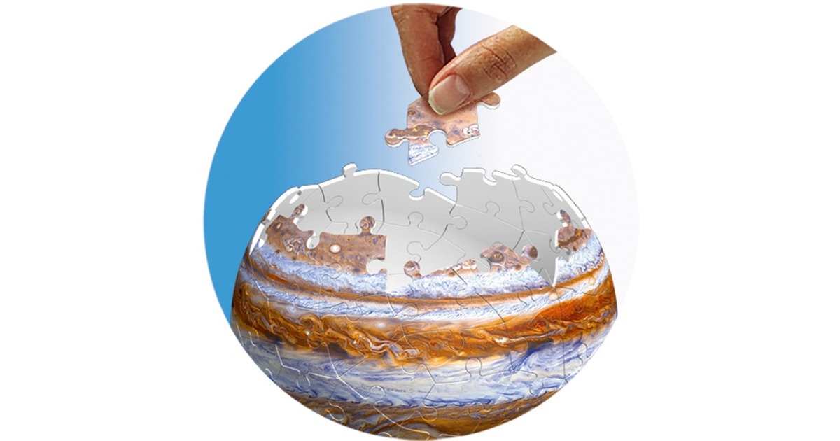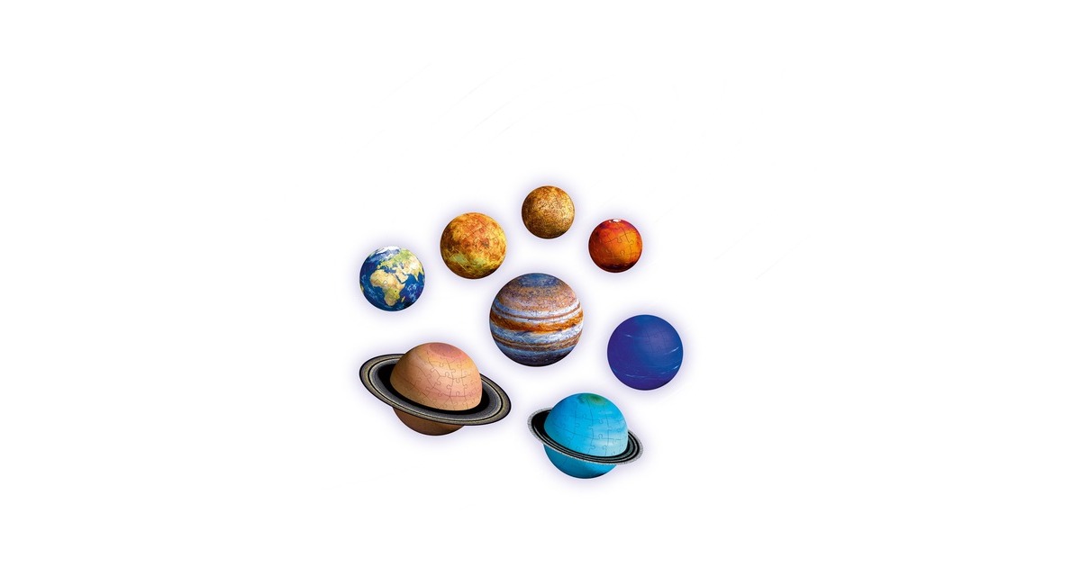 2 Puzzle-Bälle mit je 27 Teilen, 2 Puzzle-Bälle mit je 54 Teilen, 2 Puzzle-Bälle mit je 72 Teilen, 2 Puzzle-Bälle mit je 108 Teilen, Aufsteller, Anleitung und Zubehör inkl. Poster und Nylonschnur zum Dekorieren der Planeten |