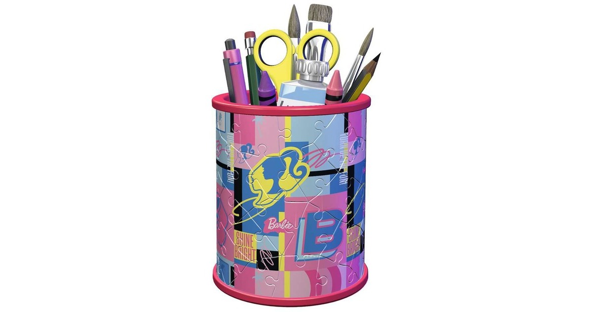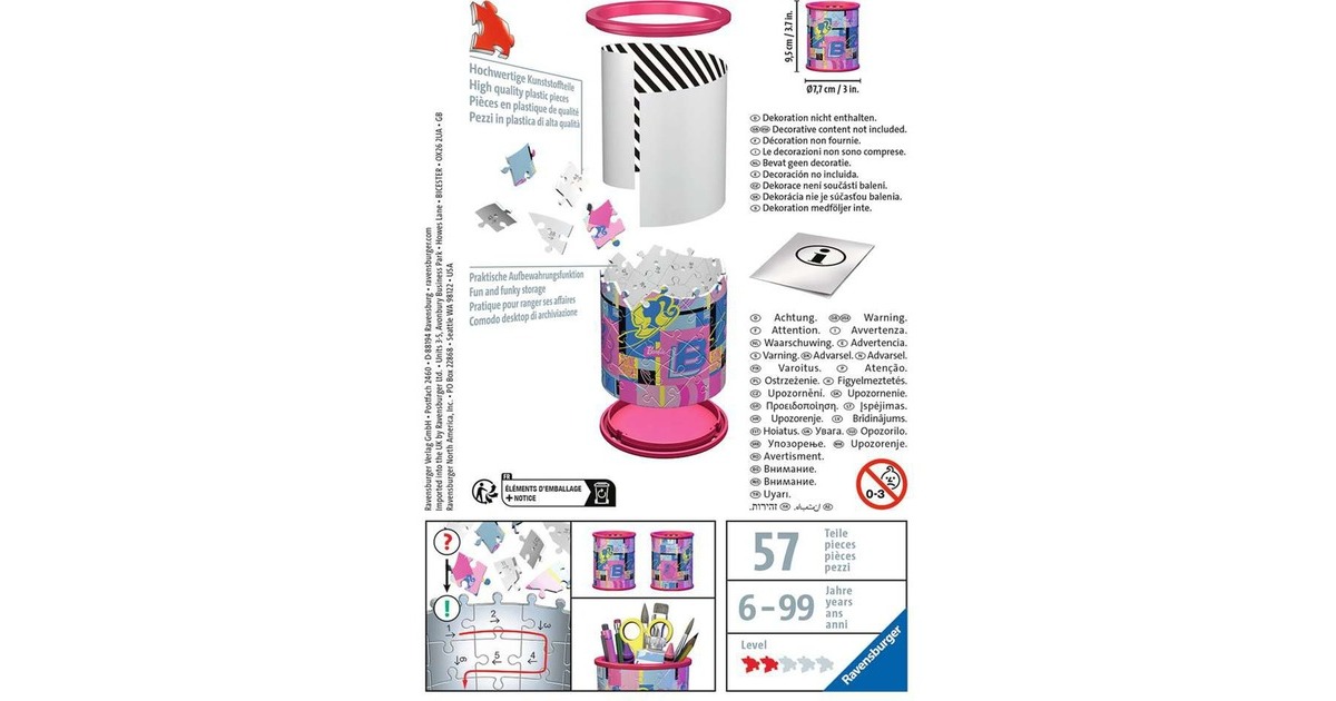 Das Ravensburger 3D Puzzle Utensilo Barbie ist ein äußerst praktisches Produkt. Mit den den Maßen 7,7 x 7,7 x 9,5 cm passt es auf jeden Schreibtisch oder Nachttisch. Es besteht aus 54 Kunststoff-Teilen. Mit der beiliegende, bebilderten Anleitung ist das Zusammenbauen des Puzzles einfach und unkompliziert. Das Utensilo bietet genügend Platz für kleine Gegenstände und ist eine dekorative Aufbewahrungslösung. Durch die hochwertige Qualität von Ravensburger kombiniert dieses Utensilo Langlebigkeit und Puzzlespaß.Art.-Nr.: 100037971