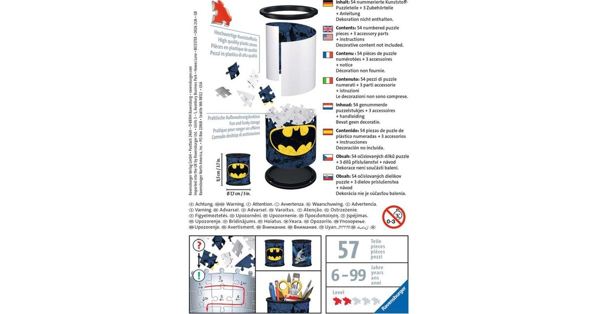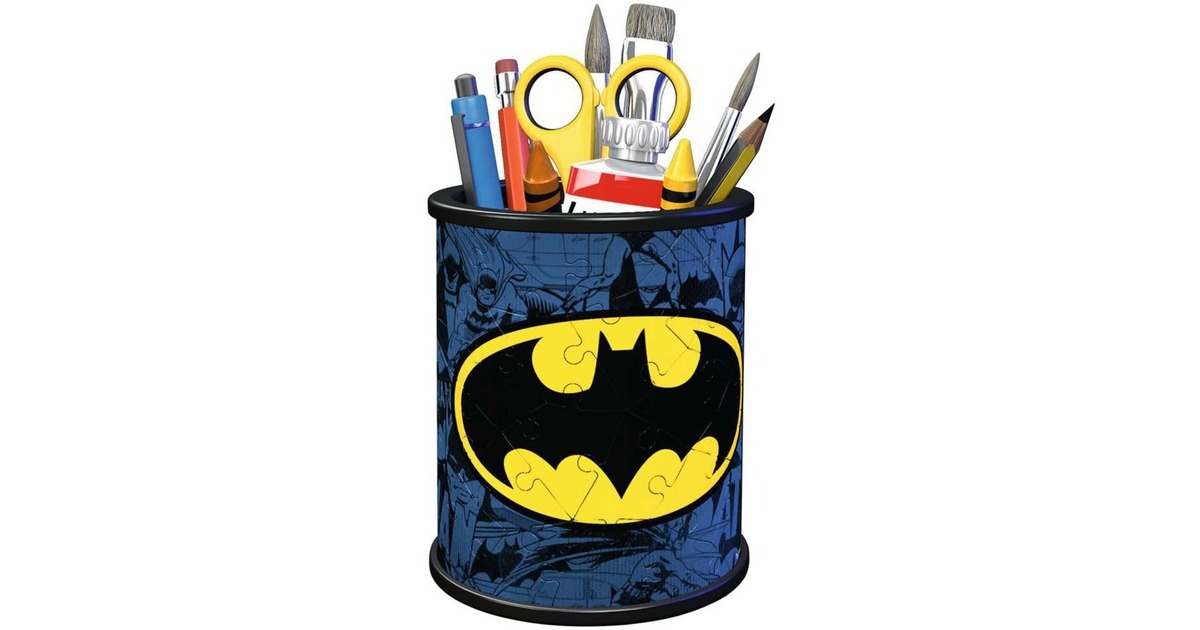 Das 3D Puzzle Utensilo Batman ist nicht nur ein dekorativer Blickfang, sondern leistet auch gute Dienste beim Ordnung halten auf dem Schreibtisch. Die praktische Aufbewahrung für Stifte und andere Kleinteile ist außerdem mit der bebilderten Anleitung und nummerierten Teilen schnell zusammengebaut.Art.-Nr.: 1828592