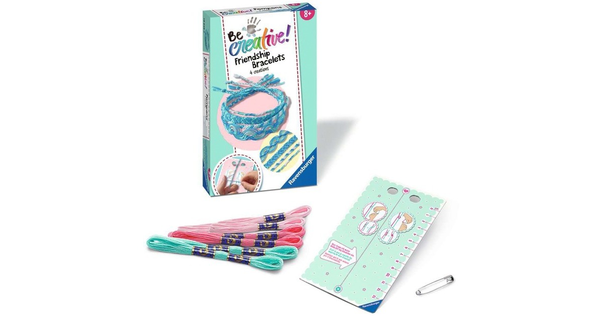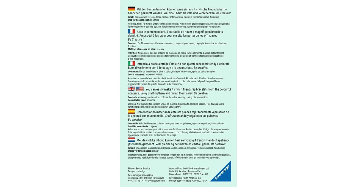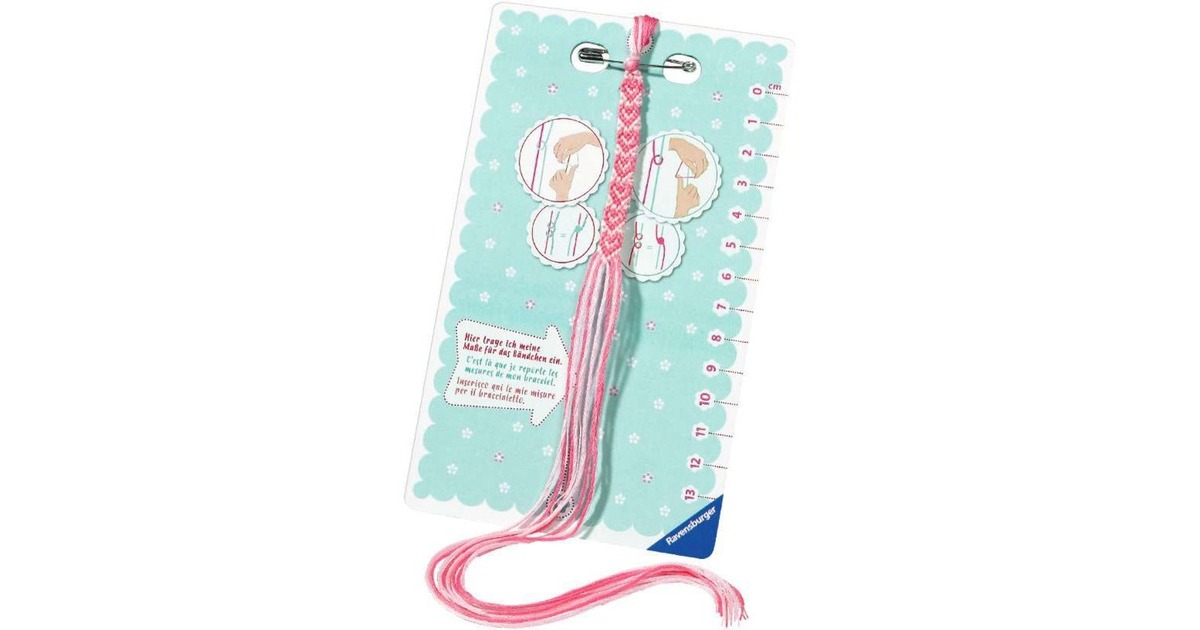 Mit dem Ravensburger BeCreative Set Freundschaftsbändchen können Kinder ab 8 Jahren Armbänder für sich selbst oder Freunde knüpfen. Mit Hilfe der Unterlage zum Knüpfen entstehen ganz einfach vier verschiedene Freundschaftsbändchen, die durch 3 verschiedenfarbige Garne individuell gestaltet werden können. Die beigelegte Anleitung ermöglicht den Jungen und Mädchen verschiedene Arten des Knüpfens zu erlernen und auszuprobieren. Der Kreativität sind dabei keine Grenzen gesetzt.Art.-Nr.: 1894778