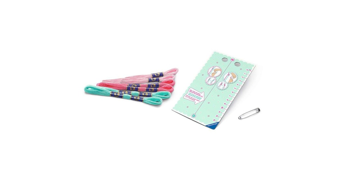 Um gleichmäßige Ergebnisse zu erzielen, liegt eine Unterlage zum Knüpfen bei und eine Sicherheitsnadel kann für Korrekturen oder kompliziertere Knüpfmuster eingesetzt werden. |