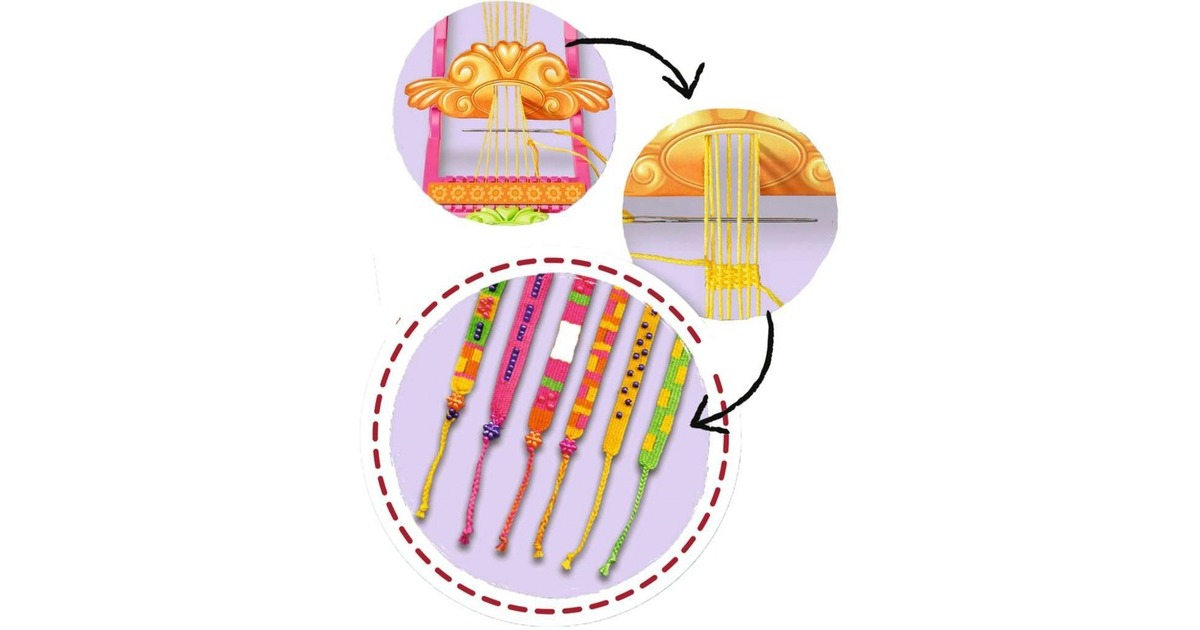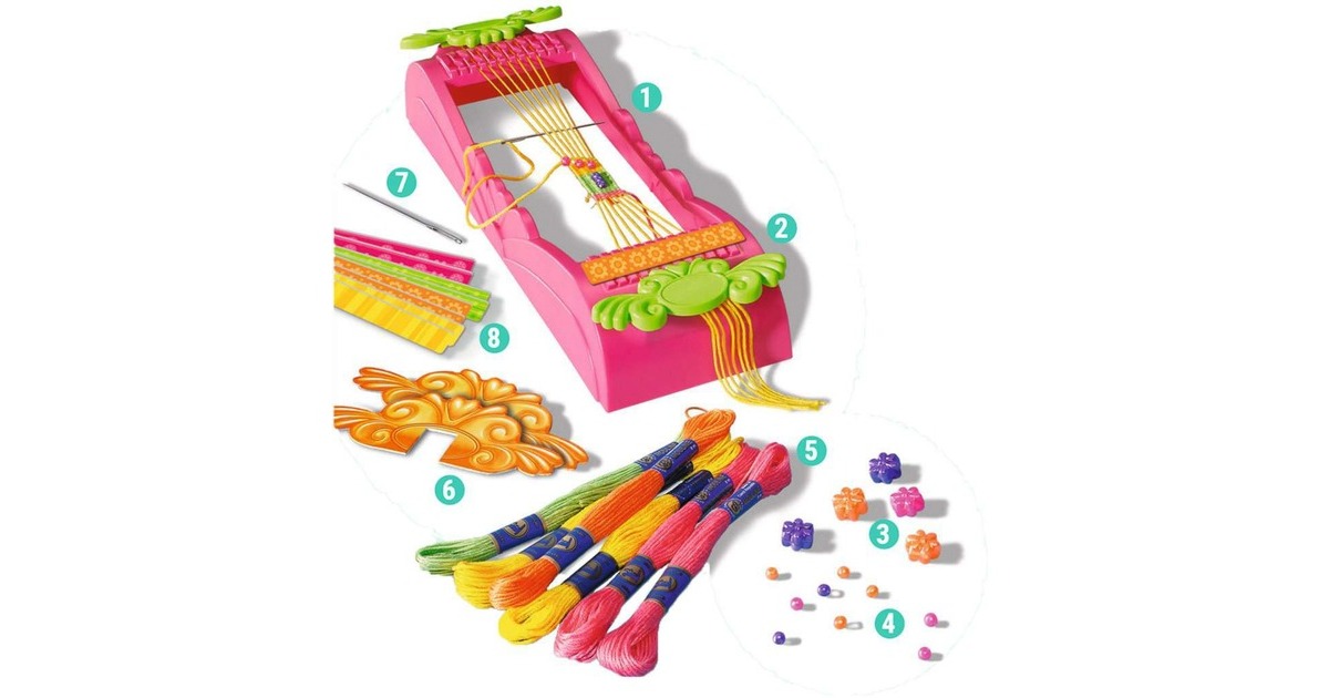 Webrahmen, 2 Fadenklemmen, 9 Schmuckperlen, 100 Perlen, 48 Meter Garn in 4 Farben, 2 Webhilfen, 1 stumpfe Nadel, 8 Fixierstreifen, Anleitung |