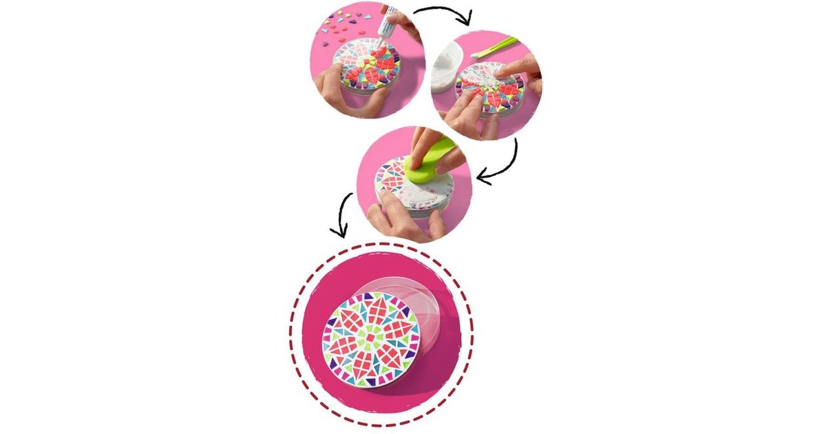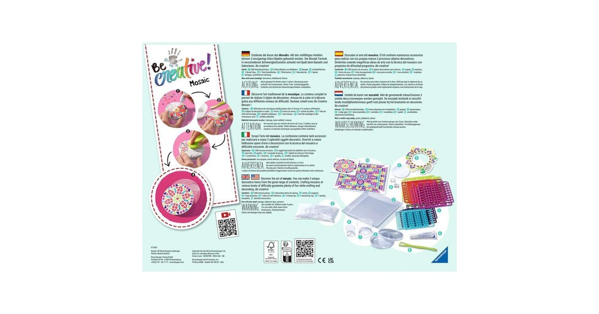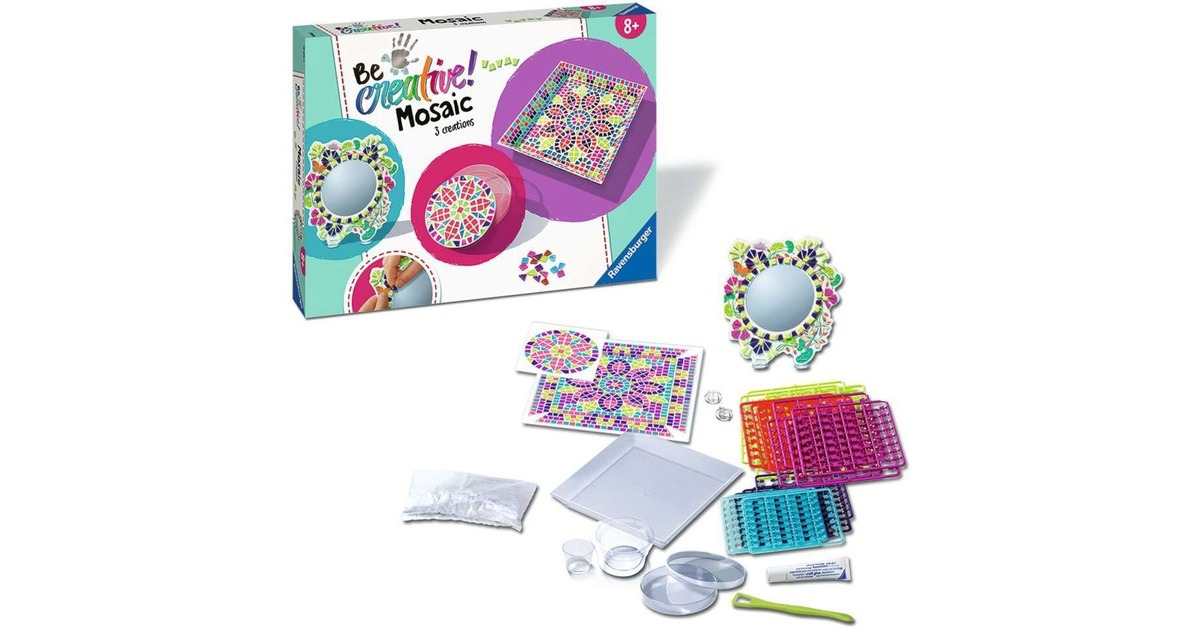 Mit diesem BeCreative Bastelset von Ravensburger können bunte Mosaikkunstwerke gebastelt werden. Bereits Kinder ab 8 Jahren werden mit der Schritt für Schritt-Anleitung kreativ und lassen so tolle Deko-Objekte entstehen. Als Vorlagen sind ein Spiegelrahmen, eine Schmuckdose und ein Tablett enthalten. Viel Spaß beim Basteln und Dekorieren!Art.-Nr.: 1894785