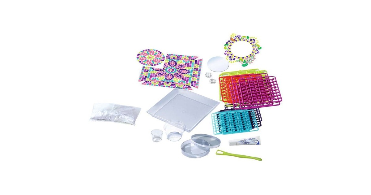 1300 Mosaiksteinchen, 3 Deko-Objekte zum Bekleben, 1 Beutel Gips, 1 Tube Bastelkleber, 1 Rührbecher, 1 Messbecher, 1 Spatel, Vorlagen, ausführliche Anleitung |